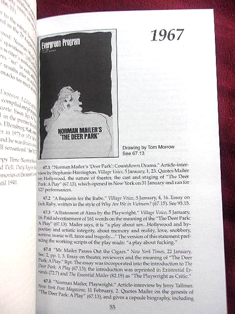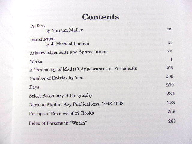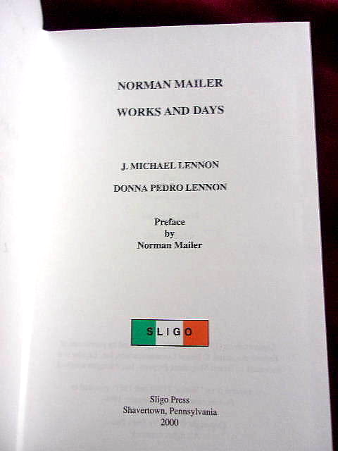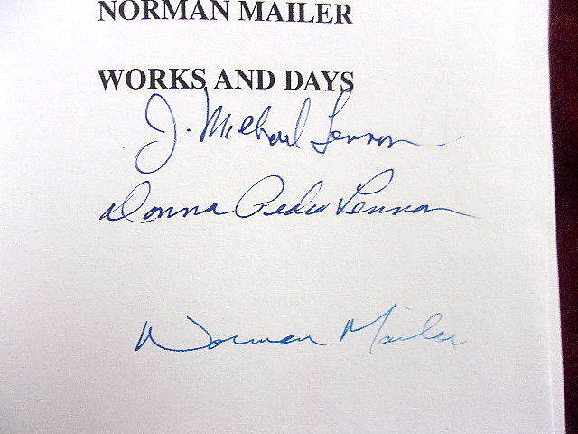 NORMAN MAILER, WORKS AND DAYS by J. Michael Lennon and Donna Pedro Lennon, with a preface by Norman Mailer. Signed by all three . From the year 2000, the definitive bibliography of all books and all appearances in English-language periodicals by one of the 20th-century's most influential writers. The text features includes over 1,100 chronological entries and also includes a brief illustrated biography of Mailer. The book was issued in one small edition. There were 490 cloth-bound copies. Of these, 80 were signed by the Lennons. An additional 35 copies were bound in leather and signed by the Lennons and by Mailer himself. 26 of the leather copies were hand-lettered A-Z. Just 9 of the triple-signed leather copies were marked "presentation" and were not available for sale but given as gifts. The copy for sale is one of the nine presentation copies, making it the rarest version of Norman Mailer's rarest boo k. I find only one other presentation copy for sale online, for $750.00. The book is in excellent condition, only very minor signs of use, no flaws. Measures 6.25" X 9.25", xvi + 280 pages, illustrated. The three signatures appear on the second page. Ships promptly & securely.