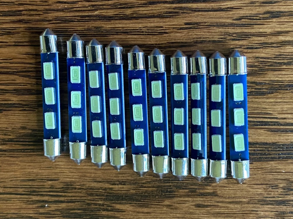 Up for sale here is this set of 10 new 6.3v 43mm snap-in cool blue LED festoon lamps. These are perfect for replacing any of the 41mm festoon lamps found in vintage gear, usually in the Fisher tube receivers like the 400, 500B, 500C, 600, 800B, and 800C. These are 43mm long and will fit nicely in the old holders. LEDs run cooler, last almost forever, and draw much less current than the old incandescent bulbs. These are brand new bulbs and are guaranteed to work great for you. Specs: Voltage: 6.3v AC/DC Current Draw: 70mA Color: Cool Blue Length: 43mm Diameter: 6mm Polarity: Non-polar Please see my pictures for details. US shipping and handling is $5, and international is $18, no matter what quantity you buy. All my small parts are set up for combined shipping, so just use the "add to cart" feature and then check out all at once, and it will combine shipping. If you have any questions, please ask. Looking for more parts? I have power switches , feet , pushbuttons , top case screws , bottom screws , faceplate screws , white LED fuse lamps , blue LED fuse lamps , 6.3v bi-pin bulbs , 8v bi-pin bulbs , 12v bi-pin bulbs , wired 8v 60ma bulbs , new power cords , new main capacitors for the Marantz 1060/2230 , wired Pioneer speaker plug replacements , new 630v yellow film capacitors at 30 different values , a large variety of transistors for vintage stereo repair, new Wima film capacitors for stereo repair , new 250v yellow film crossover capacitors, and more. Just use "add to cart" on everything you want and then check out for combined shipping.