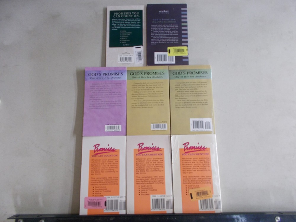 This lot of books includes: 13 copies of "The Bible Promise Book" We purchase our books for resale so most of them will have old price stickers on the back cover. We do our best to give an honest description of any damage to the books, but what we sell are used books and we have no idea the history of the books. When we list a set of books they are boxed and sent to our warehouse to await sale and shipment. It is not cost effective for us to bring them back to our office and sell just part of a set.