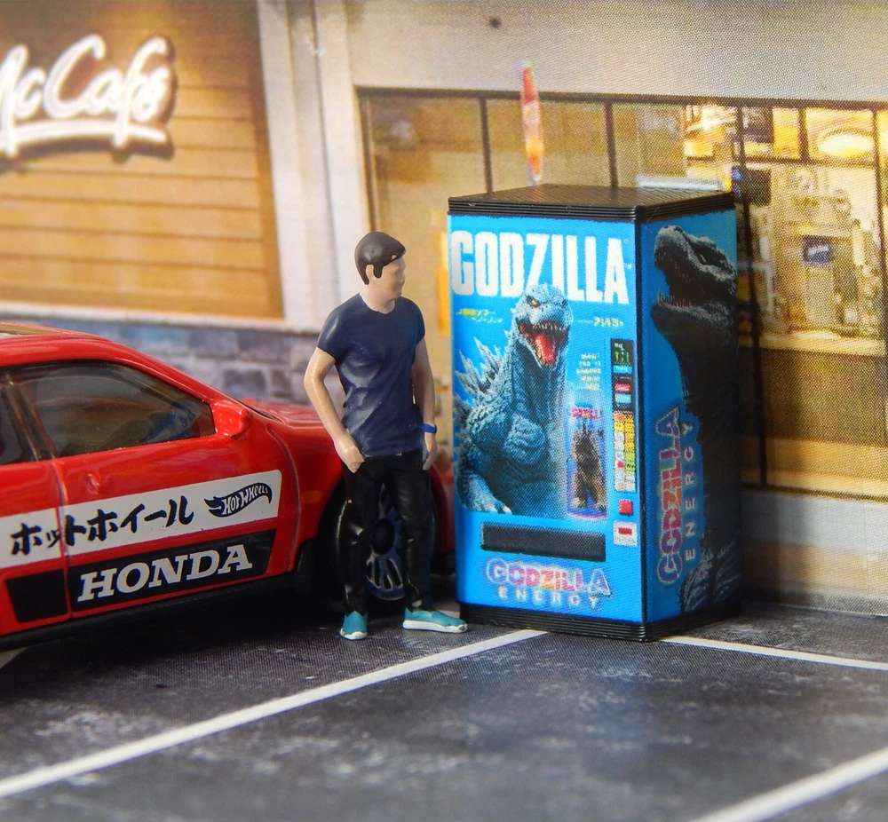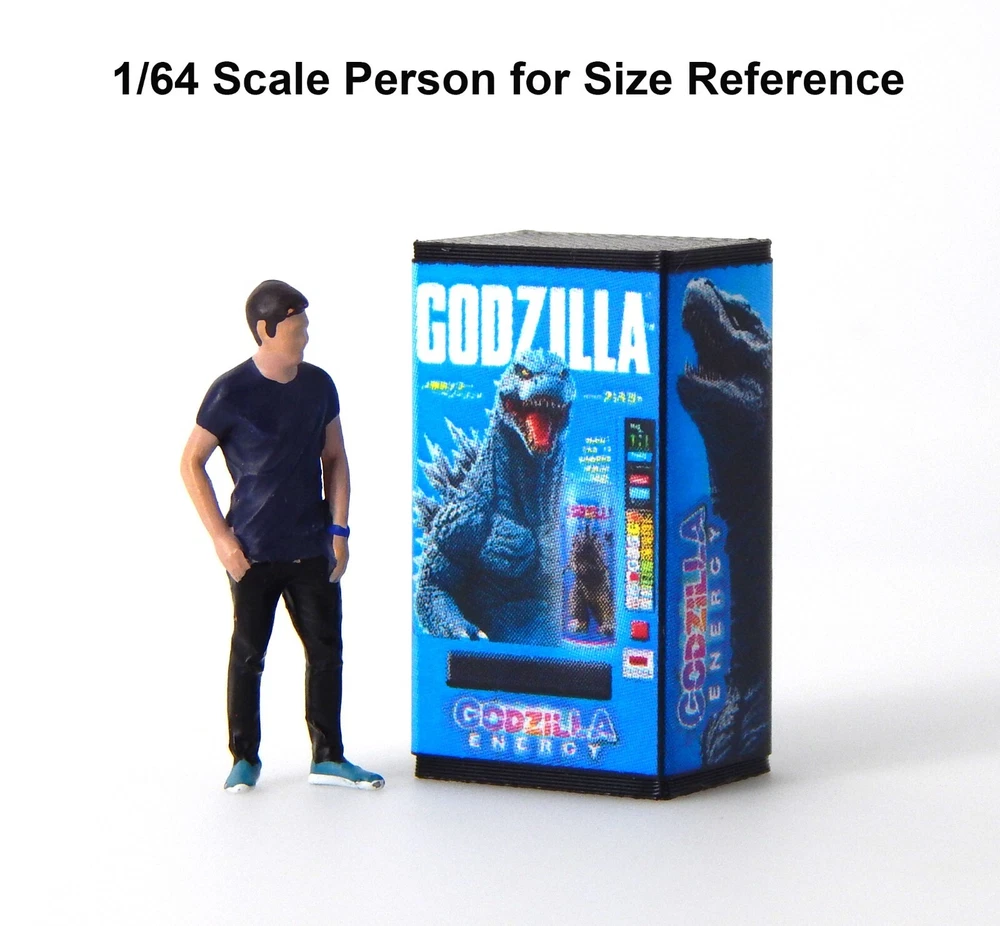 1/64 Scale Vending Machine. 29mm height x 16mm width x 11mm depth. Handcrafted from plastic and custom designed glossy sticker. This drink was a limited edition energy drink originally released in 2021. Reimagined as a vending machine for y'all Godzilla fans! Pair it with the Godzilla Hotwheels cars or any Japan Import for a truly Japanese diorama.