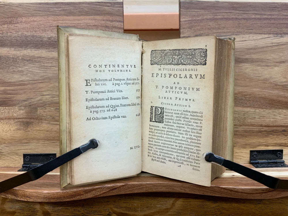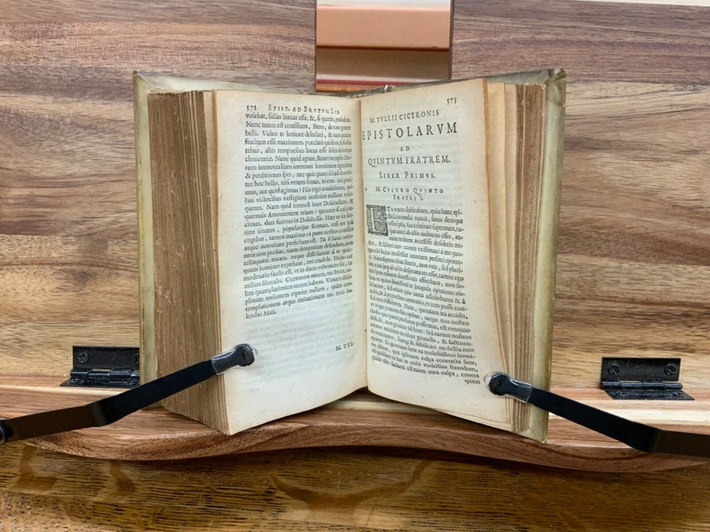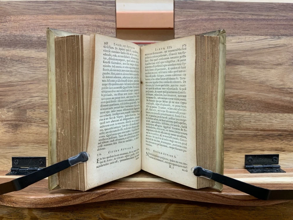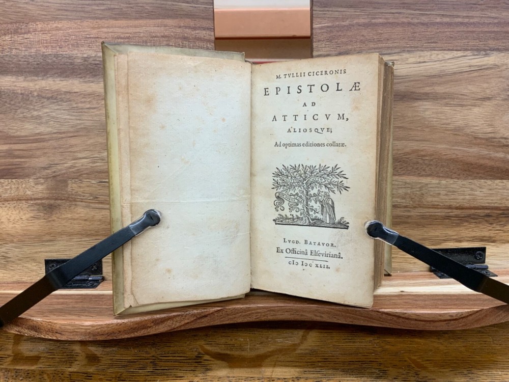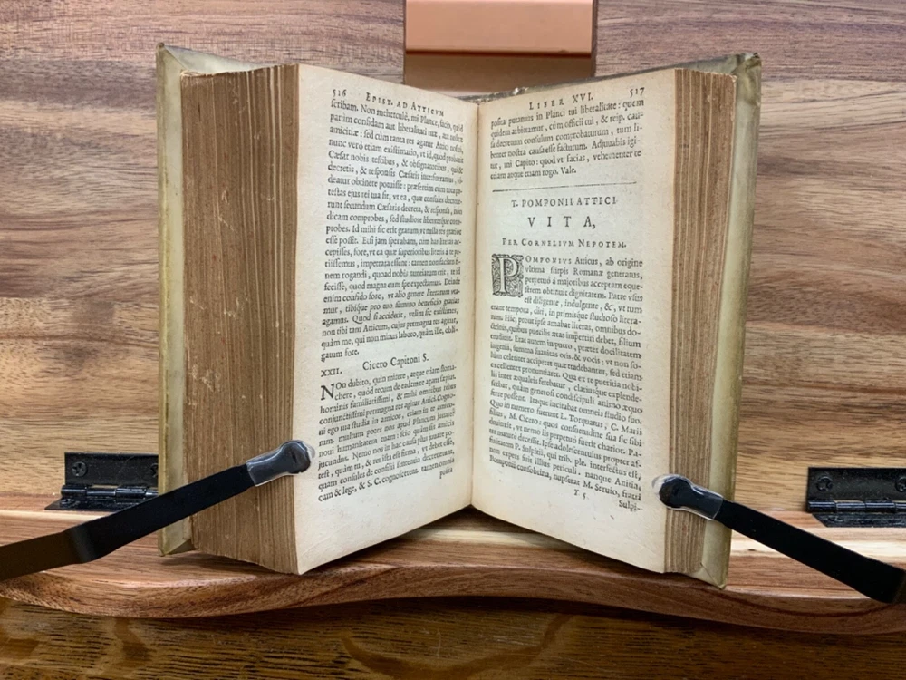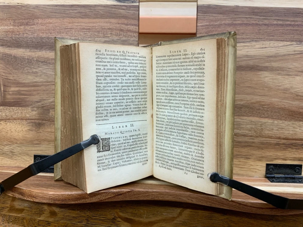 M. Tullii Ciceronis Epistolæ ad Atticum, Aliosque; Ad optimas editiones collatæ. Lugd. Batauor. Ex Officina Ezeviriana. 1642, Original vellum binding, Printer's device, 685 pp, 5 x 3", 32mo. ***Please Note: Page 240 skips to 245 - however, collation is complete (twelve leaves per signature) & this work contains no plates, therefore this is a presumed complete work. In fair condition. Vellum boards scuffed at edges and bumped at corners. Head and tail of spine bumped. Black painted lettering at head of spine bright and clean. General shelf-wear to boards causing light soiling. Previous ownership signature exhibited at top edge of front end-page. Toning around edges of leaves throughout text-block. Some light instances of age or finger-staining. Some instances of exposed cording throughout text-block. Binding is intact. Please see photos. Elzevir is the name of a family of Dutch booksellers, publishers, and printers of the 17th and early 18th centuries. The duodecimo series of "Elzevirs" became very famous and very desirable among bibliophiles (like ourselves), who sought to obtain the tallest and freshest copies of these books. Although it appears the family was involved with the book trade as early as the 16th century, it is only known for its work in some detail beginning with Lodewijk Elzevir. The fame of the Elzevir editions rests chiefly on the works issued by the firm of Bonaventura and Abraham Elzevir. Their Greek and Hebrew impressions are considered inferior to those of the Aldines and the Estiennes, but their small editions in 12mo, 16mo, and 24mo, for their elegance of design, neatness, clearness, regularity of type, and beauty of paper, cannot be surpassed. A clean & attractive Elzevir printing of Cicero's works in Latin. Gift quality! RAREE1642DLOB 03/24 - HK1364