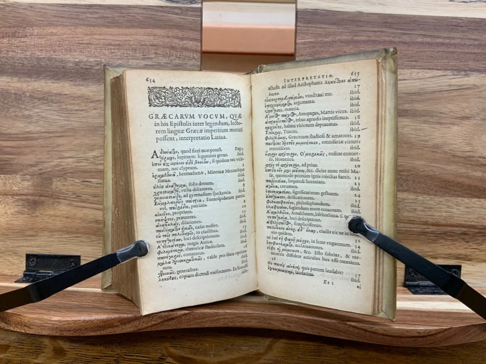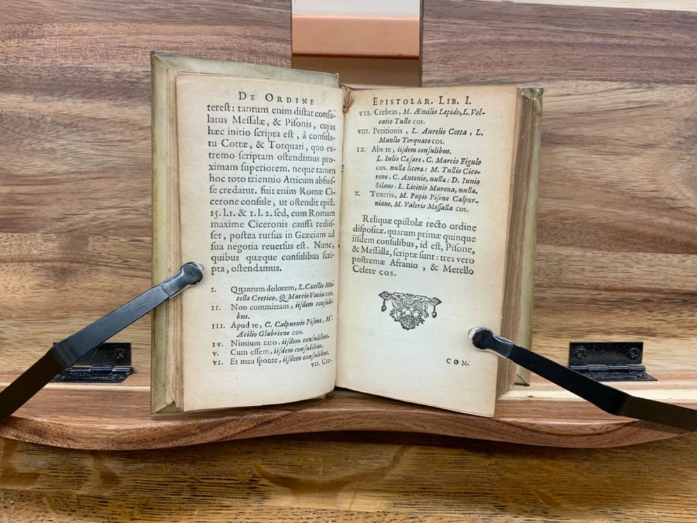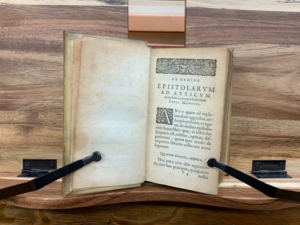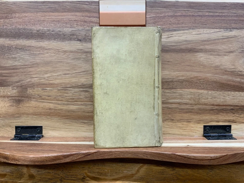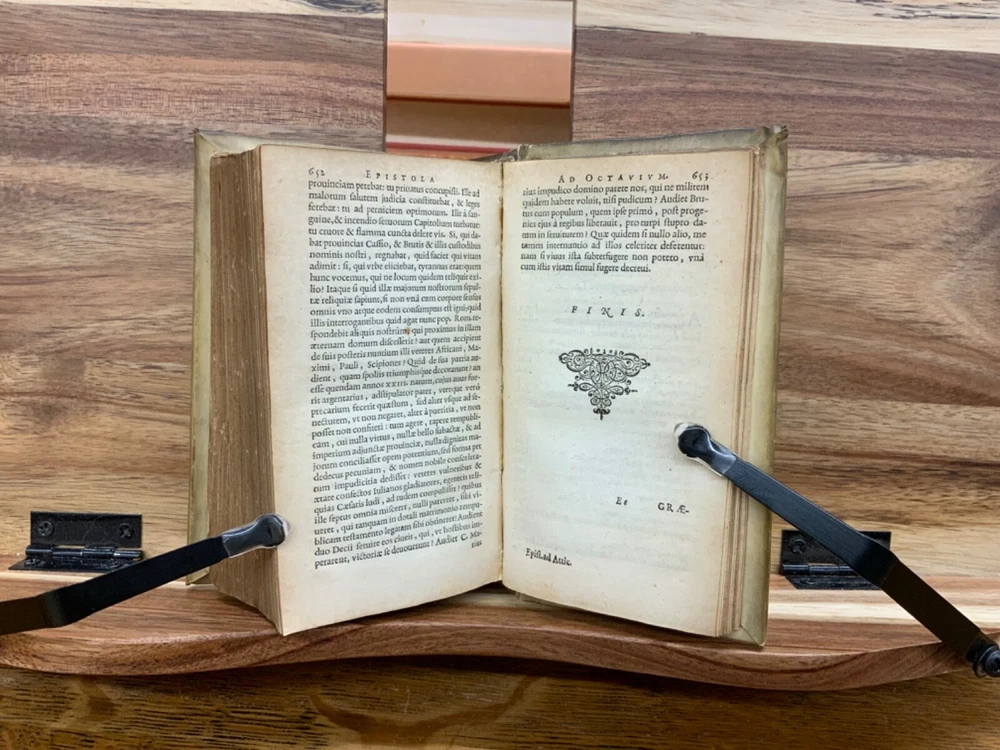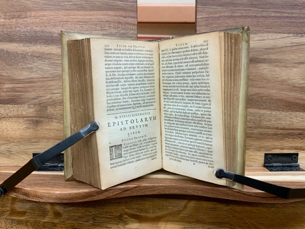 M. Tullii Ciceronis Epistolæ ad Atticum, Aliosque; Ad optimas editiones collatæ. Lugd. Batauor. Ex Officina Ezeviriana. 1642, Original vellum binding, Printer's device, 685 pp, 5 x 3", 32mo. ***Please Note: Page 240 skips to 245 - however, collation is complete (twelve leaves per signature) & this work contains no plates, therefore this is a presumed complete work. In fair condition. Vellum boards scuffed at edges and bumped at corners. Head and tail of spine bumped. Black painted lettering at head of spine bright and clean. General shelf-wear to boards causing light soiling. Previous ownership signature exhibited at top edge of front end-page. Toning around edges of leaves throughout text-block. Some light instances of age or finger-staining. Some instances of exposed cording throughout text-block. Binding is intact. Please see photos. Elzevir is the name of a family of Dutch booksellers, publishers, and printers of the 17th and early 18th centuries. The duodecimo series of "Elzevirs" became very famous and very desirable among bibliophiles (like ourselves), who sought to obtain the tallest and freshest copies of these books. Although it appears the family was involved with the book trade as early as the 16th century, it is only known for its work in some detail beginning with Lodewijk Elzevir. The fame of the Elzevir editions rests chiefly on the works issued by the firm of Bonaventura and Abraham Elzevir. Their Greek and Hebrew impressions are considered inferior to those of the Aldines and the Estiennes, but their small editions in 12mo, 16mo, and 24mo, for their elegance of design, neatness, clearness, regularity of type, and beauty of paper, cannot be surpassed. A clean & attractive Elzevir printing of Cicero's works in Latin. Gift quality! RAREE1642DLOB 03/24 - HK1364