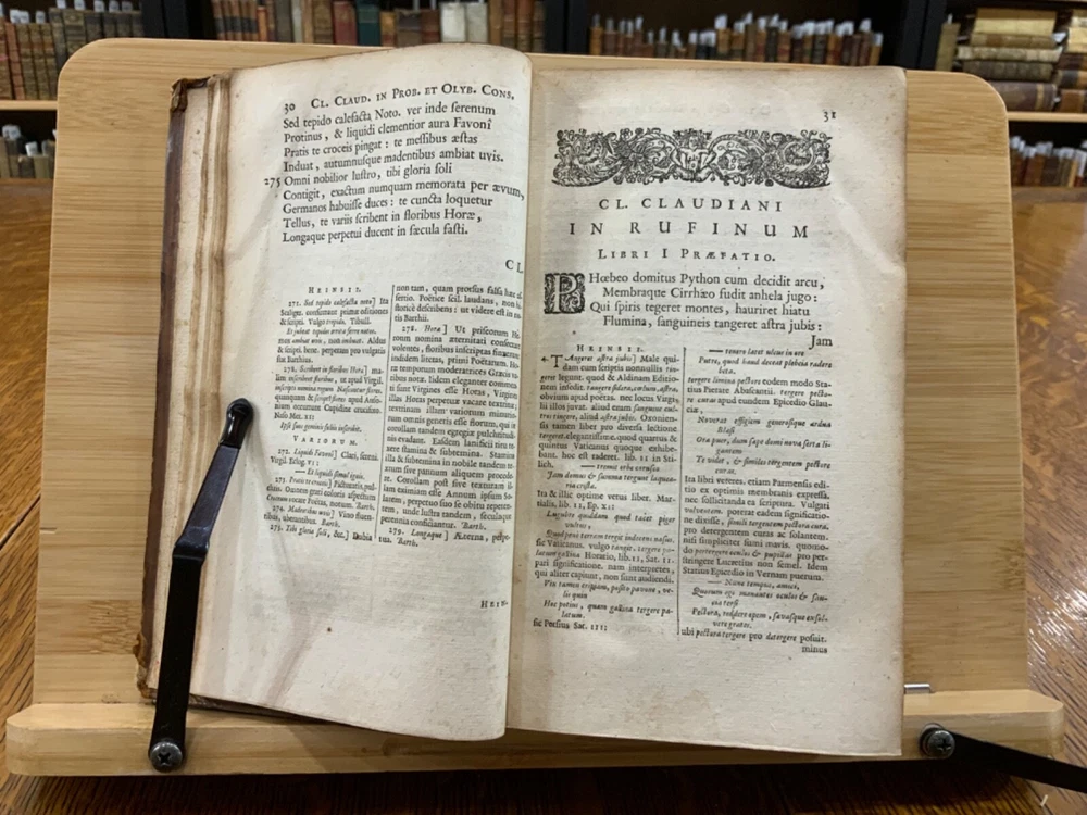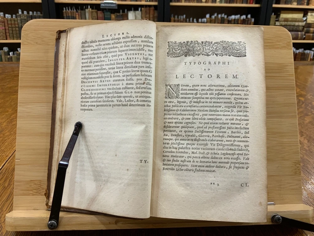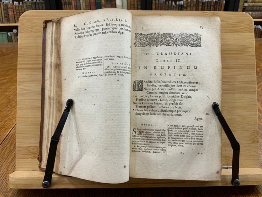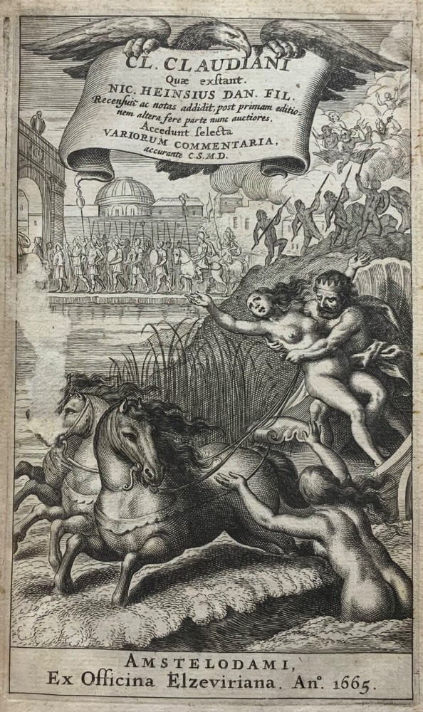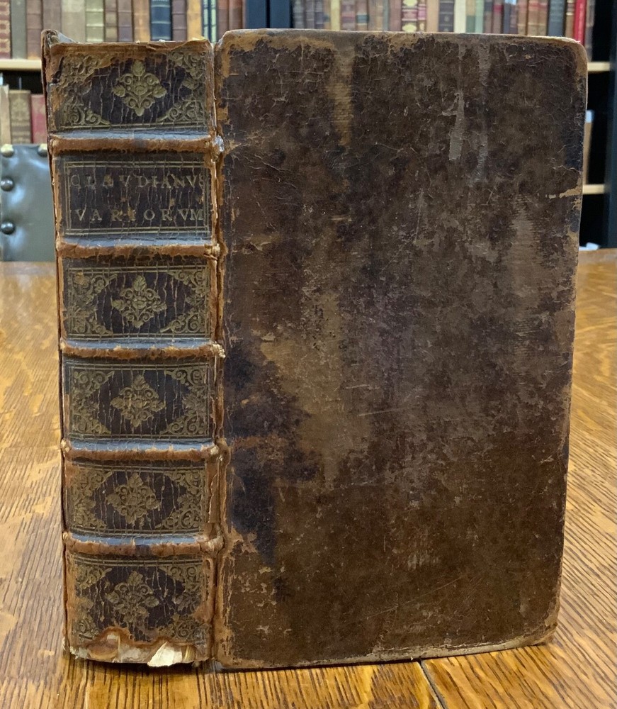 Cl. Claudiani. Quæ exstant. Nic. Heinsius dan. fil. Recensuit ac notas addidit, post priman editionem altera fere parte nunc auctiores. Accedunt Selecta Variorum Commentaria, accurante C. S. M. D. Amstelodami, Ex Officina Elzeviriana. An'o. 1665. xxviii, 917 p [xv] p, 8 x 4.75", 8vo. In fair condition. Front and rear hinges cracked. Full leather boards scuffed at edges and worn/bumped at corners. Head and tail of spine lacking (including headbands). Spine exhibits desiccation. Title label intact; gilt lettering and deco dulled and soiled, but attractive. Previous ownership bookplate found on front paste-down: "Edward Davenport." Front gutter split at engraved title page, cording exposed. Normal to light toning throughout text-block, with some instances of light age-satining. Small water or tea dampness stain found at fore-edges of pages 34 through 234. Old-hand ink marginalia found on rear paste-down. Binding intact; hinges cracked. Please see photos and ask questions, if any, before purchasing. Elzevir is the name of a family of Dutch booksellers, publishers, and printers of the 17th and early 18th centuries. The duodecimo series of "Elzevirs" became very famous and very desirable among bibliophiles (like ourselves), who sought to obtain the tallest and freshest copies of these books. Although it appears the family was involved with the book trade as early as the 16th century, it is only known for its work in some detail beginning with Lodewijk Elzevir. The fame of the Elzevir editions rests chiefly on the works issued by the firm of Bonaventura and Abraham Elzevir. Their Greek and Hebrew impressions are considered inferior to those of the Aldines and the Estiennes, but their small editions in 12mo, 16mo, and 24mo, for their elegance of design, neatness, clearness, regularity of type, and beauty of paper, cannot be surpassed. Daniel Elzevir (1626-1680) published this work in his lifetime. Claudius Claudianus , known in English as Claudian (Greek: Κλαυδιανός; c. 370 – c. 404 AD), was a Latin poet associated with the court of the Roman emperor Honorius at Mediolanum (Milan), and particularly with the general Stilicho . His work, written almost entirely in hexameters or elegiac couplets, falls into three main categories: poems for Honorius, poems for Stilicho, and mythological epic . Claudian wrote during an exciting time in history, and his works reflect the era. During his lifetime, Arcadius and Honorius, the weak sons of the last sole Roman emperor, Theodosius I, became weak puppets of strong generals and government ministers. Theodosius fought a fierce and bloody battle in 394 against the forces of the usurper Eugenius at the River Frigidus in which both Alaric the Visigoth and the master general Flavius Stilicho led imperial troops to victory. Claudian is considered by many to have been the last great poet of the ancient world. Nicolaas Heinsius the Elder (Latin: Nicolaus Heinsius; 1620 – 1681) was a Dutch classical scholar, poet and diplomat. He is regarded as a brilliant text critic in his critical publications of Claudian , Ovid (his most important work), Vergil, Prudentius, Velleius and Valerius Flaccus. Heinsius was appointed the official historian of the City of Amsterdam the same year this book was printed. He was also the owner of one of the largest private libraries in Europe and over13,000 volumes were sold by his estate after his death in 1681. RAREE1665DKLX 09/24 - HK2125
