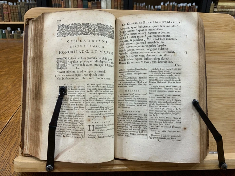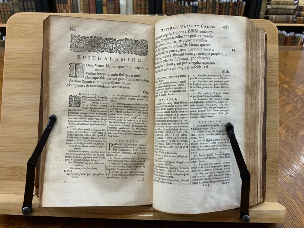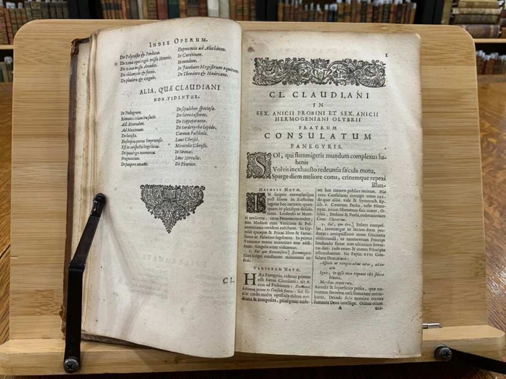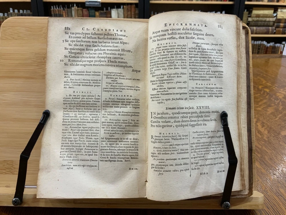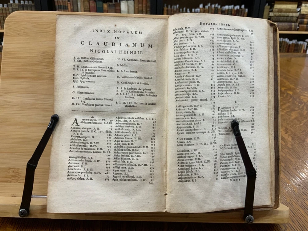 Cl. Claudiani. Quæ exstant. Nic. Heinsius dan. fil. Recensuit ac notas addidit, post priman editionem altera fere parte nunc auctiores. Accedunt Selecta Variorum Commentaria, accurante C. S. M. D. Amstelodami, Ex Officina Elzeviriana. An'o. 1665. xxviii, 917 p [xv] p, 8 x 4.75", 8vo. In fair condition. Front and rear hinges cracked. Full leather boards scuffed at edges and worn/bumped at corners. Head and tail of spine lacking (including headbands). Spine exhibits desiccation. Title label intact; gilt lettering and deco dulled and soiled, but attractive. Previous ownership bookplate found on front paste-down: "Edward Davenport." Front gutter split at engraved title page, cording exposed. Normal to light toning throughout text-block, with some instances of light age-satining. Small water or tea dampness stain found at fore-edges of pages 34 through 234. Old-hand ink marginalia found on rear paste-down. Binding intact; hinges cracked. Please see photos and ask questions, if any, before purchasing. Elzevir is the name of a family of Dutch booksellers, publishers, and printers of the 17th and early 18th centuries. The duodecimo series of "Elzevirs" became very famous and very desirable among bibliophiles (like ourselves), who sought to obtain the tallest and freshest copies of these books. Although it appears the family was involved with the book trade as early as the 16th century, it is only known for its work in some detail beginning with Lodewijk Elzevir. The fame of the Elzevir editions rests chiefly on the works issued by the firm of Bonaventura and Abraham Elzevir. Their Greek and Hebrew impressions are considered inferior to those of the Aldines and the Estiennes, but their small editions in 12mo, 16mo, and 24mo, for their elegance of design, neatness, clearness, regularity of type, and beauty of paper, cannot be surpassed. Daniel Elzevir (1626-1680) published this work in his lifetime. Claudius Claudianus , known in English as Claudian (Greek: Κλαυδιανός; c. 370 – c. 404 AD), was a Latin poet associated with the court of the Roman emperor Honorius at Mediolanum (Milan), and particularly with the general Stilicho . His work, written almost entirely in hexameters or elegiac couplets, falls into three main categories: poems for Honorius, poems for Stilicho, and mythological epic . Claudian wrote during an exciting time in history, and his works reflect the era. During his lifetime, Arcadius and Honorius, the weak sons of the last sole Roman emperor, Theodosius I, became weak puppets of strong generals and government ministers. Theodosius fought a fierce and bloody battle in 394 against the forces of the usurper Eugenius at the River Frigidus in which both Alaric the Visigoth and the master general Flavius Stilicho led imperial troops to victory. Claudian is considered by many to have been the last great poet of the ancient world. Nicolaas Heinsius the Elder (Latin: Nicolaus Heinsius; 1620 – 1681) was a Dutch classical scholar, poet and diplomat. He is regarded as a brilliant text critic in his critical publications of Claudian , Ovid (his most important work), Vergil, Prudentius, Velleius and Valerius Flaccus. Heinsius was appointed the official historian of the City of Amsterdam the same year this book was printed. He was also the owner of one of the largest private libraries in Europe and over13,000 volumes were sold by his estate after his death in 1681. RAREE1665DKLX 09/24 - HK2125