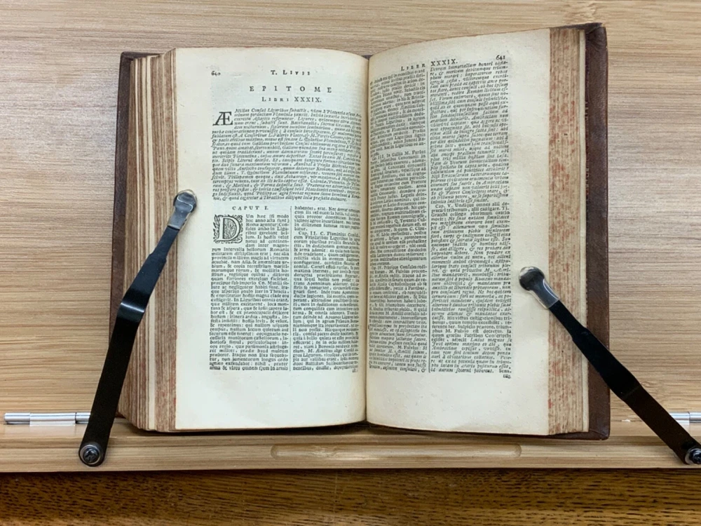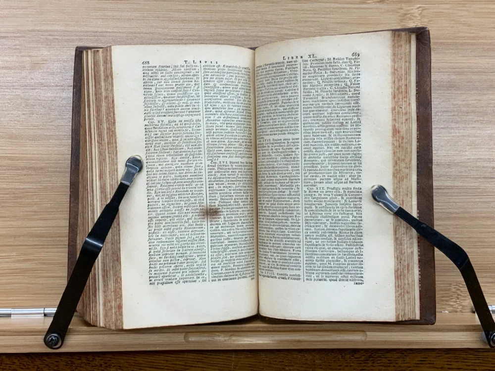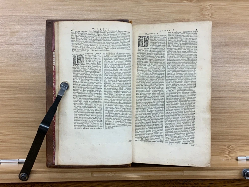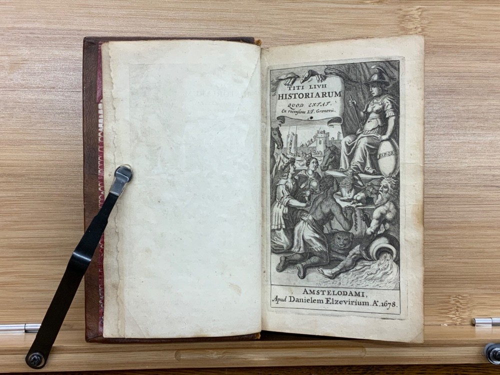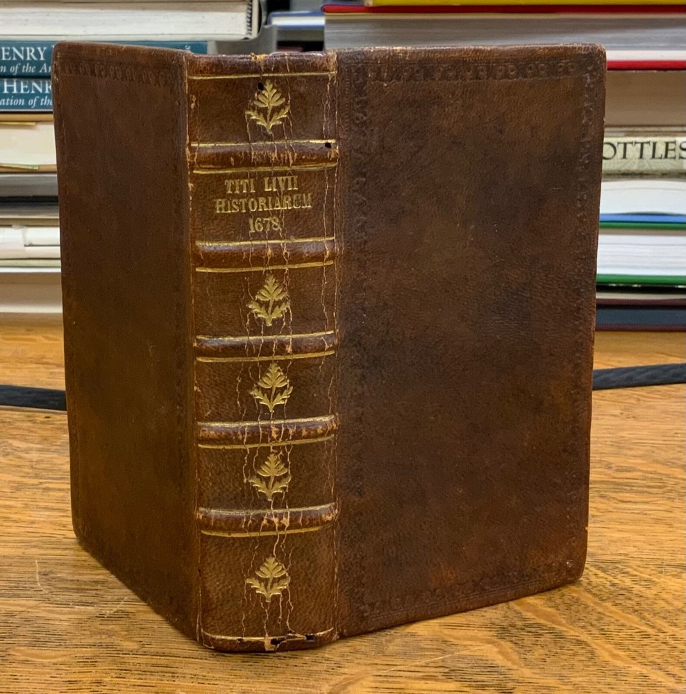 Titi Livii Historiarum, Quod Extat, ex recensione I.F. Gronovii. Amstelodami, Apud Danielem Elzevirium, 1678, First Elzevir Edition, early 19th century binding (i.e. not original), 788 pp, 6 x 3.5", 32mo. In good condition. Leather binding scuffed at edges & bumped/worn at corners. Front hinge fragile, but still intact. Head and tail of leather spine rubbed. Gilt lettering, ruling, and deco on spine soiled in some places, but overall bright and clean. All edges speckled. Engraved title page has caused light off-setting to front fly-leaf. Light toning throughout text-block - some instances of finger-soiling or age-stains. No known previous ownership or marginalia. Binding tight and intact. Please see photos. Elzevir is the name of a family of Dutch booksellers, publishers, and printers of the 17th and early 18th centuries. The duodecimo series of "Elzevirs" became very famous and very desirable among bibliophiles (like ourselves), who sought to obtain the tallest and freshest copies of these books. Although it appears the family was involved with the book trade as early as the 16th century, it is only known for its work in some detail beginning with Lodewijk Elzevir. The fame of the Elzevir editions rests chiefly on the works issued by the firm of Bonaventura and Abraham Elzevir. Their Greek and Hebrew impressions are considered inferior to those of the Aldines and the Estiennes, but their small editions in 12mo, 16mo, and 24mo, for their elegance of design, neatness, clearness, regularity of type, and beauty of paper, cannot be surpassed. Daniel Elzevirium was the son of Bonaventura. Titus Livy (59 BC - AD 17), known in English as Livy, was a Roman historian. He wrote a monumental history of Rome and the Roman people title Ab Urbe Condita, covering the period from the earliest legends of Rome before the traditional founding in 753 BC through the reign of Augustus in Livy's own lifetime. RAREE1678CLMB 11/23 - HK917