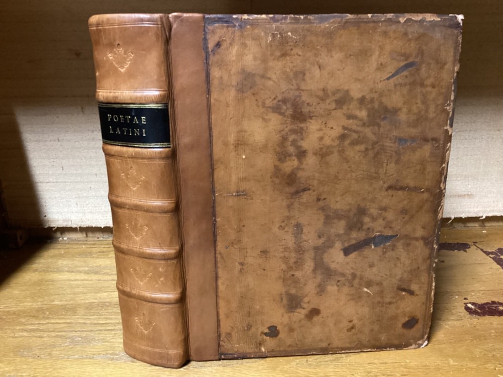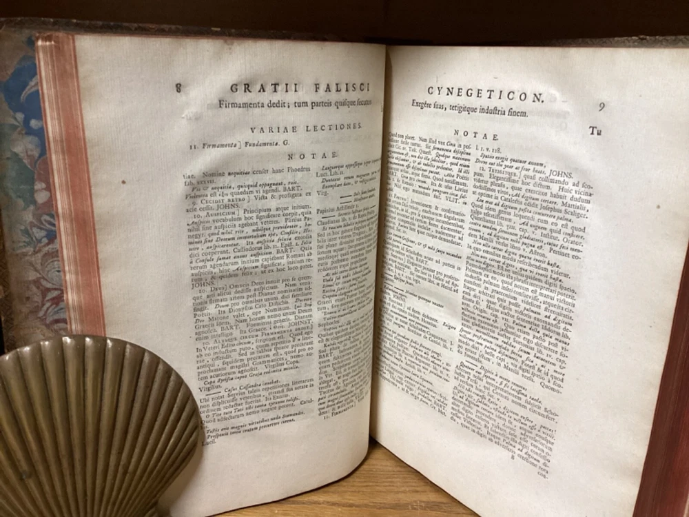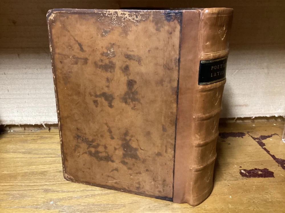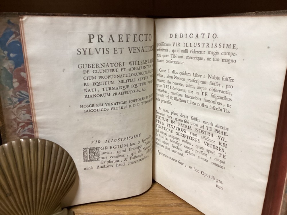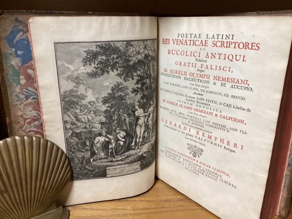 Poetae Latini rei Venaticae Scriptores et Bucolici Antiqui: Videlicet Gratii Falisci, atque M. Aurelii Olympii Nemesiani, Cynegeticon, Halieuticon & de Aucupio. Printed in Leiden and The Hague by Johannem Arnoldum Langerak, et. al. 1728, 583 + 335 pp. 10.25” x 8.25”. Larger octavo. Hardcover rebacked full leather. In good condition, with spine nicely restored. Some rubbing and wear to boards, primarily along edges and corners. Hinges remain in good condition and text block remains nicely bound. Light markings. Beautiful frontispiece illustration adjacent to title page. General age-related toning to pages, along with periodic foxing and wear. Please see photographs and ask any questions prior to purchasing. A scarce and nicely preserved piece on classical Latin poetry dedicated to hunting and country living. COLC1728DHJX