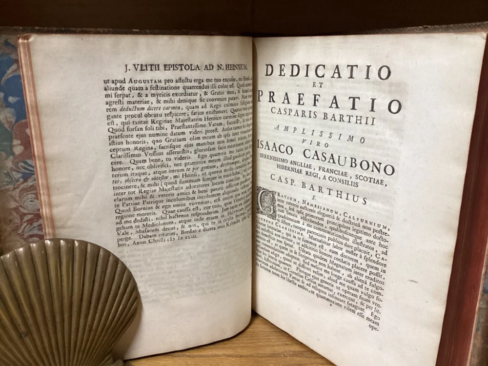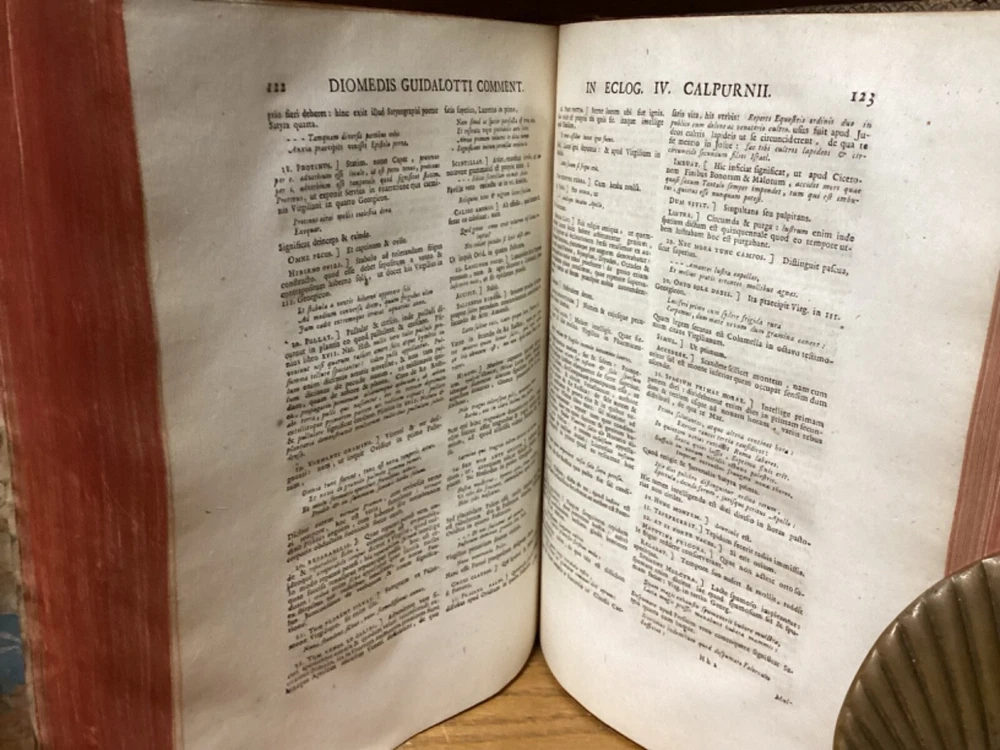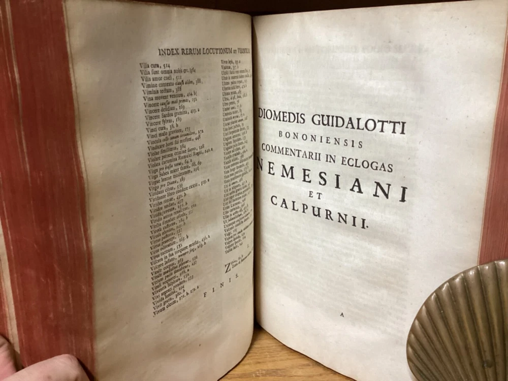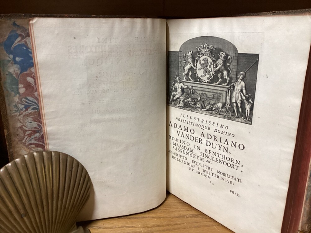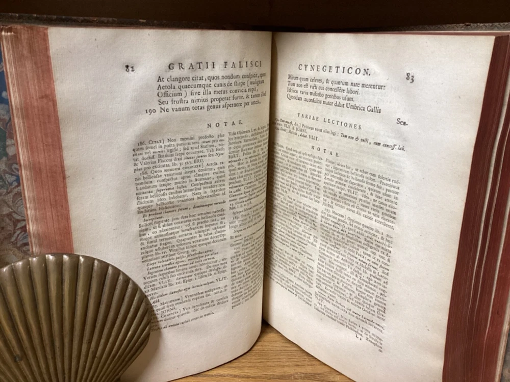 Poetae Latini rei Venaticae Scriptores et Bucolici Antiqui: Videlicet Gratii Falisci, atque M. Aurelii Olympii Nemesiani, Cynegeticon, Halieuticon & de Aucupio. Printed in Leiden and The Hague by Johannem Arnoldum Langerak, et. al. 1728, 583 + 335 pp. 10.25” x 8.25”. Larger octavo. Hardcover rebacked full leather. In good condition, with spine nicely restored. Some rubbing and wear to boards, primarily along edges and corners. Hinges remain in good condition and text block remains nicely bound. Light markings. Beautiful frontispiece illustration adjacent to title page. General age-related toning to pages, along with periodic foxing and wear. Please see photographs and ask any questions prior to purchasing. A scarce and nicely preserved piece on classical Latin poetry dedicated to hunting and country living. COLC1728DHJX