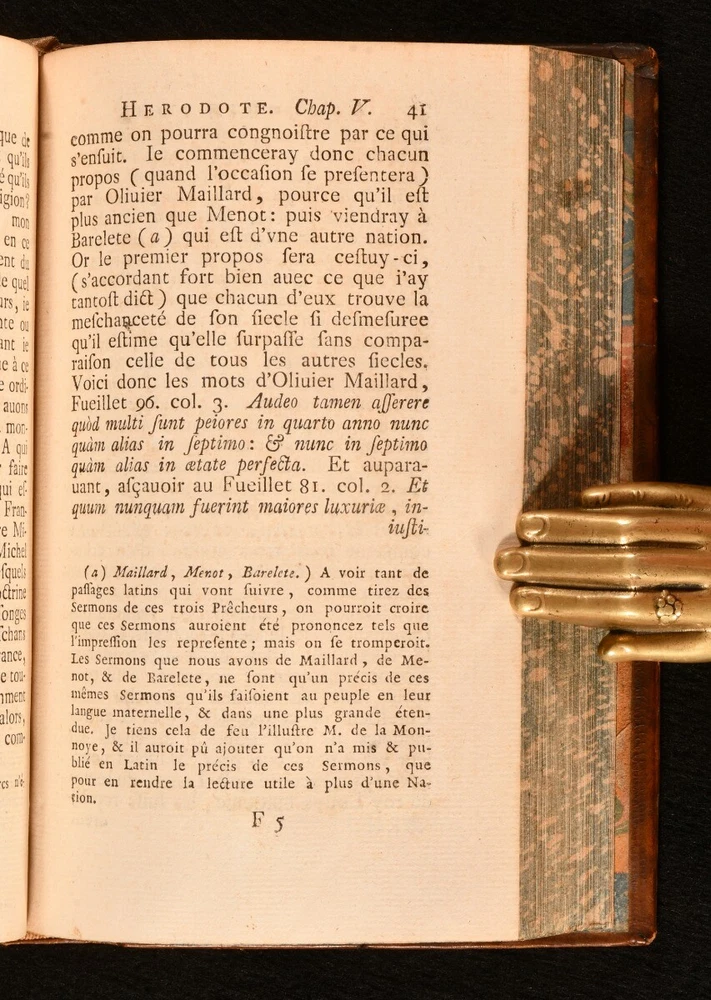 Click here to see our other books! Apologie pour Herodote. Ou Traite de la Conformite des Merveilles Anciennes avec les Modernes Henri Estiene; Henri Estienne 1735 Henri Scheurleer : Haye 6.5" by 4" [2], xxxvi, xlviii, 200, [49]; [2], 201-624; [6], 434pp SUMMARY A smart edition of Henri Estienne's controversial attack on sixteenth century society, veiled as a look at the life of the Greek historian Herodotus. Illustrated,Leather Binding Overall Condition: Very Good This book weighs 1.5 KG when packed UK Postage: £ 3.99 US Postage: £ 23.99 EU Postage : £ 18.99 European Postage: £ 19.99 Asia Postage: £ 31.99 Worldwide Postage: £ 32.99 DESCRIPTION In the original French. Complete in three volumes. Illustrated with a frontispiece to each volume. Henri Estienne's controversial work on Herodotus. In these three volumes Estienne describes a series of strange stories from Herodotus' life, creating parallels to equally strange stories from Estienne's own times, in a very satirical look at his contemporary world. Estienne's contempt for his society stirred much controversy, including with Genevan churchmen, with Estienne describing his thoughts of the failings of priests; this led to Estienne to be arrested and being obliged to cancel the offending pages. Though the work was offensive to some, it still proved to be incredibly popular, going through twelve editions within sixteen years. Estienne was a sixteenth century French classical scholar. This work was first published in 1566. Herodotus was a Greek historian was the Persian Empire, best known for his 'Histories', a detailed account of the Greco-Persian Wars. He is generally regarded to be 'The Father of History'. A new edition with notes and remarks by Mr. Duchat. CONDITION In a full mottled calf binding. Externally, smart, with some light rubbing to the boards and spines. Crack to the head and tail of the front joint of Volume I, with loss to the tail of the front joint. Minor bumping to the extremities. Only a few small marks. Small chip to the head of the spine of Volume II, and a couple of small chips to the joints, slightly larger to the rear joint. Prior owner's ink inscription to the verso of the front endpaper of Volume I. Internally, firmly bound. Pages are very lightly age-toned and clean with only a few scattered spots. Overall Condition: Very Good GLOSSARY OF TERMS Overall Condition (Dustwrapper condition rating is shown after that for the book itself, where a dustwrapper is present) Fine - Very well preserved copy showing very little wear Very Good Indeed - Only one or two minor faults, really a very attractive copy Very Good - Quite a wide term meaning no major faults but probably several smaller ones often expected given the age of the book, but still a respectable copy Good - Meaning not very good. Some more serious faults as will be described in the condition report under 'condition' Good Only - Meaning one or more faults that could really do with repair Fair - As with good only above but with other faults leaving a compromised copy even after repair Poor - Really bad and possibly seriously incomplete. We only sell books in this condition where their rarity or value makes them attractive none the less. Major defects will be described. GUARANTEE We offer a full money back guarantee on our descriptions. Please ask for details and conditions. We prefer PAYPAL. If you pay via PAYPAL we will post the item off the same or the next working day with the postage you have selected. Please note we cannot accept USD cheques