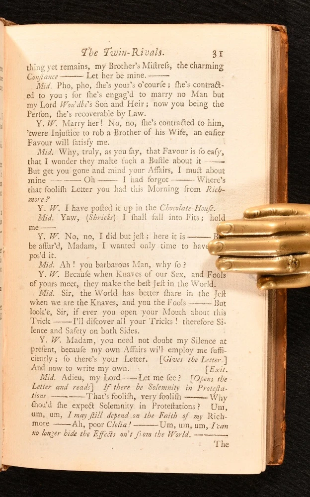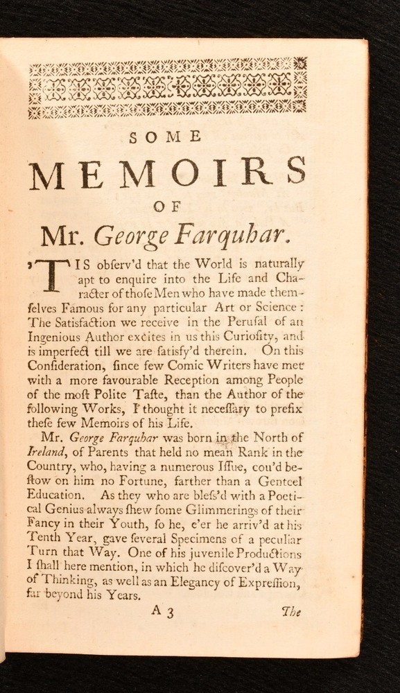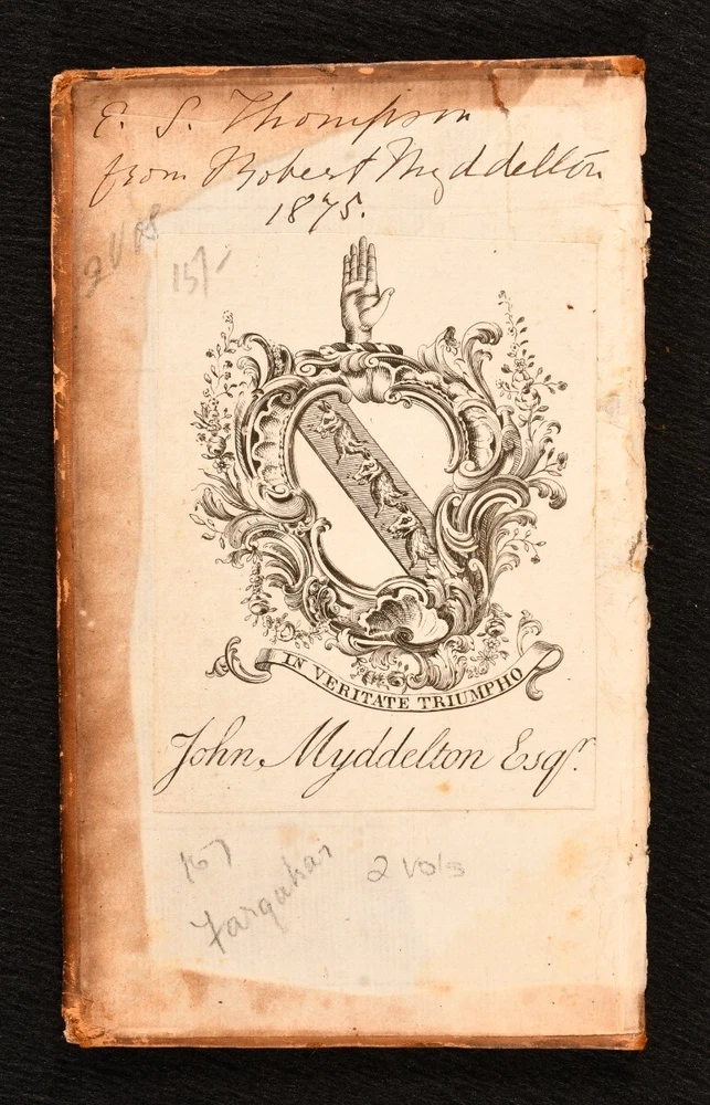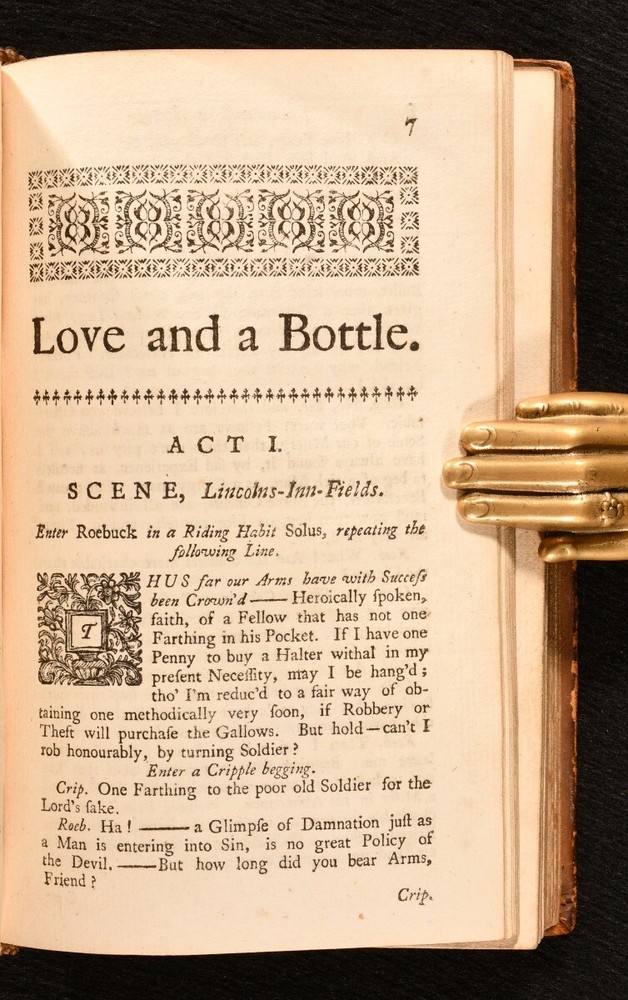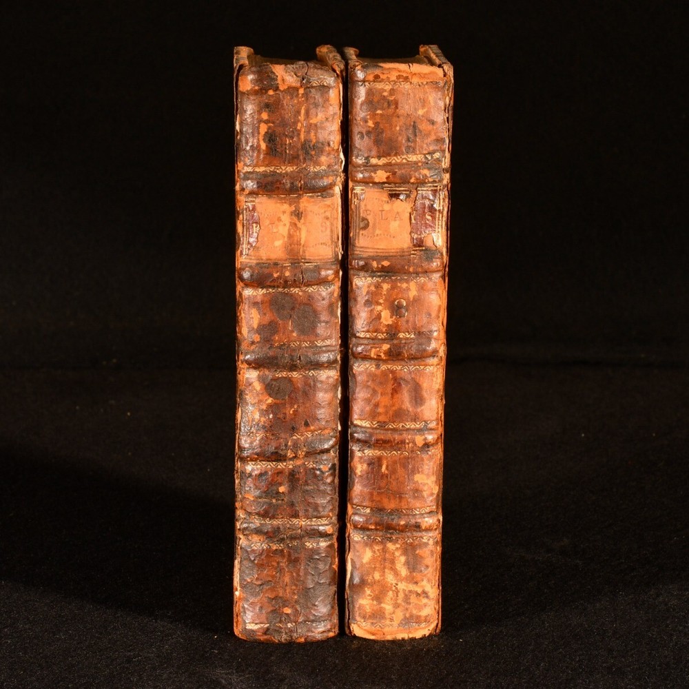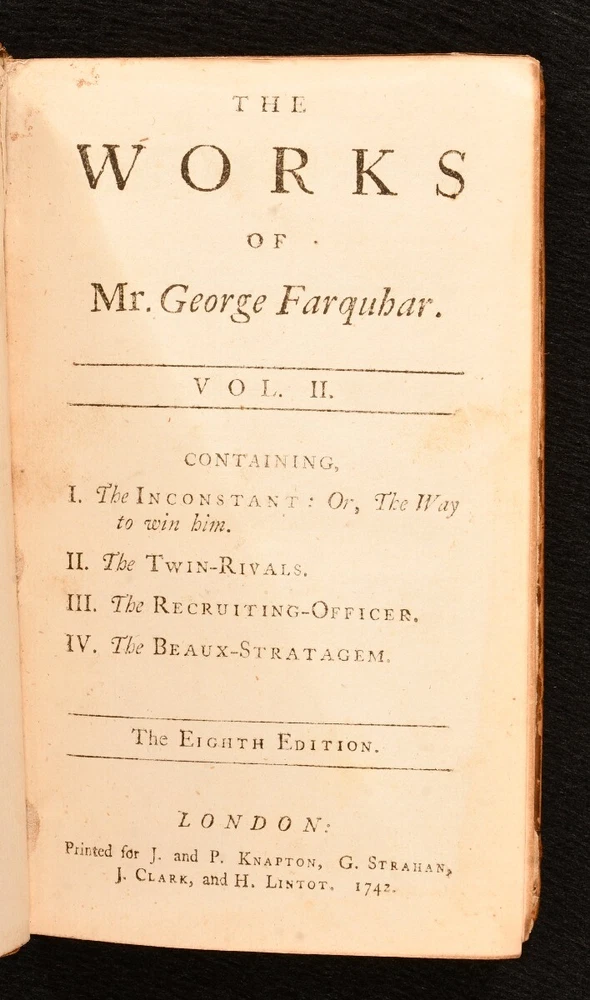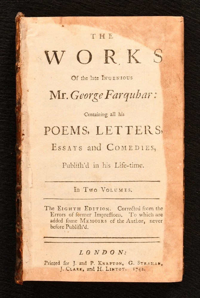Click here to see our other books! The Works of the late Ingenious Mr. George Farquhar: Containing all his Poems, Letters, Essays and Comedies, Publish'd in his Life-time. George Farquhar 1742 J. and P. Knaptop, G. Strahan, J. Clark and H. Lintot : London 6.5" by 4" 107, [1], 94, [10], 156, [2]; 86, 94, 98, 91, [3pp.] SUMMARY An early edition of the complete collected works of Irish dramatist and poet, George Farquhar, complete in two volumes. Early Edition,Leather Binding,Scarce Overall Condition: Good Only This book weighs 1 KG when packed UK Postage: £ 3.99 US Postage: £ 22.99 EU Postage : £ 16.99 European Postage: £ 17.99 Asia Postage: £ 22.99 Worldwide Postage: £ 28.99 DESCRIPTION The eighth edition. Complete in two volumes, uniformly bound in full calf. The collected works of Irish dramatist, George Farquhar, who was particularly known for his contributions to late Restoration comedy. This work contains all of Farquhar's poems, letters, essays and comedies published during his life. Volume I contains 'Poems, Letters and a Discourse upon Comedy', 'Love and a Bottle', 'The Constant Couple' and 'Sir Harry Wildair'. Volume II contains 'The Inconstant', 'The Twin-Rivals', 'The Recruiting-Officer' and 'The Beaux-Stratagem'. With a separate title page and pagination for each comedy; 'Love and a Bottle', 'The Constant Couple', 'Sir Harry Wildair', and all plays to volume II. Bound with original endpapers and blanks, without half titles. With a bookplate of welsh landowner and politician, John Myddelton and the ink inscription of E. S. Thompson. CONDITION Bound in full calf, with original endpapers and blanks, without half titles. Externally, worn, with the front board detached to I. Rubbing and marking to boards, with slight loss to the leather, particularly to the spine head and tail. Lacking spine labels. Remaining hinges are strained, with the front of I and rear of II tender. Bookplate to front paste down with ink inscription to the front endpaper. Lacking endpapers to I. Slight offsetting to title page to I. Internally, otherwise firmly bound. Pages are bright and clean. Overall Condition: Good Only GLOSSARY OF TERMS Overall Condition (Dustwrapper condition rating is shown after that for the book itself, where a dustwrapper is present) Fine - Very well preserved copy showing very little wear Very Good Indeed - Only one or two minor faults, really a very attractive copy Very Good - Quite a wide term meaning no major faults but probably several smaller ones often expected given the age of the book, but still a respectable copy Good - Meaning not very good. Some more serious faults as will be described in the condition report under 'condition' Good Only - Meaning one or more faults that could really do with repair Fair - As with good only above but with other faults leaving a compromised copy even after repair Poor - Really bad and possibly seriously incomplete. We only sell books in this condition where their rarity or value makes them attractive none the less. Major defects will be described. GUARANTEE We offer a full money back guarantee on our descriptions. Please ask for details and conditions. We prefer PAYPAL. If you pay via PAYPAL we will post the item off the same or the next working day with the postage you have selected. Please note we cannot accept USD cheques
