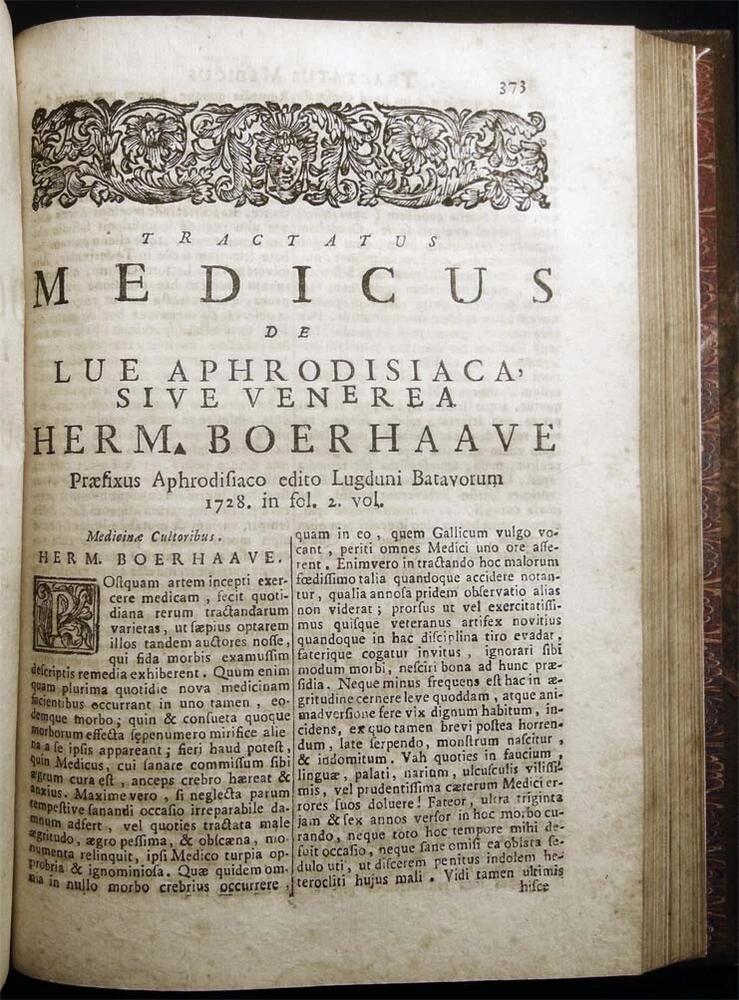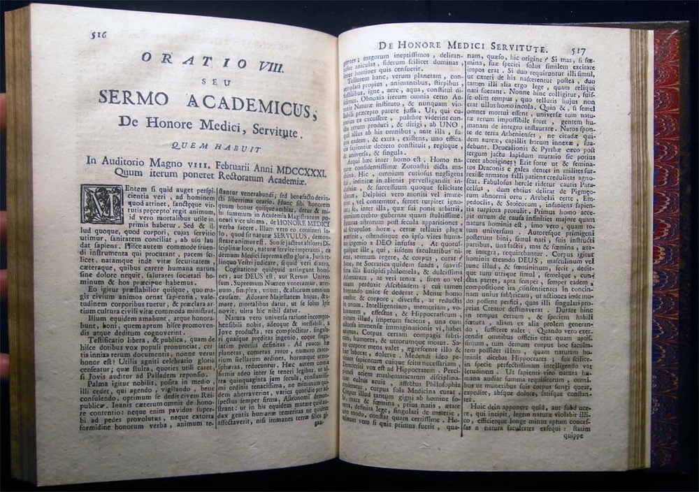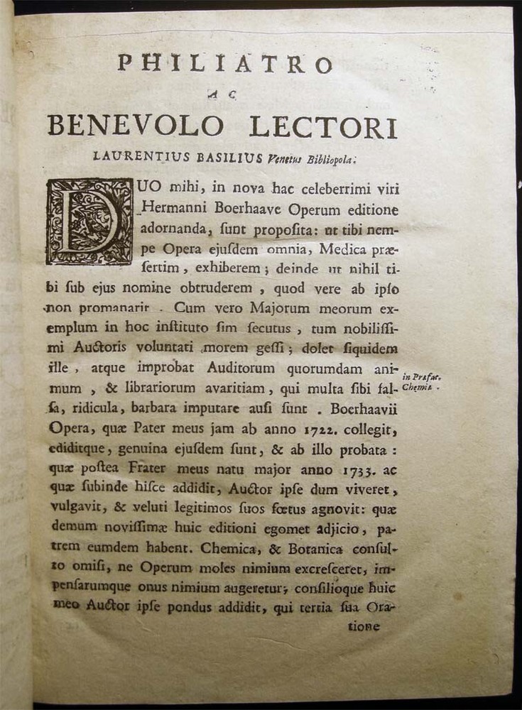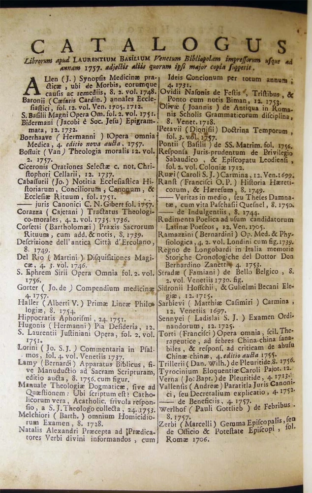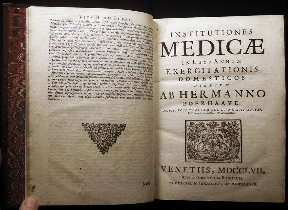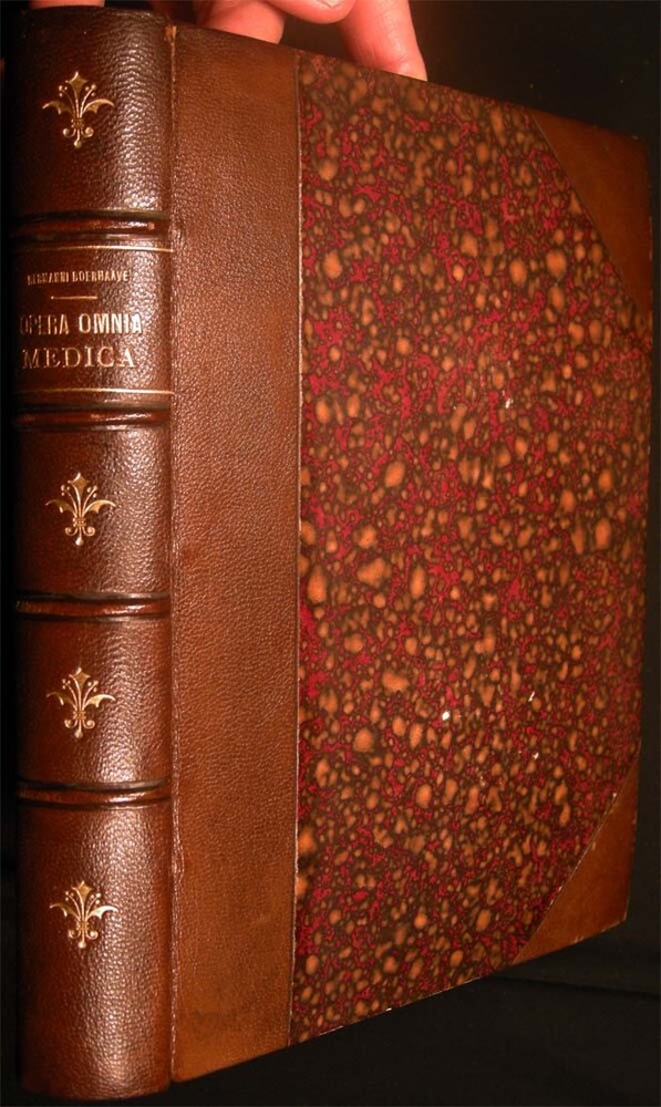 [27045] (Science - Medicine - 18th Century - Hermann Boerhaave). Hermanni Boerhaave Opera Omnia Medica, Quorum Series Post Praefationem Subjicitur. Venetiis: Laurentium Basilium, 1757. First Edtion. (22) + 536; 591-621 (pagination mis-numbered, content consecutive) + (1) pages Catalogus Laurentium Basilium. Frontispiece portrait illustration of the author; woodcut title, chapter & tailpiece ornaments. Latin text, with occasional Greek. The works of Hermann Boerhaave (1668 - 1738), Dutch physician, associated with the Univ. of Leiden; appointed "...the chair of practical medicine, and in this capacity he had the merit of introducing the modern system of clinical instruction. Four years later he was appointed also to the chair of chemistry..." (see Encyc. Brit. 11th ed.) Including: Institutiones medicae; Aphorismi de cognoscendis et curandis morbis; Libellus de materie medica; De lue aphrodisiaca, sive venerea; Atrocis, nec descripti prius morbi historia; Atrocis, rarissimique morbi historia altera; De fabrica glandularum in corpore humano; De mercurio experimenta; Orationes octo; De utilitate explorandorum in aegris excrementorum ut signorum; Introductio in praxin clinicam; Praelectiones de calculo; De distinctione mentis a corpore; Horti Ludguno-Batavi descriptio. Title page with the owner name-stamp of collector George R. Brush M.D., U.S. Navy; in service as a surgeon & medical inspector, from 1861-1894, and with his small number-ticket on front endpaper. Approx. 7 1/4" x 9 1/2" size, bound in later 19th century marbled-paper covered boards, dark brown leather corners & spine, gilt fleuron decorations & titles, marbled endpapers. A little edge, tips wear and rubbing to the binding; frontispiece illustration laid-down; first few leaves with a few tiny wormholes, no loss to text; front endpapers with surface paper scrapes at bottom edges; an ink name below the portrait; block strongly bound; in very good condition.
