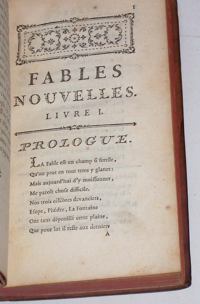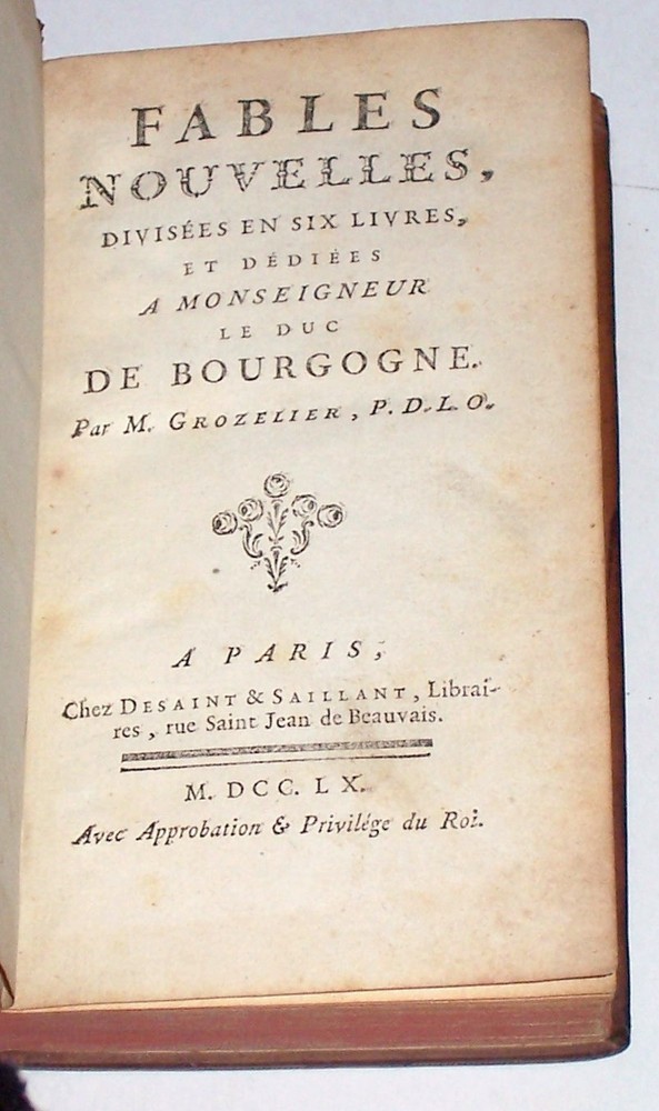 Fables Nouvelles, Divisees en six livres, et Dediees a Monseigneur Le Duc de Bourgogne , by M. Grozelier . Published by Desaint & Saillant (Paris). Print date 1760. 291 pages. 5.75" by 3.5". Written in French. Divided into six books, with about twenty fables in each section. Bound in full leather. There is wear at corners and head and heel of spine. The spine has a title label that the bottom half is missing from. Front board had a liquid spill and a droplet spot. Boards are lightly scuffed. The spine has gilt lettering and decoration that is still bright. Outer joints as well as inner hinges are intact. There is a previous owner bookplate on front pastedown ep. Pages are still bright and there is minimal spotting/foxing, and with a faint dampstain at the bottom of a few pages. This was dedicated to the Duke of Burgandy, who was probably Louis Joseph Xavier de France. He was just a boy, born in 1751. He died shortly after this was published, in 1761 at age 9. Overall condition is Very Good Book will be shipped boxed and insured All my books are as described. If I go too far in describing minor flaws, it's because I want you, the buyer, to be satisfied that you'll get no nasty surprises. Please check my feedback to assure yourself that you'll speedily get the book that is described. A happy customer comes back! For all buyers - I can ship the way which best fits your needs, so contact me if you would prefer a different method. Check out my ebay store - buythebookhere for all manner of scarce and interesting books and collectibles!