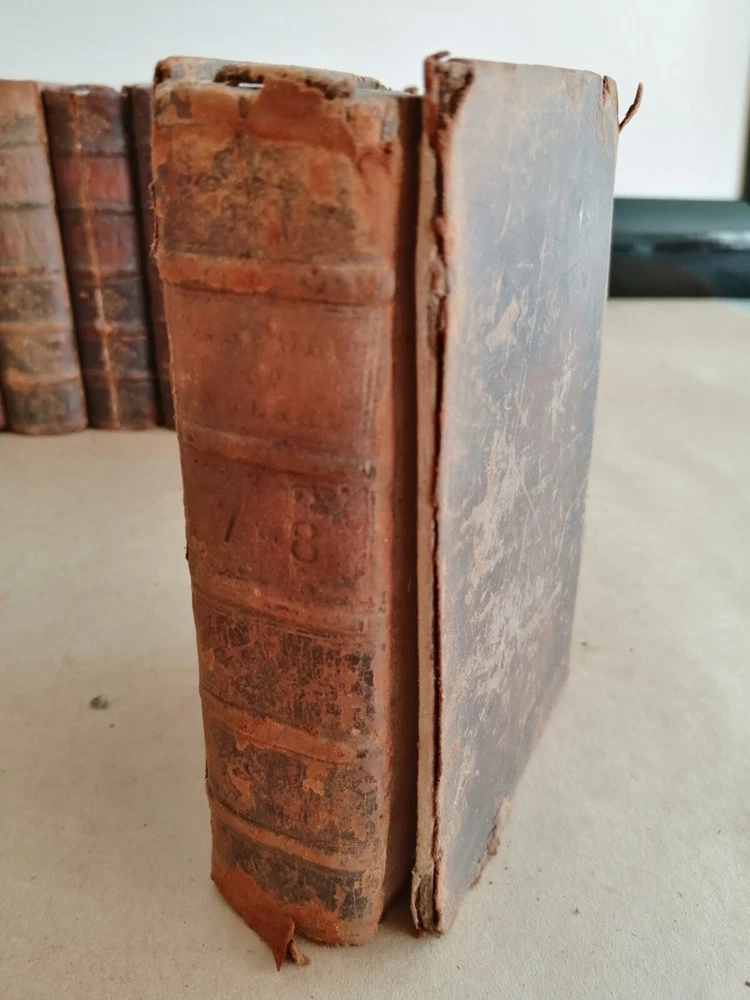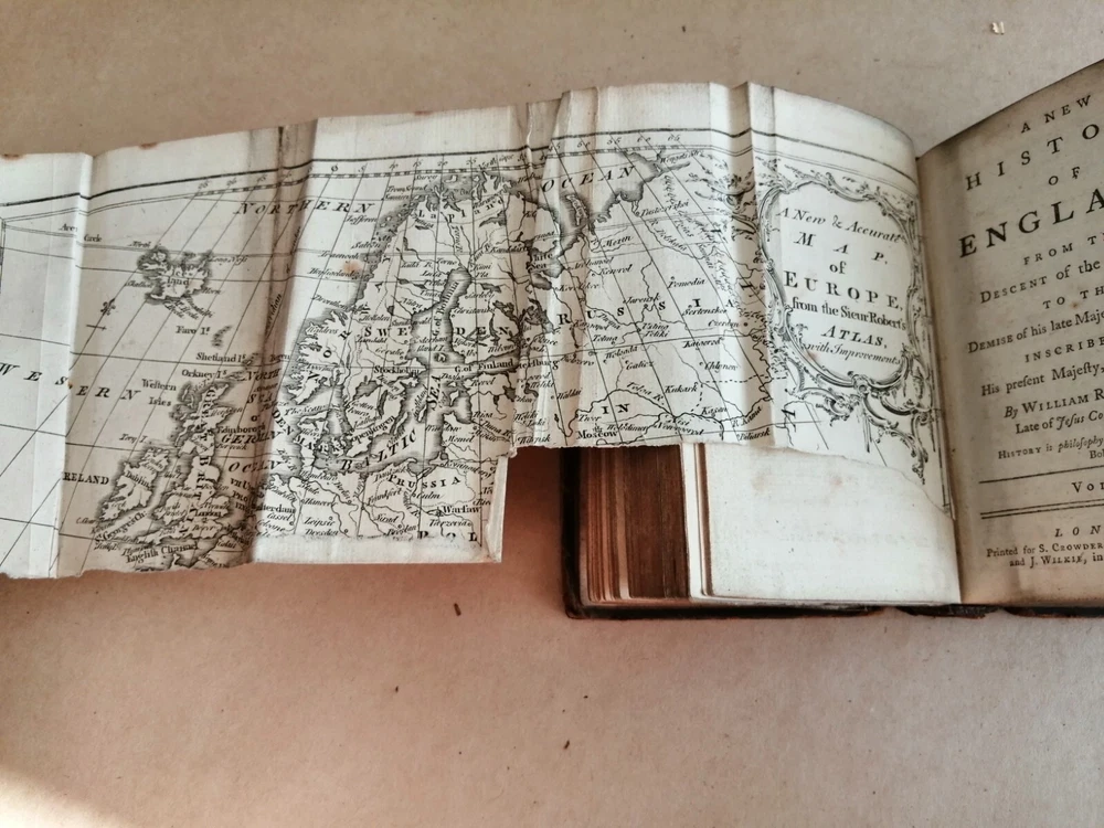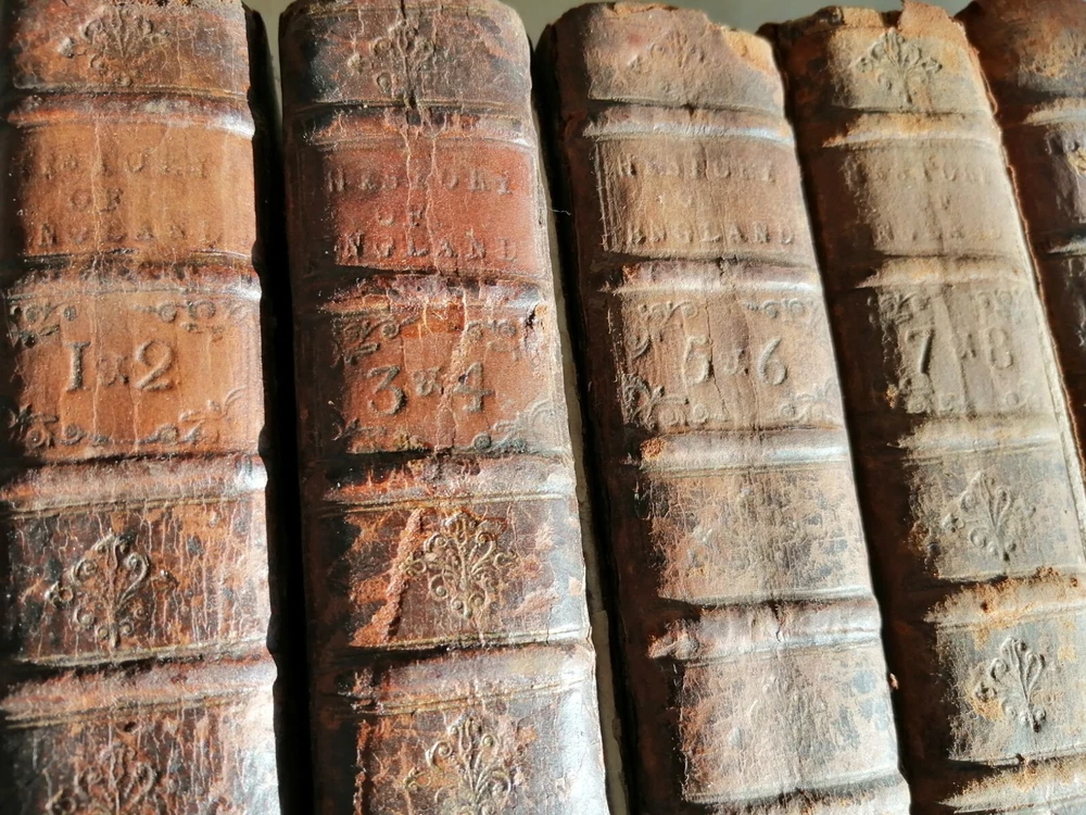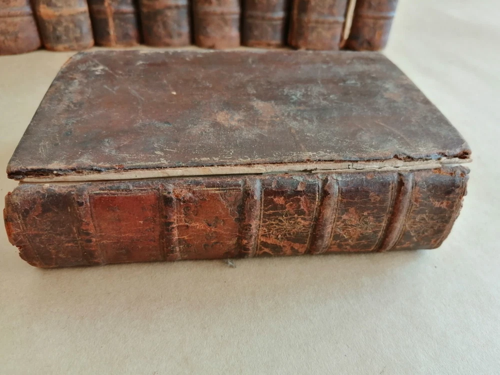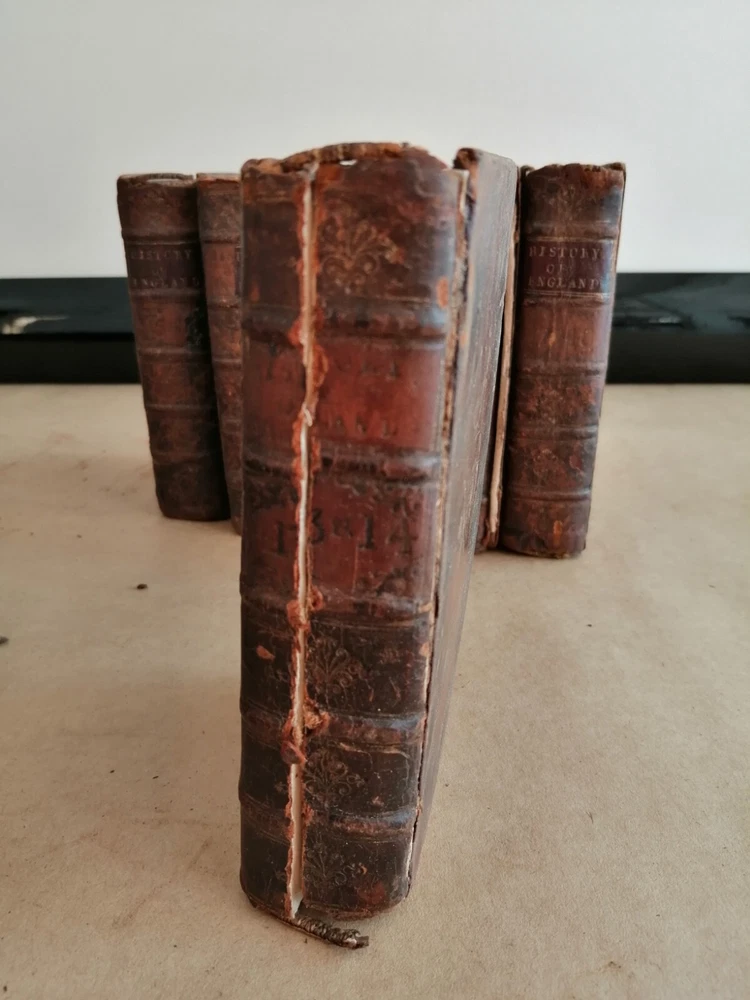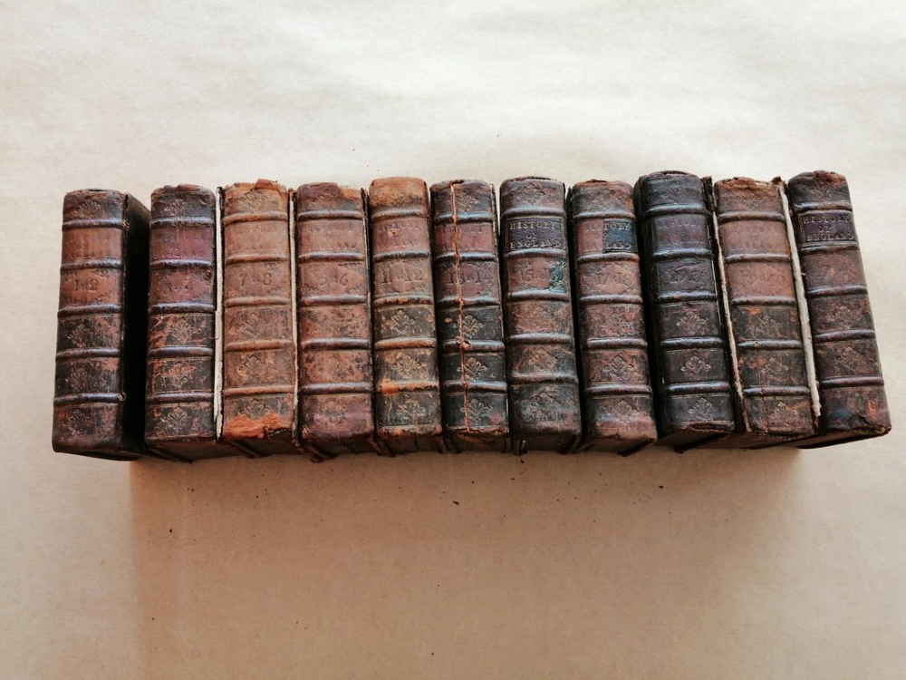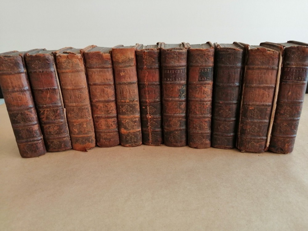 A New History of England. 1761-1764. Second edition. Very rare and beautiful.Te books are not incomplete. I photographed only the books that had their covers detached. The other books are in good condition. I have photographed every attachment that has a small error. All books can be improved. Several books are flawless. Very rare books, maybe the British Museum has them. All books in original leather binding. On the Back inside of the books, probably the former owner's signature: " John Emmet". 11 books. With lots of illustrations and maps!