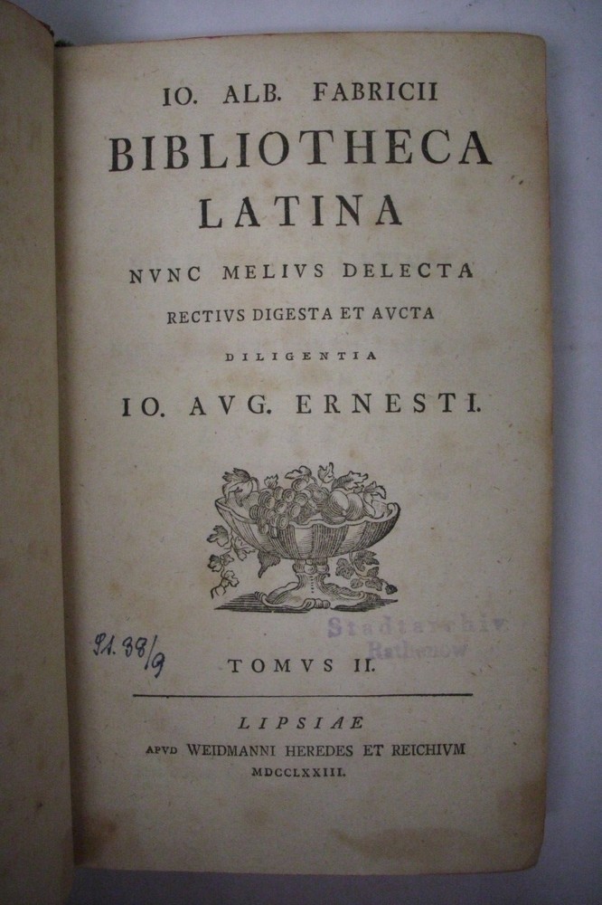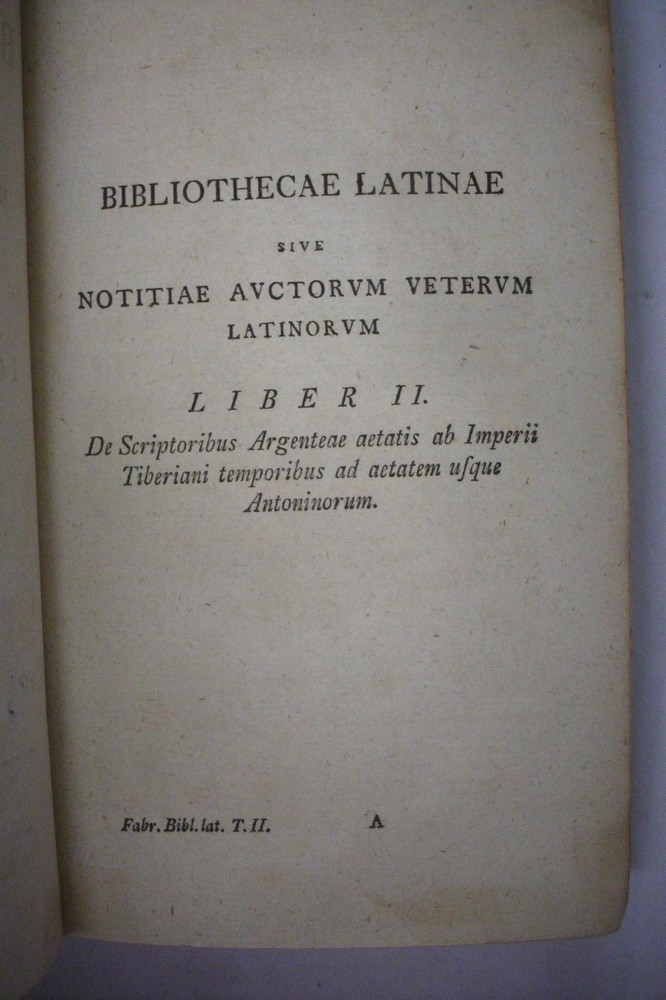 You are bidding on a very rare antique hardcover book titled Io. Alb. Fabricii Bibliotheca Latina. Nunc melius delecta rectius digesta et aucta diligenta Io. Aug. Ernesti. The book is in Latin. This is Volume II. Published in Leipsig, Germany by Weidmanni Heredes Et Reichium, 1773. "The author of this book is Johann Albert Fabricius (1668-1736). He was a German classical philologist and bibliographer, who is credited with 128 books, but he is the author of many of them, one of the most famous of which is" Bibliotheca Latina "(1697, improved and corrected 1773). Edited by Johann August Ernesti. This is an extremely early and quite rare printing! Book features hand-laid paper! Book is quarter-bound in leather with leather tips. Spine has five raised bands and gold lettering and gold designs. Covers firmly attached with no cracking or splitting of hinges. Corners worn through. All pages are clean and tightly bound (472 pages). The pages have very little foxing. The outer edges of the pages are an attractive red color. The outer page edges also are shiny as though they were polished by the book binder. Book remains in good condition. Small numbers written on title page and light ink stamp on title page "Stadtarchiv Rathenow." A very rare antiquarian book! Would make a super addition to a collection. Great gift idea! (Inventory: 58) Track Page Views With Auctiva's FREE Counter