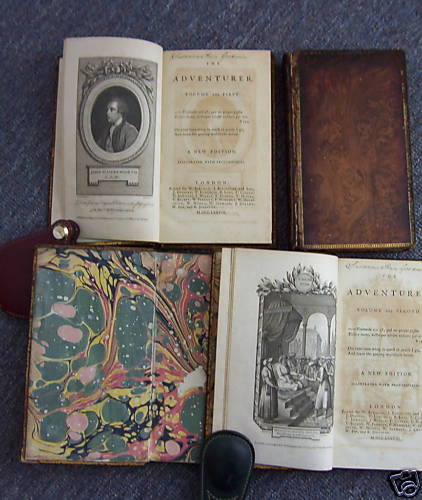 The ADVENTURER in 4 volumes was published 1778 in London for W. Strahan, J. Rivington and Sons et al. Each volume is bound in leather with gilt borders and spine decoration, marbled endpapers, and frontis illustration. The ADVENTURER was originally published in 140 parts 1752-1754. Many of the essays were contributed by the editor John Hawkesworth; other contributors included Samuel Johnson, Joseph Warton, Richard Bathurst etc. Thank you.