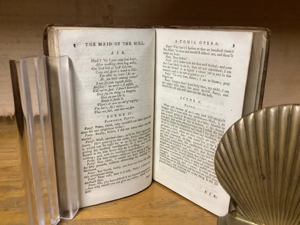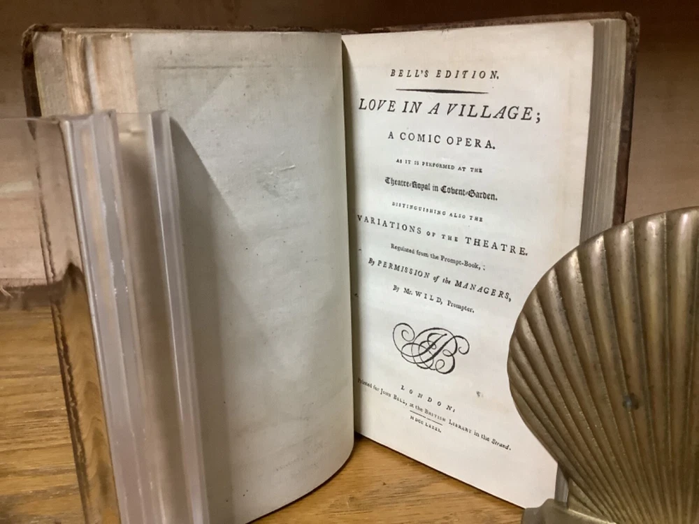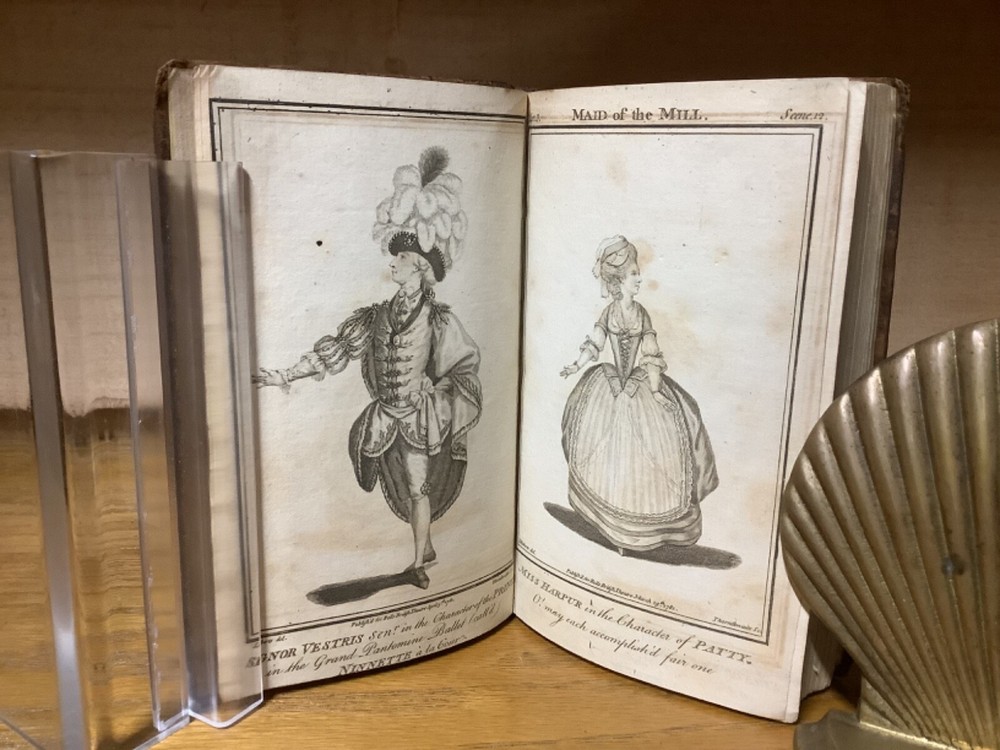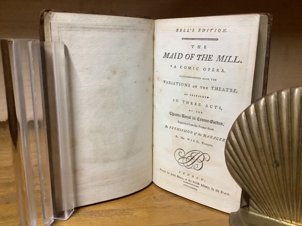 Bell’s Edition of 5 British operas (The Maid of the Mill, Love in a Village, The Jovial Crew, The Accomplished Maid, and Lionel and Clarissa). Printed in London by John Bell. 1781, 7” x 4.5”, full leather hardcover. In god condition, with minor rubbing and wear to boards, primarily along edges and corners. Minor loss to heel of spine. Hinges remain in good condition and text block is bound well. Plays preceded with full-page, black-and-white illustrations of some featured actors and actresses. Light marginalia and markings at front and back of book. General age-related toning to pages, along with periodic foxing and wear. Please see photographs and ask any questions prior to purchasing. A scarce collection of late 18th Century British plays, nicely preserved with accompanying illustrations. COLL1781BDFS-1023-aj0529