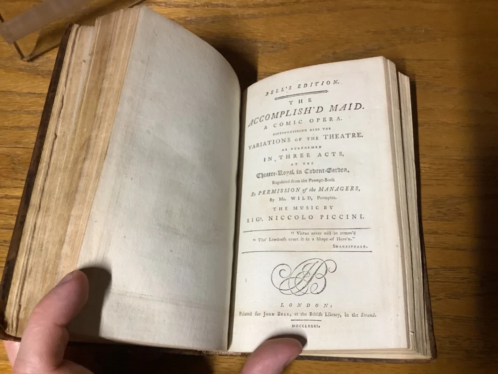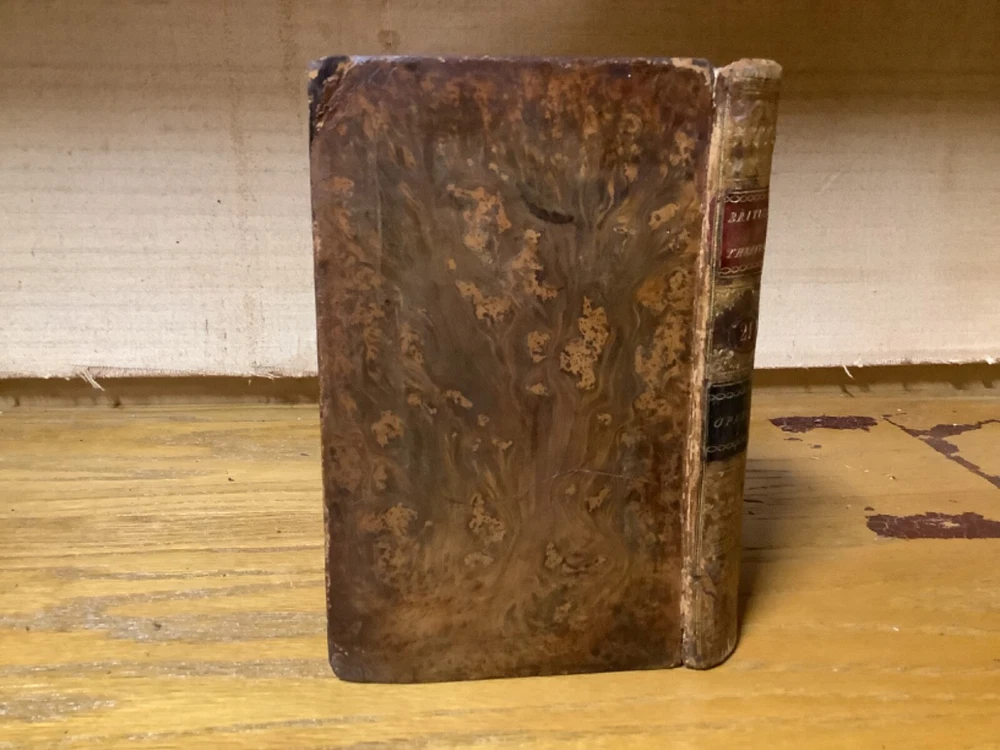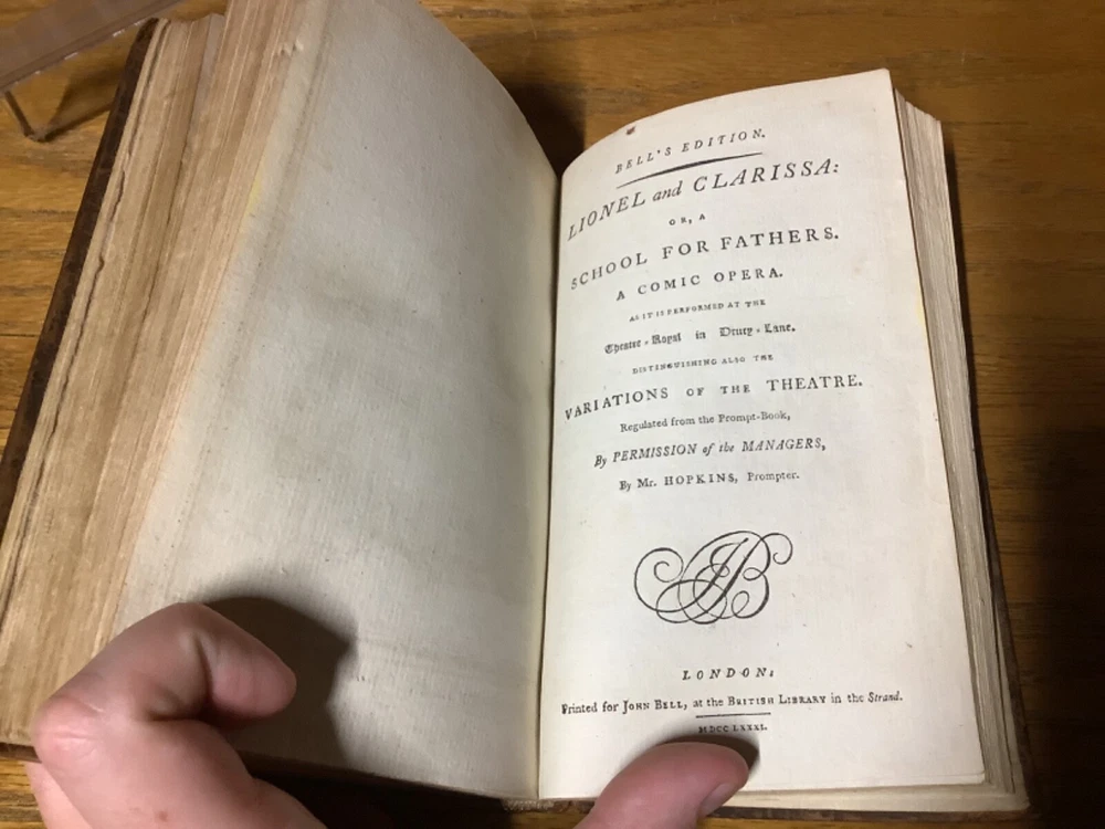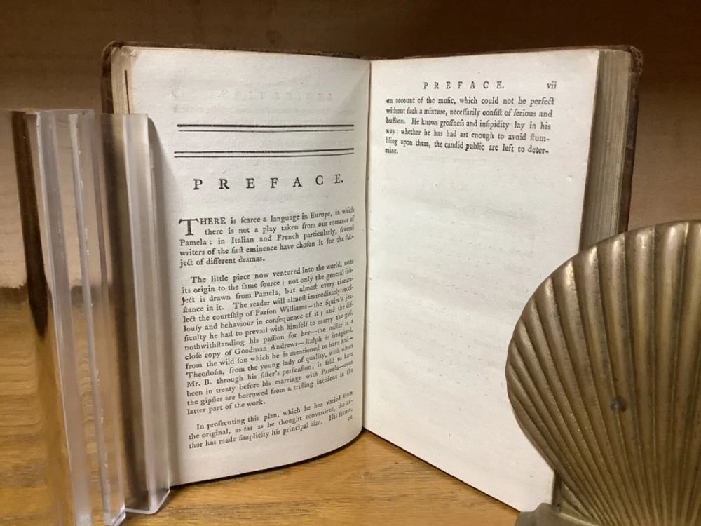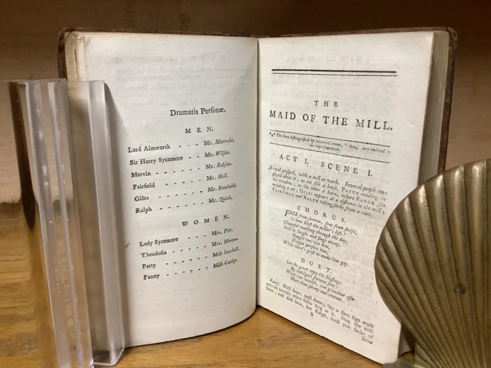 Bell’s Edition of 5 British operas (The Maid of the Mill, Love in a Village, The Jovial Crew, The Accomplished Maid, and Lionel and Clarissa). Printed in London by John Bell. 1781, 7” x 4.5”, full leather hardcover. In god condition, with minor rubbing and wear to boards, primarily along edges and corners. Minor loss to heel of spine. Hinges remain in good condition and text block is bound well. Plays preceded with full-page, black-and-white illustrations of some featured actors and actresses. Light marginalia and markings at front and back of book. General age-related toning to pages, along with periodic foxing and wear. Please see photographs and ask any questions prior to purchasing. A scarce collection of late 18th Century British plays, nicely preserved with accompanying illustrations. COLL1781BDFS-1023-aj0529
