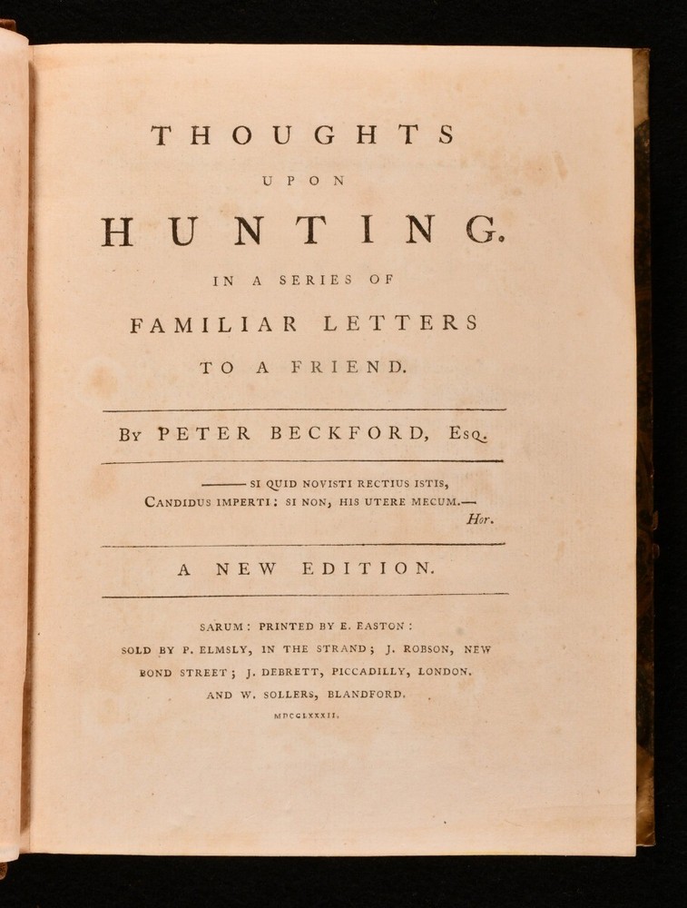 Click here to see our other books! Thoughts on Hunting in a Series of Familiar Letters to a Friend Peter Beckford 1782 E. Easton : London 8" by 6.5" [10] 357pp SUMMARY A handsomely bound copy of this work on hunting, written as a series of letters to a friend. By Sir Peter Beckford, an eighteenth-century hunting enthusiast. Early Edition,Leather Binding,Rebound Overall Condition: Very Good Indeed This book weighs 0.75 KG when packed UK Postage: £ 3.99 US Postage: £ 19.99 EU Postage : £ 15.99 European Postage: £ 16.99 Asia Postage: £ 21.99 Worldwide Postage: £ 25.99 DESCRIPTION Handsomely rebound in half speckled calf with vellum corners. An insightful work on hunting methods, tips, and opinions, written as a series of letters to a friend, a casual style. A perceptive look into eighteenth-century hunting practices. Written by Dorset-based landowner and hunting enthusiast, Sir Peter Beckford (1740-1811). He was a British landowner, hunstman, writer and patron. He wrote several works on his thoughts of hunting. Containing a beautiful illustrated frontispiece and two plates to the rear depicting a hunting lodge, as called for. This copy came from the library at Julians Park, Hertfordshire, the previous home of Audrey Pleydell-Bouverie (1902-1968). She was an English socialite and through her mother was the illegitimate granddaughter of King Edward VII. ESTC Citation No. T93430 CONDITION Handsomely rebound in speckled calf with vellum to the corners and marbled boards. Externally, very smart, with some minor shelf wear only. Internally, hinges are strained but firm. Evidence of prior tape repairs to the pastedowns and free-endpapers. Scattered spots to the first and last few pages, but otherwise pages generally clean throughout. Overall Condition: Very Good Indeed GLOSSARY OF TERMS Overall Condition (Dustwrapper condition rating is shown after that for the book itself, where a dustwrapper is present) Fine - Very well preserved copy showing very little wear Very Good Indeed - Only one or two minor faults, really a very attractive copy Very Good - Quite a wide term meaning no major faults but probably several smaller ones often expected given the age of the book, but still a respectable copy Good - Meaning not very good. Some more serious faults as will be described in the condition report under 'condition' Good Only - Meaning one or more faults that could really do with repair Fair - As with good only above but with other faults leaving a compromised copy even after repair Poor - Really bad and possibly seriously incomplete. We only sell books in this condition where their rarity or value makes them attractive none the less. Major defects will be described. GUARANTEE We offer a full money back guarantee on our descriptions. Please ask for details and conditions. We prefer PAYPAL. If you pay via PAYPAL we will post the item off the same or the next working day with the postage you have selected. Please note we cannot accept USD cheques