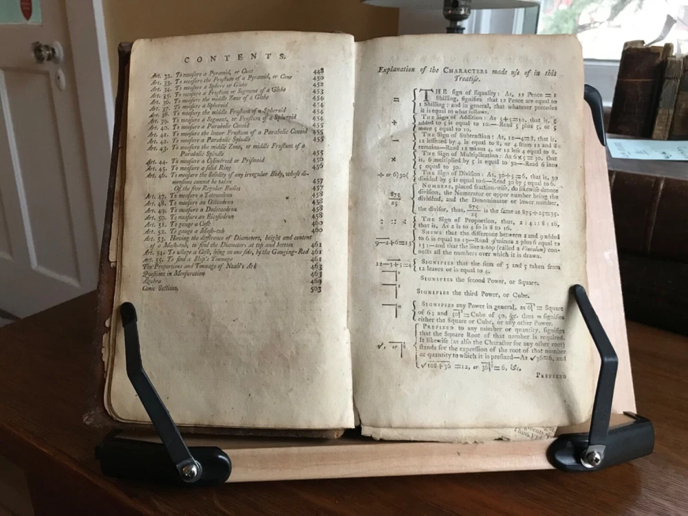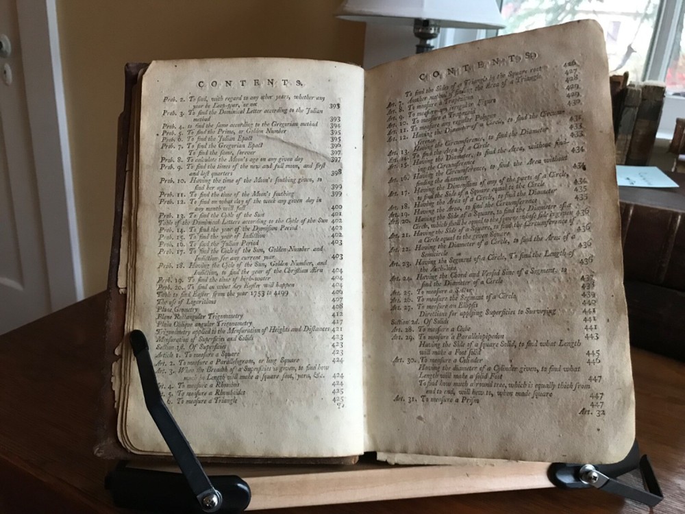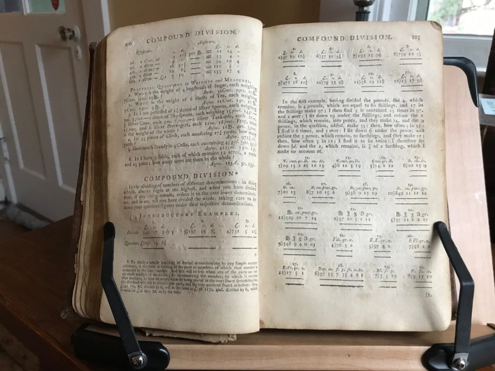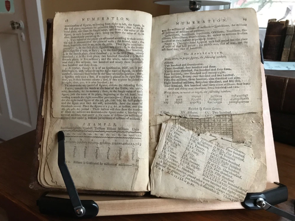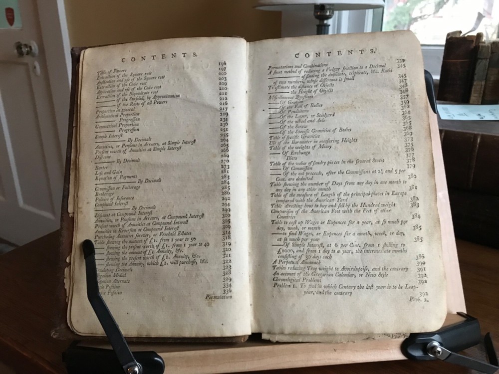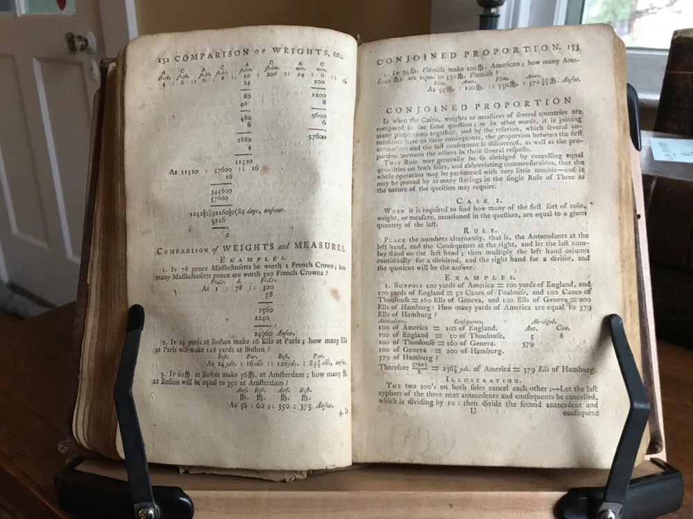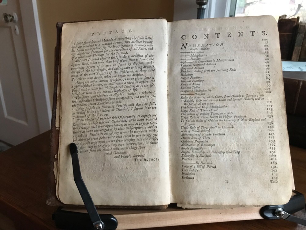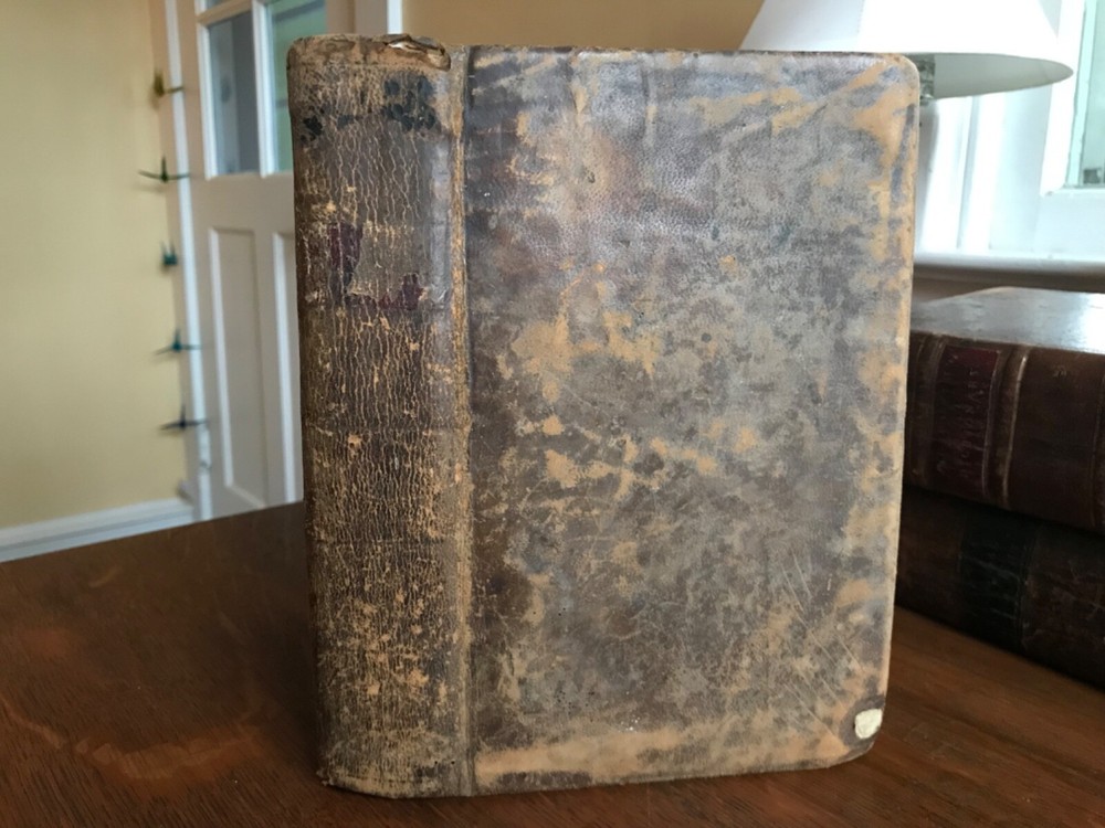 A New and Complete System of Arithmetic, Composed for the Use of Citizens of the United States, by Nicolas Pike, A.M., Printed and Sold by John Mycall, Newbury-Port (Mass.), 1788, 512 pp, full original leather, 8.25 x 5.5”, 8vo. In fair condition. Moderate wear to extremities with scuffing and scratching to surface of leather. Bottom right corner on front board is rubbed down to the board. Head of spine is slightly torn and spine overall is abraded. Light creasing overall. Small patch of worming to bottom compartment of spine. Patches of worming to rear board. Lacking fly? Pastedown is torn and damp stained. Interior toned with some brittle edges. Leaves 19-22 are severely torn. Binding remains intact. Please see photos. 1st edition. In-text woodcut diagrams and charts, bound without errata. A nice example of early American arithmetics that deals with new Federal currency. COLU1788BDGU FORN-TUB-0078-BB-2505-BSREV111