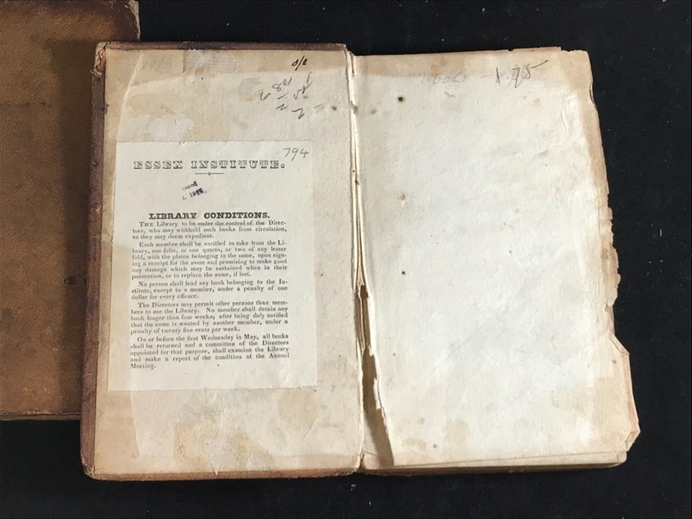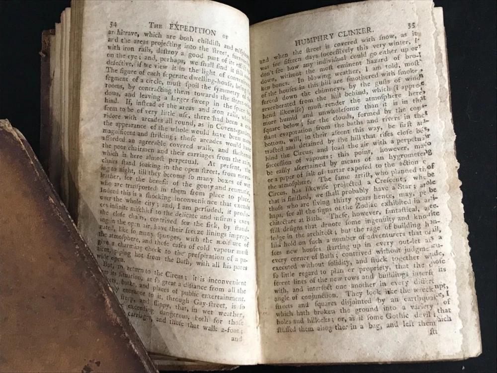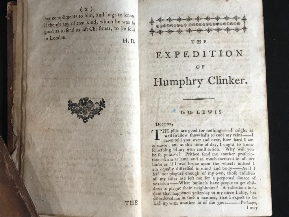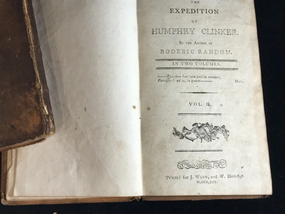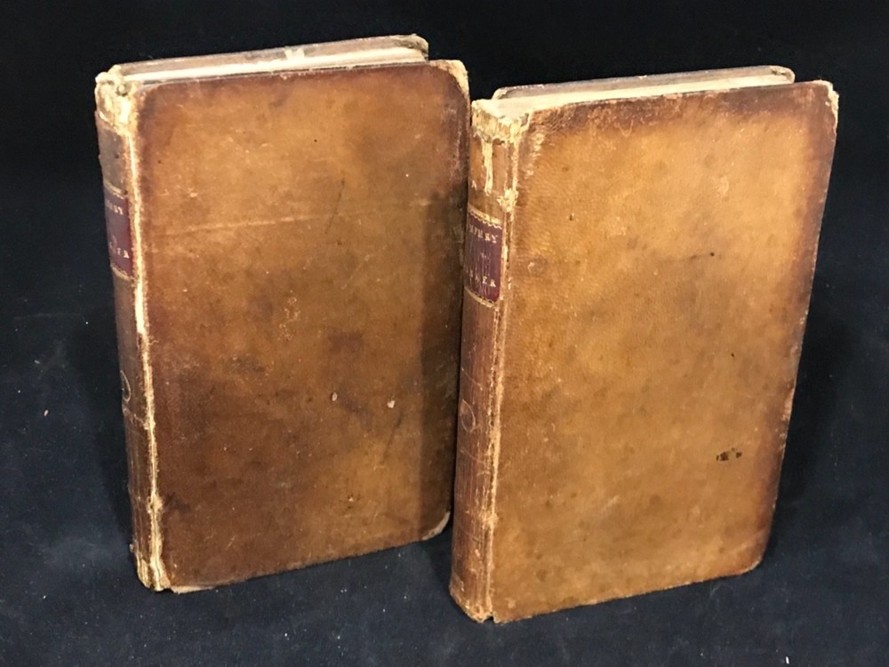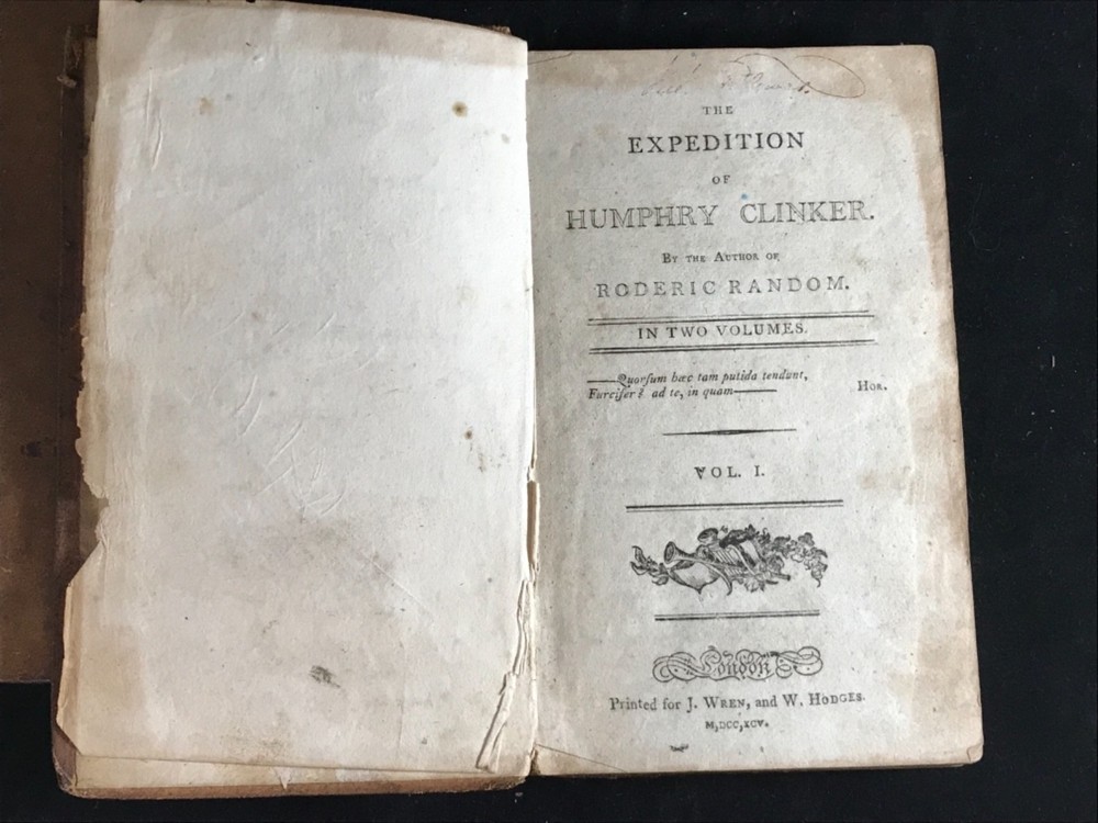 Two volume set of Smollett’s last picaresque novel in good Condition. Told in an epistolary fashion, this is considered one of Smollett’s most entertaining reads. Influenced by the author’s travels in Italy and France, much of the humor arises from the misconceptions and varying interpretations of the characters to the events they are involved in. These were bound for the Essex Institute, a library and “improving” society of Salem and attempts have been made to erase or remove the name of the previous owner. Nice leather binding with the institute’s name on the spine. Excellent gift for the aspiring collector as this is still a good read and these two volumes are still in nice enough condition to be handled and read, albeit gently.Please don't hesitate to email with questions or for more pictures. Good Condition: 12mo, (7”X4”), leather boards, page discoloration due to age and some foxing, loose front papers and loose front board in Volume One, pretty ornaments on title pages and introductory page. “The Expedition of Humphry Clinker”. By the Author of Rodney Random in Two Volumes". London: Printed for J. Wren and W. Hodges. 1795. COLL1795ADEA-var