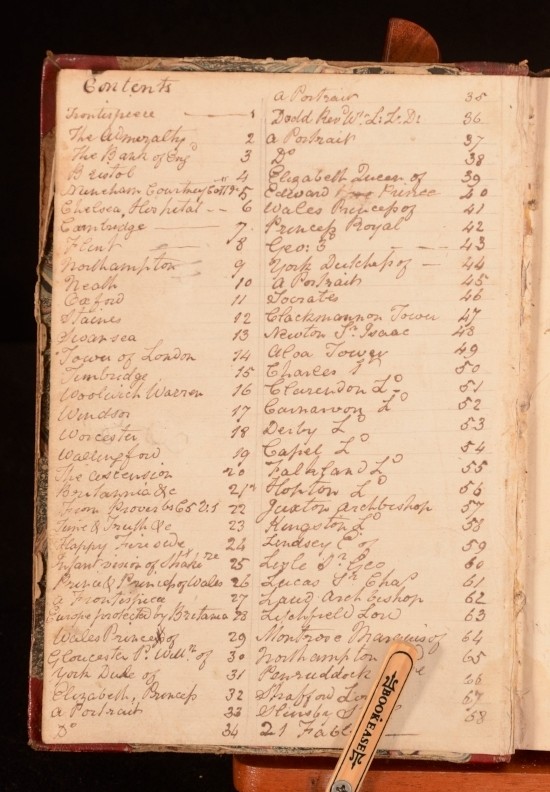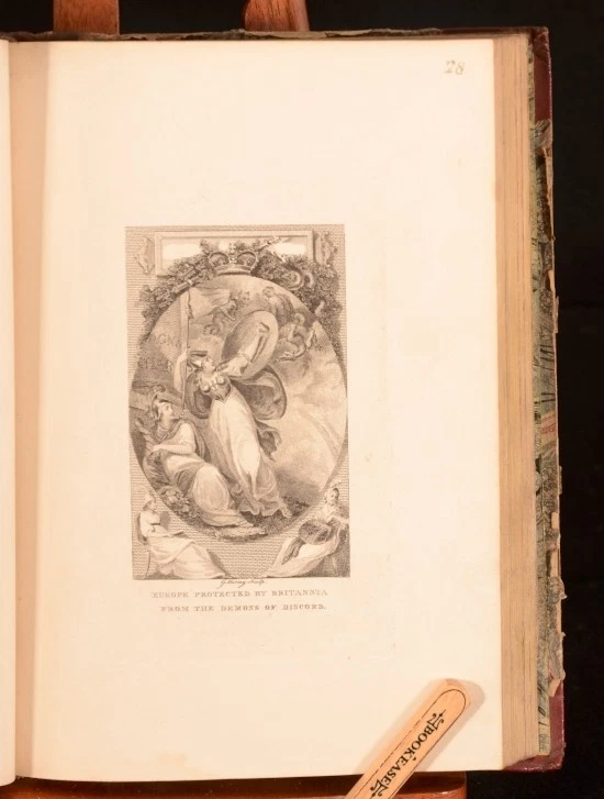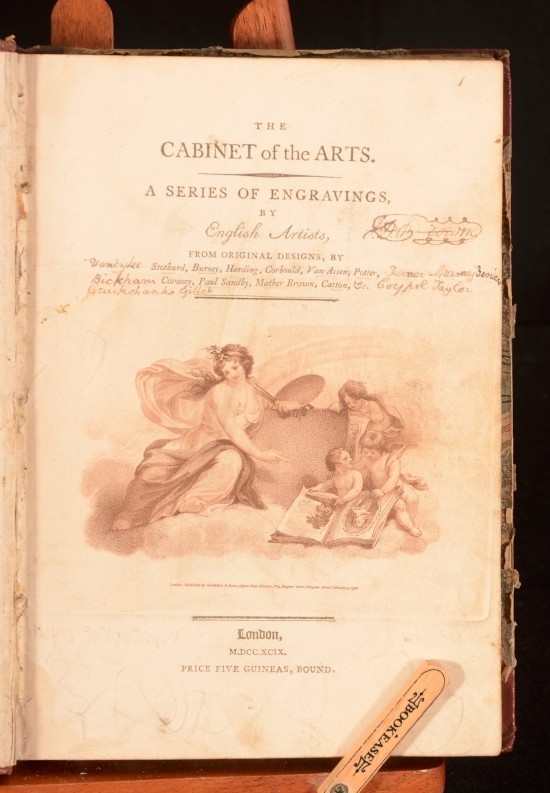 Click here to see our other books! The Cabinet of the Arts A Series of Engravings by English Artists Anonymous 1799 Not Stated : London 9" by 6.5" [1] 89pp SUMMARY A scarce collection of engravings by English artists. Scarce Overall Condition: Good This book weighs 0.75 KG when packed UK Postage: £ 3.99 US Postage: £ 19.99 EU Postage : £ 15.99 European Postage: £ 16.99 Asia Postage: £ 21.99 Worldwide Postage: £ 25.99 DESCRIPTION Contains 88 plates of engravings which include topographical views, portraits, emblematic scenes and reproductions of the engraved title pages of other publications. An interesting, if eclectic, collection of 18th century engravings and reproductions. An unusual work. Copac lists a copy held at the British Library, and copies also held at Yale university. All copies have different numbers of plates and the details of plates vary. The work appears to be a collection of plates chosen by the purchaser, intended to display the mastery of English engraving. LIkely the publisher produced a standard set of plates to which the purchaser could add their own choices. With the bookplate of Robert J Hayhurst The title page reads 'from original designs by Stothard, Burney, Harding, Corbould, Van Assen, Potter, Cosway, Paul Sandby, Mather Brown, Catton &C'. In this copy, some of these names have been underlined in early ink, to which has been added the names Vandyke, Bickham, Gillot, Taylor and others. All the plates in this volume are mentioned in the handwritten contents page. This includes several engravings by George Bickham the Younger. Other illustrations of interest include the two engraved title pages, one from the Lady's Pocket Magazine 1795 and the other from The Infant Vision of Shakespeare 1796. Also of note is an unattributed engraving of Isaac Newton which we have been unable to find reproduced elsewhere. CONDITION In a half calf binding with marbled boards. Externally, sound. Marbled boards torn with loss. Front hinge strained after endpaper. Personal bookplate to front pastedown. Internally, generally firmly bound. Pages generally bright with marginal foxing and occasional tidemarks. Title page foxed. Occasional neat pencil notes to unattributed plates offering descriptions. Pencil marks to title page and rear blanks and first two plates. Handwritten contents page opposite title page. Handling marks throughout. Overall Condition: Good GLOSSARY OF TERMS Overall Condition (Dustwrapper condition rating is shown after that for the book itself, where a dustwrapper is present) Fine - Very well preserved copy showing very little wear Very Good Indeed - Only one or two minor faults, really a very attractive copy Very Good - Quite a wide term meaning no major faults but probably several smaller ones often expected given the age of the book, but still a respectable copy Good - Meaning not very good. Some more serious faults as will be described in the condition report under 'condition' Good Only - Meaning one or more faults that could really do with repair Fair - As with good only above but with other faults leaving a compromised copy even after repair Poor - Really bad and possibly seriously incomplete. We only sell books in this condition where their rarity or value makes them attractive none the less. Major defects will be described. GUARANTEE We offer a full money back guarantee on our descriptions. Please ask for details and conditions. We prefer PAYPAL. If you pay via PAYPAL we will post the item off the same or the next working day with the postage you have selected. Please note we cannot accept USD cheques