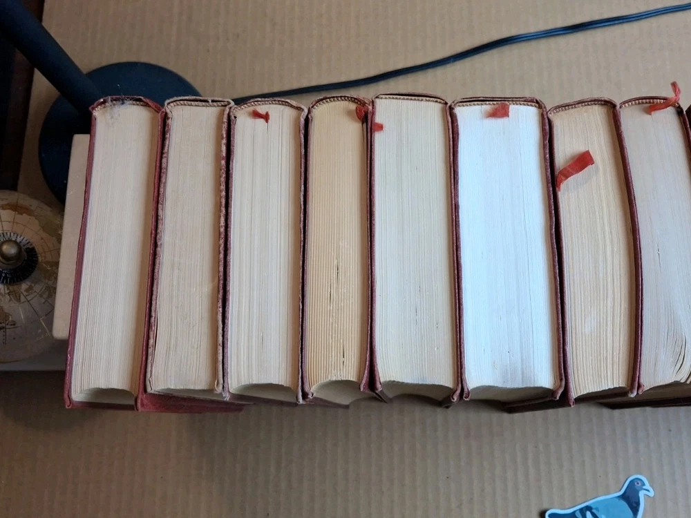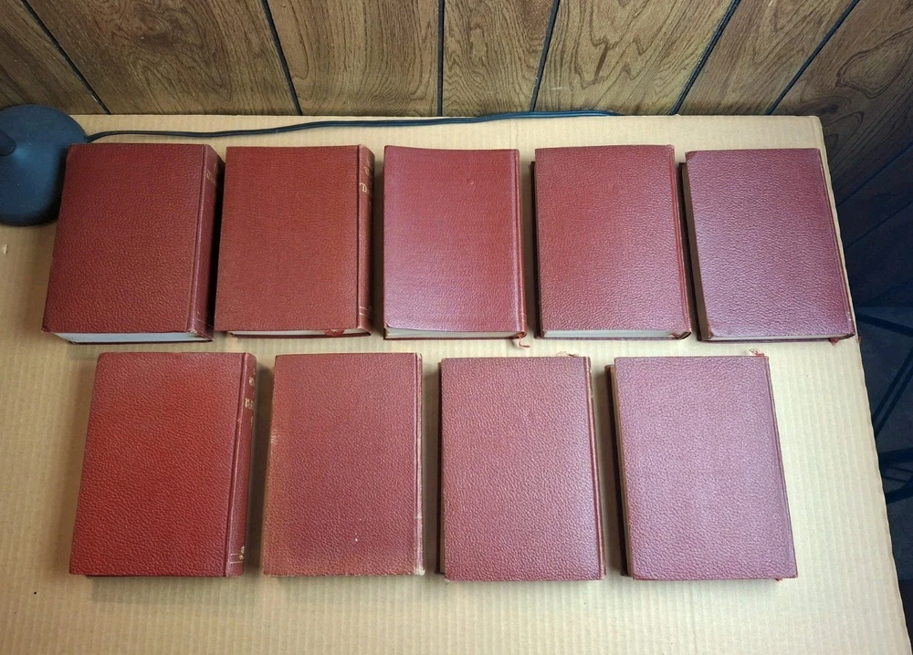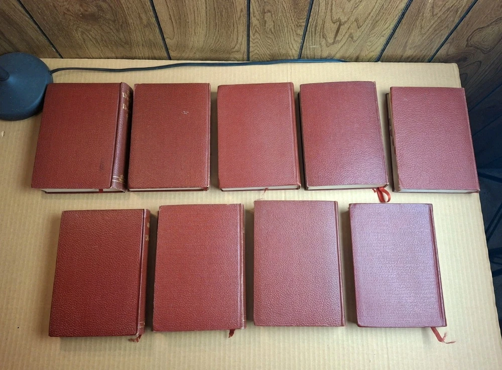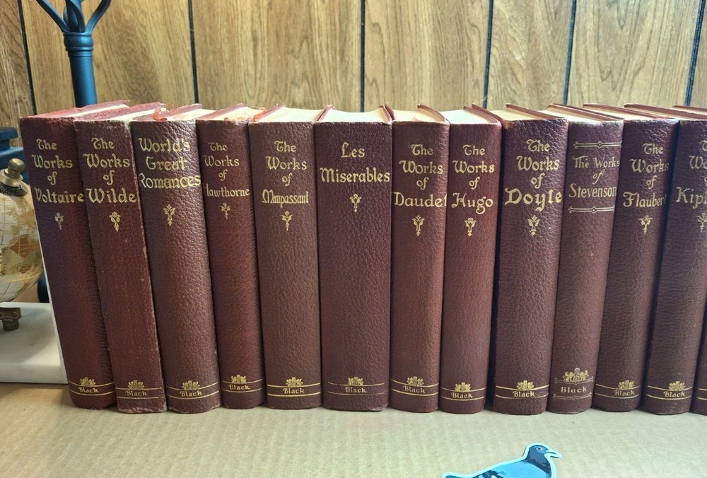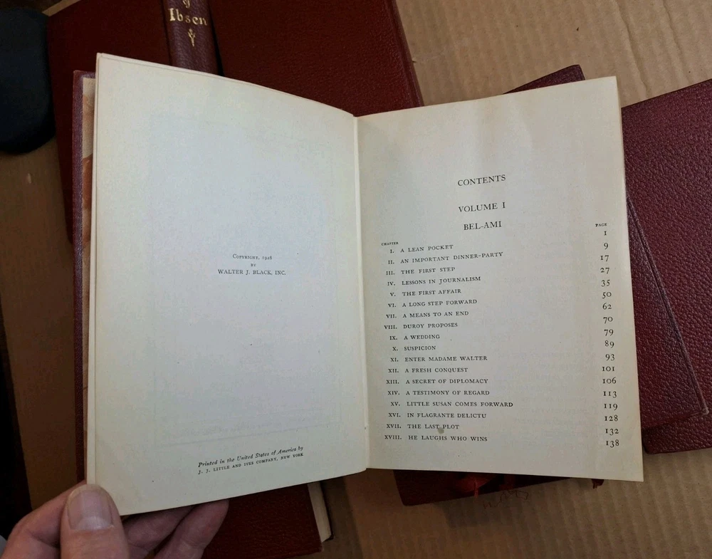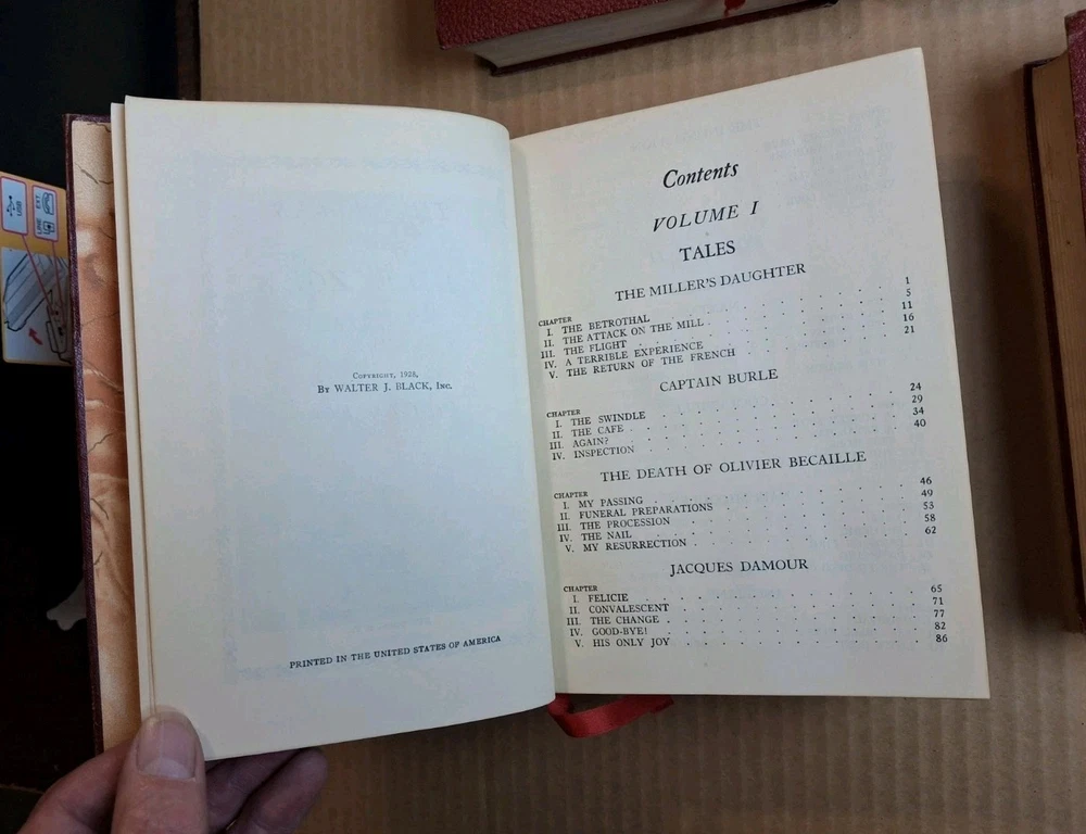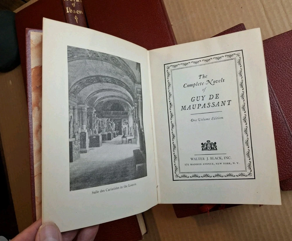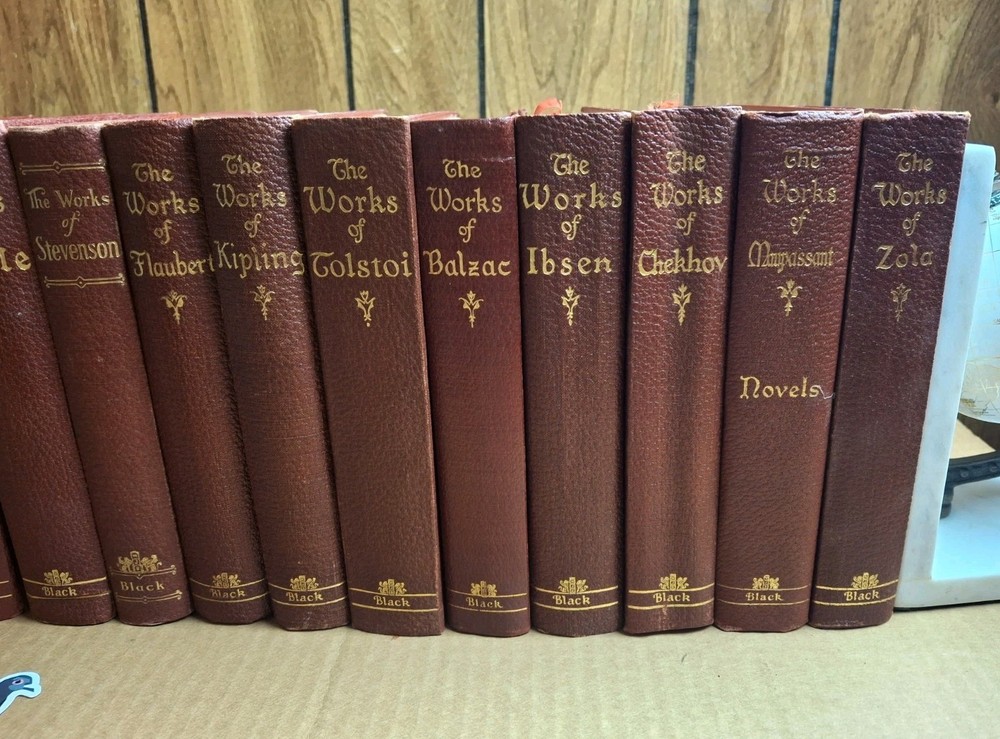 (18) Volumes WALTER J BLACK COLLECTED WORKS ONE VOLUME EDITIONS Soft Red Leather Bindings 1929 MATCHING MARBLE EP’S These books are all tightly bound with fairly straight spines and clean pages. They contain marbled endpapers, silk page marks and a gilt upper text block. A really nice set (I am not sure if it is complete). Maupassant, for example, is ten volumes in one for short stories and has another with novels.. Hugo contains poems, novels, short stories etc. These are complete works along with some other collections. Includes: THE WORKS OF GUY DE MAUPASSANT (Short Stories) THE WORKS OF GUY DE MAUPASSANT (Novels) THE WORKS OF VICTOR HUGO THE WORKS OF A. CONAN DOYLE THE WORKS OF NATHANIEL HAWTHORNE THE WORKS OF HONORE DE BALZAC THE WORKS OF RUDYARD KIPLING THE WORKS OF ROBERT LOUIS STEVENSON THE WORKS OF ANTON CHEKHOV THE WORKS OF ALPHONSE DAUDET THE WORKS OF LEO TOLSTOI THE WORKS OF EMILE ZOLA THE WORKS OF GUSTAVE FLAUBERT THE WORKS OF HENRIK IBSEN THE WORKS OF VOLTAIRE THE WORKS OF OSCAR WILDE LES MISERABLES WORLD’S GREATEST ROMANCES Free Shipping and Handling Via Insured Media Mail PLEASE SEE MY OTHER LISTINGS FOR MORE BOOKS