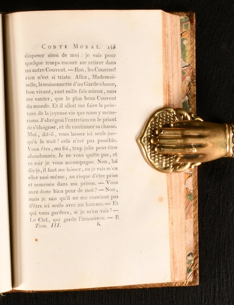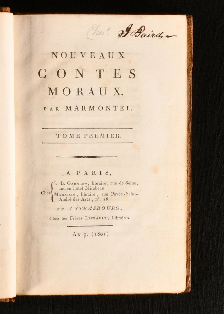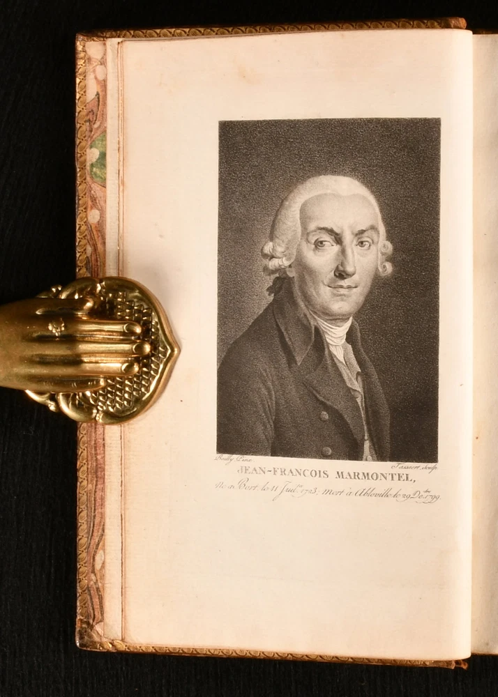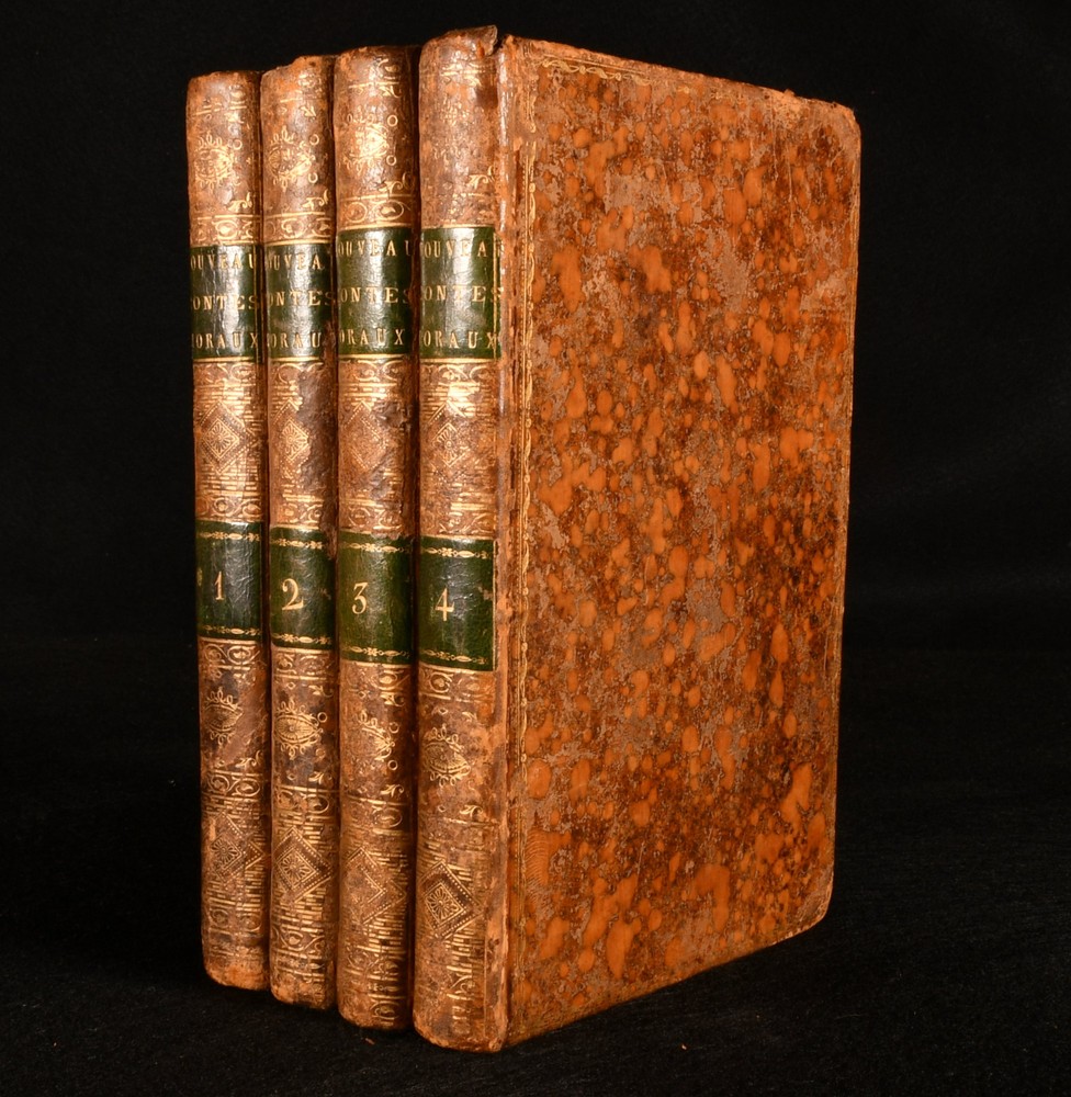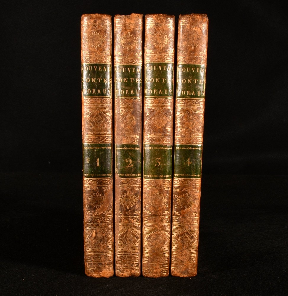 Click here to see our other books! Nouveaux Contes Moraux Jean-Francois Marmontel 1801 J. B. Garnery : Paris 8" by 5" [5], vi-viii, [1], 2-302, [1]; [5], 6-310, [1]; [5], 6-310, [1]; [5], 2-289, [1pp] SUMMARY An original French collection of the moral tales and short fables by the French historian Jean-Francois Marmontel, illustrated with one detailed plate to each volume. Leather Binding Overall Condition: Very Good This book weighs 2 KG when packed UK Postage: £ 3.99 US Postage: £ 29.99 EU Postage : £ 21.99 European Postage: £ 23.99 Asia Postage: £ 37.99 Worldwide Postage: £ 38.99 DESCRIPTION Complete in four volumes. In the original French. Collated, complete. Illustrated with a frontispiece to Volume I, and one plate each bound into Volumes II, III, and IV. Half-title is present to each volume. Registers run as: Volume I, [4], A-T8, Volume II, A-T8, V4, Volume III, A-T8, V4, Volume IV, [2], A-R8, S9. A collection of the tales of Jean-Francois Marmontel. Marmontel published this series of moral tales in the official journal 'Le Mercure'. The tales are moral, but also have a delicate finish to their writing style, and depict the court of Louis XV at Versailles in a charming and graphic manner. They are sentimental stories, and were very widely appreciated and popular with the public. Marmontel was a French historian and author. He was a member of the Enclycolpedistes movement, and first found literary success with a succession of tragedies that he wrote from 1748 to 1753, including 'Aristomene' and 'Cleopatre'. CONDITION In a full marbled calf binding. Externally, generally smart. Rubbing to the boards and spines, with some loss of leather to the front boards of Volumes I and II. Minor bumping to the head and tail of the spines and to the extremities, with a small amount of loss to the head of the spine of Volume II. A small amount of loss to the spine label to Volume II. Internally, firmly bound. Pages are very lightly age-toned and generally clean with the odd mark and odd spot. Prior owner's ink inscription, 'A. Baird' to the head of the title pages of Volumes I and II, to the head of the half-titles of Volumes III and IV, to the head of page 45 of Volume I, head of leaves C6 and E1 of Volume II, head of leaf C7 of Volume III, and head of leaf C7 of Volume IV. Small closed tear to the tail of leaf H7 of Volume I, not affecting text, and mark to leaf L6. Small chip to leaf O1 of Volume II, not affecting text. Overall Condition: Very Good GLOSSARY OF TERMS Overall Condition (Dustwrapper condition rating is shown after that for the book itself, where a dustwrapper is present) Fine - Very well preserved copy showing very little wear Very Good Indeed - Only one or two minor faults, really a very attractive copy Very Good - Quite a wide term meaning no major faults but probably several smaller ones often expected given the age of the book, but still a respectable copy Good - Meaning not very good. Some more serious faults as will be described in the condition report under 'condition' Good Only - Meaning one or more faults that could really do with repair Fair - As with good only above but with other faults leaving a compromised copy even after repair Poor - Really bad and possibly seriously incomplete. We only sell books in this condition where their rarity or value makes them attractive none the less. Major defects will be described. GUARANTEE We offer a full money back guarantee on our descriptions. Please ask for details and conditions. We prefer PAYPAL. If you pay via PAYPAL we will post the item off the same or the next working day with the postage you have selected. Please note we cannot accept USD cheques