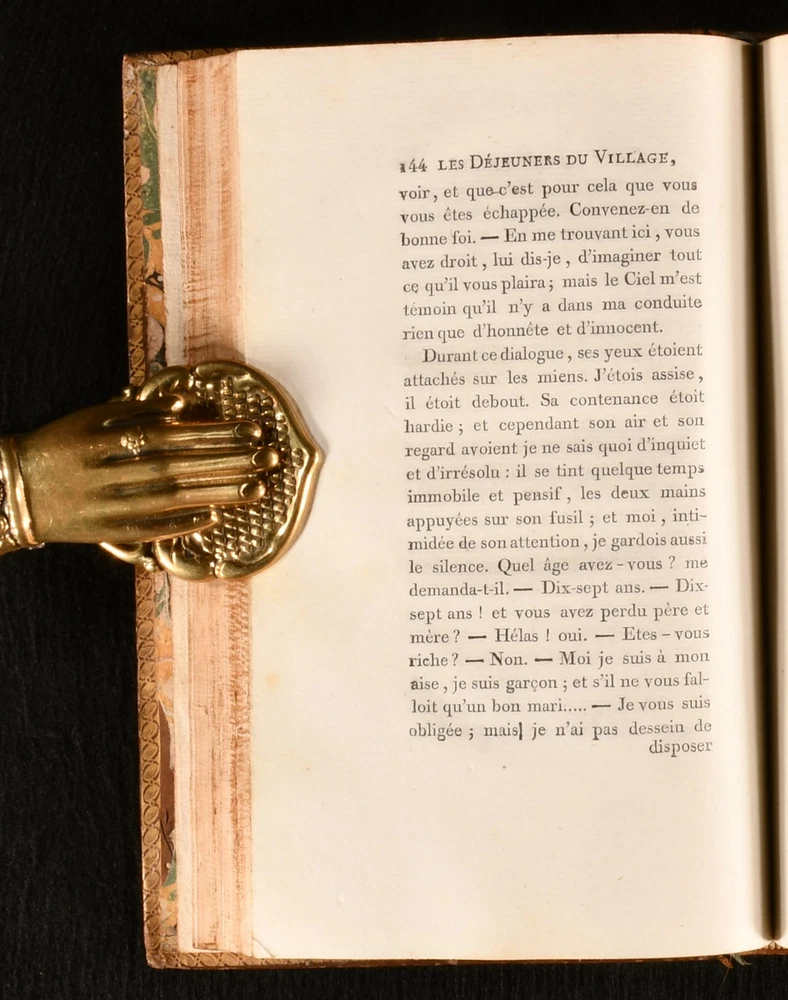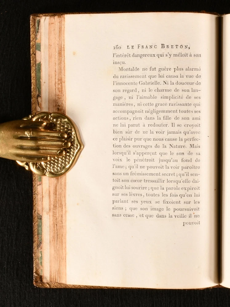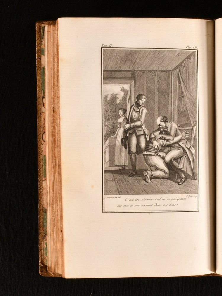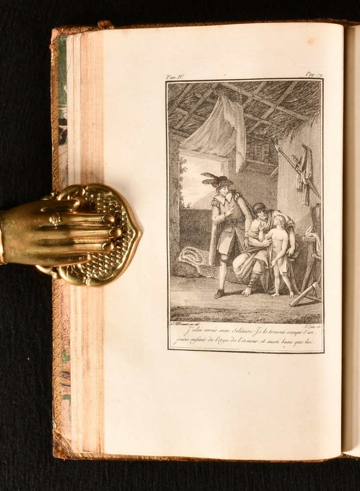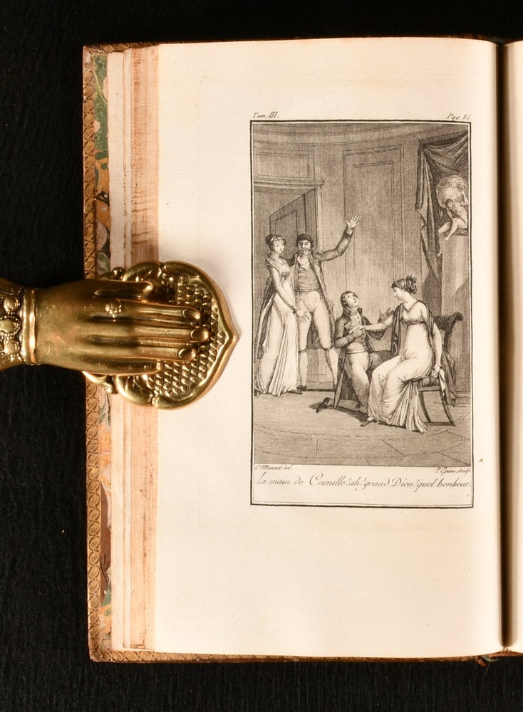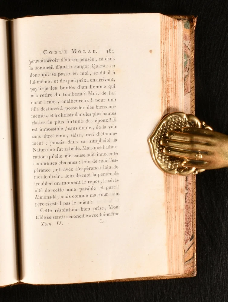 Click here to see our other books! Nouveaux Contes Moraux Jean-Francois Marmontel 1801 J. B. Garnery : Paris 8" by 5" [5], vi-viii, [1], 2-302, [1]; [5], 6-310, [1]; [5], 6-310, [1]; [5], 2-289, [1pp] SUMMARY An original French collection of the moral tales and short fables by the French historian Jean-Francois Marmontel, illustrated with one detailed plate to each volume. Leather Binding Overall Condition: Very Good This book weighs 2 KG when packed UK Postage: £ 3.99 US Postage: £ 29.99 EU Postage : £ 21.99 European Postage: £ 23.99 Asia Postage: £ 37.99 Worldwide Postage: £ 38.99 DESCRIPTION Complete in four volumes. In the original French. Collated, complete. Illustrated with a frontispiece to Volume I, and one plate each bound into Volumes II, III, and IV. Half-title is present to each volume. Registers run as: Volume I, [4], A-T8, Volume II, A-T8, V4, Volume III, A-T8, V4, Volume IV, [2], A-R8, S9. A collection of the tales of Jean-Francois Marmontel. Marmontel published this series of moral tales in the official journal 'Le Mercure'. The tales are moral, but also have a delicate finish to their writing style, and depict the court of Louis XV at Versailles in a charming and graphic manner. They are sentimental stories, and were very widely appreciated and popular with the public. Marmontel was a French historian and author. He was a member of the Enclycolpedistes movement, and first found literary success with a succession of tragedies that he wrote from 1748 to 1753, including 'Aristomene' and 'Cleopatre'. CONDITION In a full marbled calf binding. Externally, generally smart. Rubbing to the boards and spines, with some loss of leather to the front boards of Volumes I and II. Minor bumping to the head and tail of the spines and to the extremities, with a small amount of loss to the head of the spine of Volume II. A small amount of loss to the spine label to Volume II. Internally, firmly bound. Pages are very lightly age-toned and generally clean with the odd mark and odd spot. Prior owner's ink inscription, 'A. Baird' to the head of the title pages of Volumes I and II, to the head of the half-titles of Volumes III and IV, to the head of page 45 of Volume I, head of leaves C6 and E1 of Volume II, head of leaf C7 of Volume III, and head of leaf C7 of Volume IV. Small closed tear to the tail of leaf H7 of Volume I, not affecting text, and mark to leaf L6. Small chip to leaf O1 of Volume II, not affecting text. Overall Condition: Very Good GLOSSARY OF TERMS Overall Condition (Dustwrapper condition rating is shown after that for the book itself, where a dustwrapper is present) Fine - Very well preserved copy showing very little wear Very Good Indeed - Only one or two minor faults, really a very attractive copy Very Good - Quite a wide term meaning no major faults but probably several smaller ones often expected given the age of the book, but still a respectable copy Good - Meaning not very good. Some more serious faults as will be described in the condition report under 'condition' Good Only - Meaning one or more faults that could really do with repair Fair - As with good only above but with other faults leaving a compromised copy even after repair Poor - Really bad and possibly seriously incomplete. We only sell books in this condition where their rarity or value makes them attractive none the less. Major defects will be described. GUARANTEE We offer a full money back guarantee on our descriptions. Please ask for details and conditions. We prefer PAYPAL. If you pay via PAYPAL we will post the item off the same or the next working day with the postage you have selected. Please note we cannot accept USD cheques