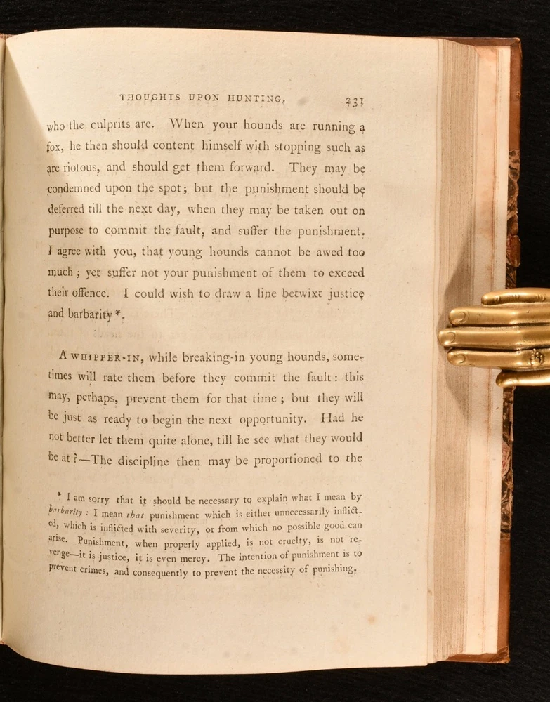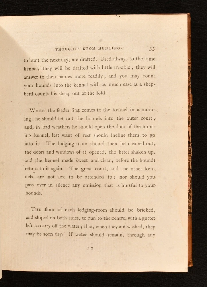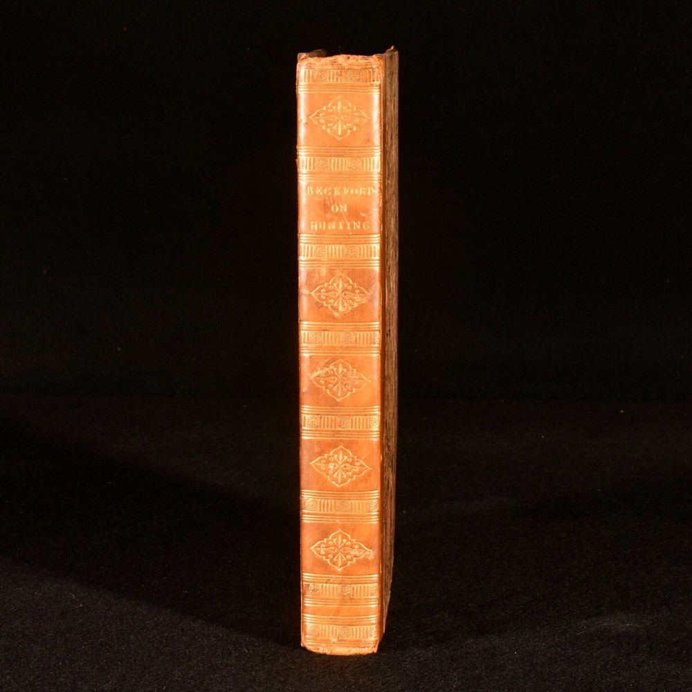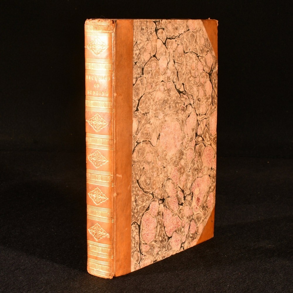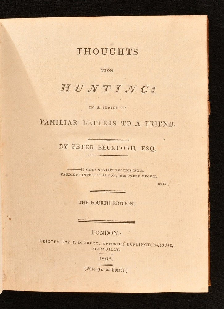 Click here to see our other books! Thoughts Upon Hunting: In a Series of Familiar Letters to a Friend Peter Beckford 1802 J. Debrett : London 8" by 6.5" xiv, [1], 16-360pp. SUMMARY The fourth edition of Peter Beckford's important and thorough work on hunting, clearly and eloquently presenting his thoughts on the sport, writing to a less-knowledgeable friend. Illustrated,Leather Binding Overall Condition: Good This book weighs 1 KG when packed UK Postage: £ 3.99 US Postage: £ 22.99 EU Postage : £ 16.99 European Postage: £ 17.99 Asia Postage: £ 22.99 Worldwide Postage: £ 28.99 DESCRIPTION The fourth edition. First published in 1781. Bound in half calf with marbled paper-covered boards. Written by British writer and politician, Peter Beckford, who was a prominent member of the fox hunting community in England. As a very keen hunter, Beckford wrote 'Thoughts Upon Hunting', which received great popularity in the field and became a standard and timeless guide to the sport. 'Thoughts Upon Hunting' is written as a series of letters to a friend who is less versed with the sport, providing a number of tips on the many varied aspects. Illustrated with a plan and elevation of stables, both to the rear of the work. Lacking the frontispiece. With the bookplate of 'Vive ut Vivas' and ink inscriptions of Charles J Coles, 1867, and A. Wykeham Musg---, dated 1911. CONDITION Bound in half calf with paper-covered boards. Externally, very good, with light rubbing to the extremities and joints. Paper lifting slightly to extremities of rear board. Hinges are a touch strained, but holding firm. Bookplate to front paste down with ink inscriptions to front endpaper. Endpapers renewed. Internally, firmly bound. Pages very bright and clean. Lacking frontispiece. Light tide mark causing slight discolouration to plates. Overall Condition: Good GLOSSARY OF TERMS Overall Condition (Dustwrapper condition rating is shown after that for the book itself, where a dustwrapper is present) Fine - Very well preserved copy showing very little wear Very Good Indeed - Only one or two minor faults, really a very attractive copy Very Good - Quite a wide term meaning no major faults but probably several smaller ones often expected given the age of the book, but still a respectable copy Good - Meaning not very good. Some more serious faults as will be described in the condition report under 'condition' Good Only - Meaning one or more faults that could really do with repair Fair - As with good only above but with other faults leaving a compromised copy even after repair Poor - Really bad and possibly seriously incomplete. We only sell books in this condition where their rarity or value makes them attractive none the less. Major defects will be described. GUARANTEE We offer a full money back guarantee on our descriptions. Please ask for details and conditions. We prefer PAYPAL. If you pay via PAYPAL we will post the item off the same or the next working day with the postage you have selected. Please note we cannot accept USD cheques