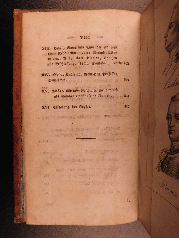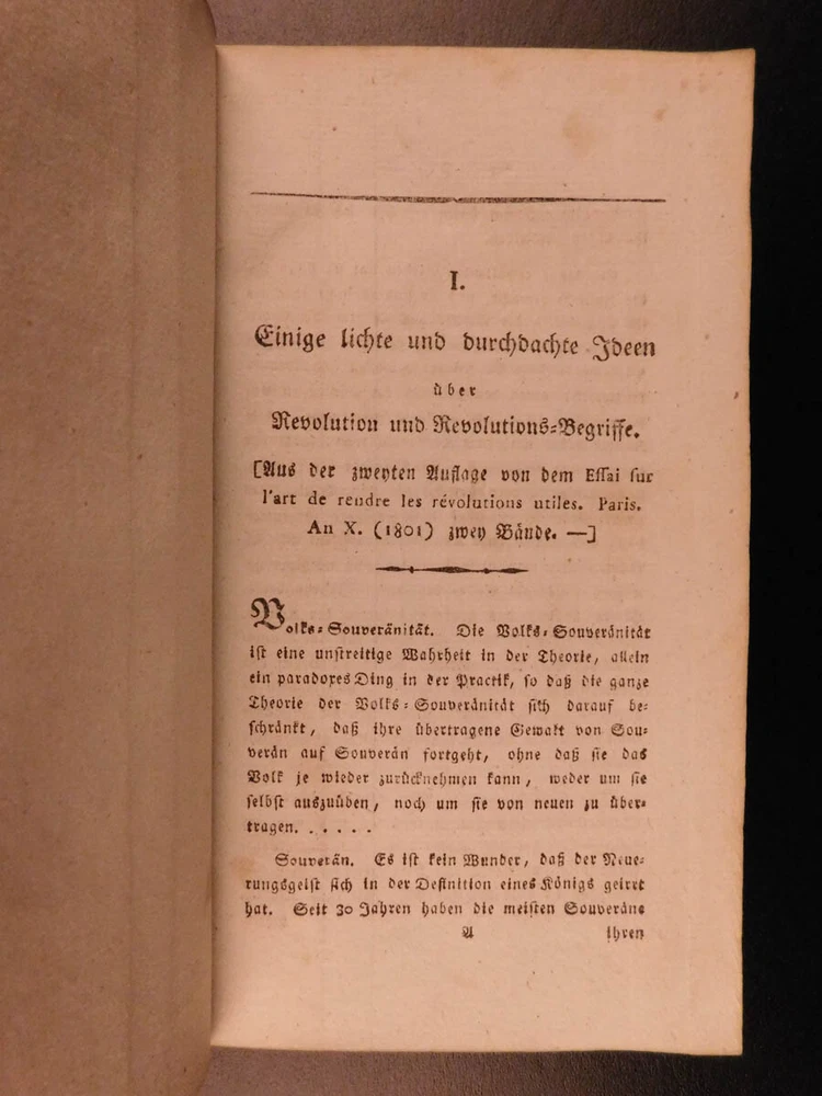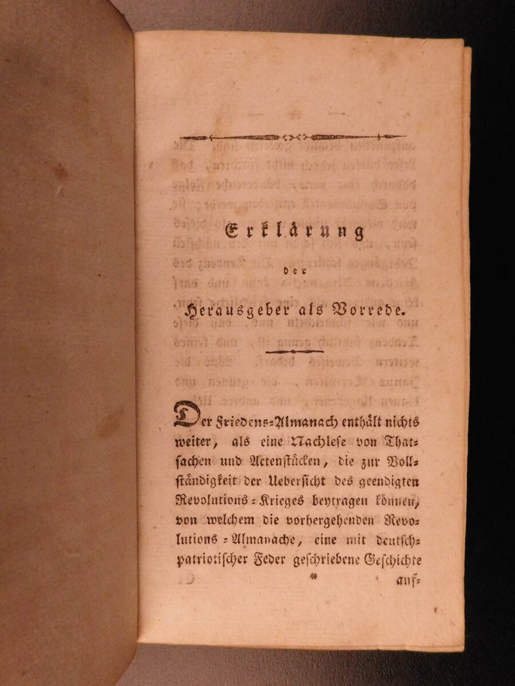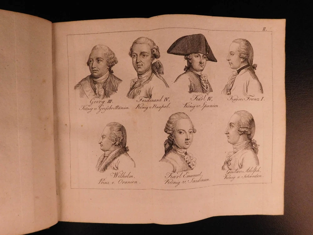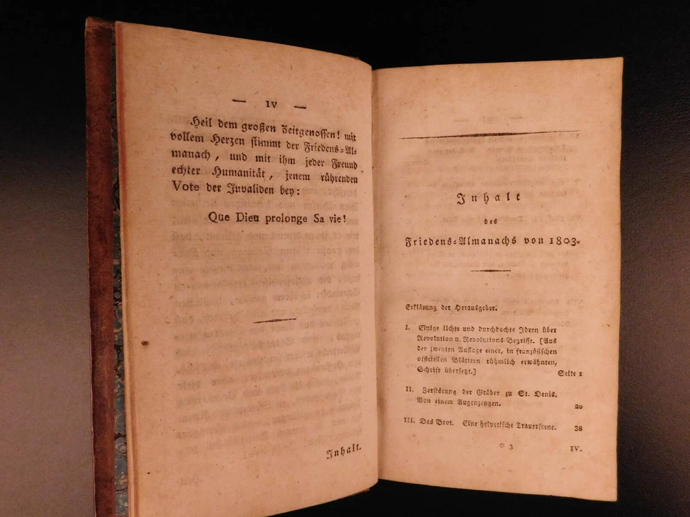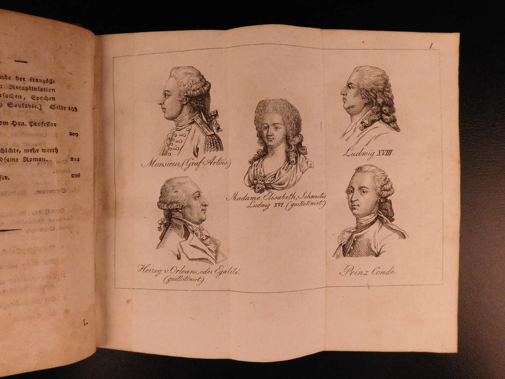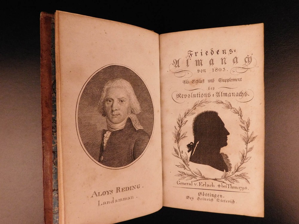 1803 Almanac anti-French Revolution Propaganda Portraits Politics Louverture The ‘Friedens-Almanach of 1803’ or ‘Peace Almanac’ was one of the concluding volumes from one of the most credible and successful anti-revolutionary publications series of all time. This German periodical was published to encourage readers to go against the political goals of the French Revolution. This volume includes portrait engravings of dozens of European political and military figures. Item number: #7925 Price: $599 various Friedens-Almanach von 1803: Als Schluss und Supplement des Revolutions-Almanachs Göttingen: Dieterich, 1803. Details : · Collation: Complete with all pages o [2], VIII, 228 o 21 engraved plates · Language: German · Binding: Leather; tight & secure · Size : ~6in X 3.5in (15cm x 9cm) Our Guarantee: Very Fast. Very Safe. Free Shipping Worldwide. Customer satisfaction is our priority! Notify us with 7 days of receiving, and we will offer a full refund without reservation! 7925