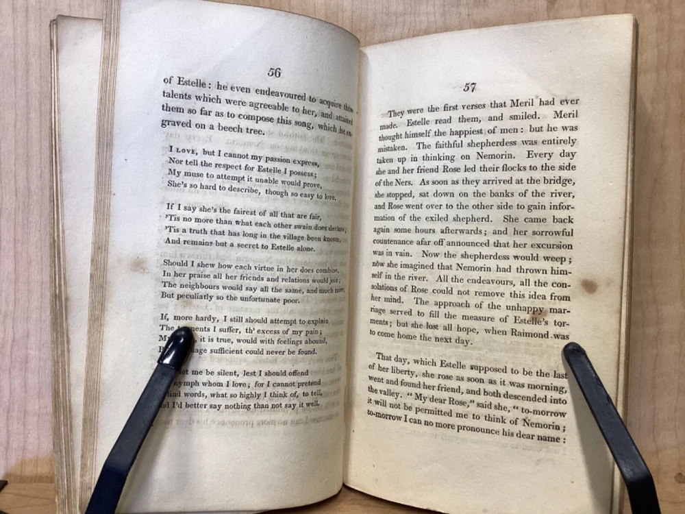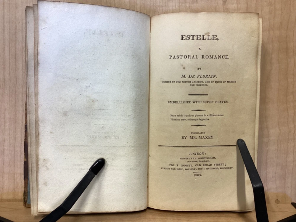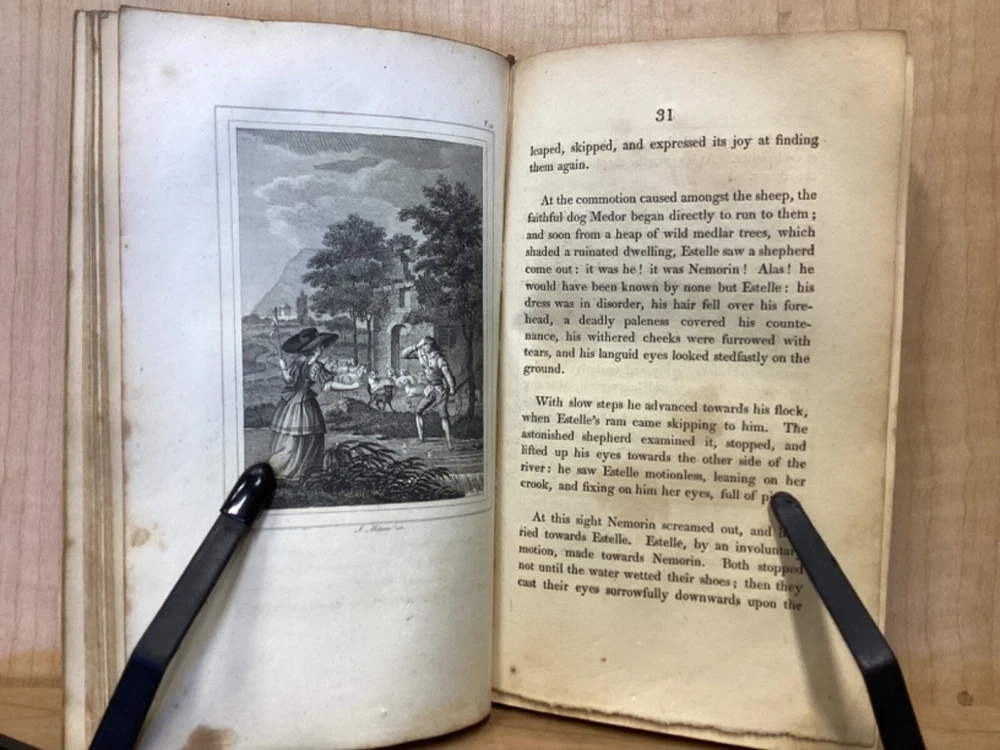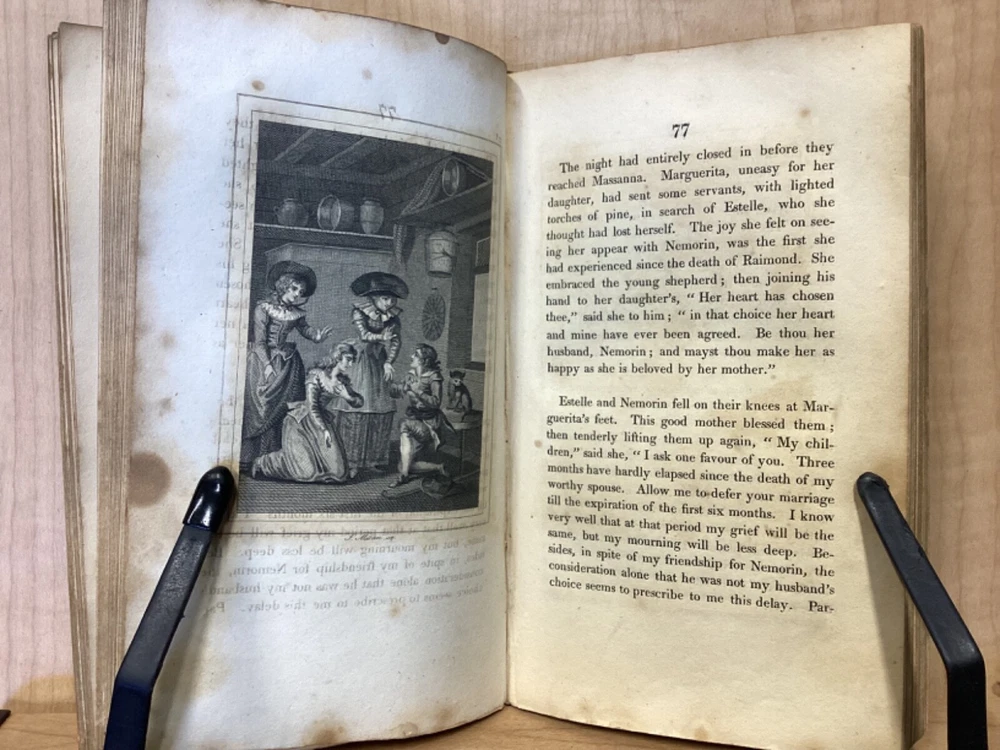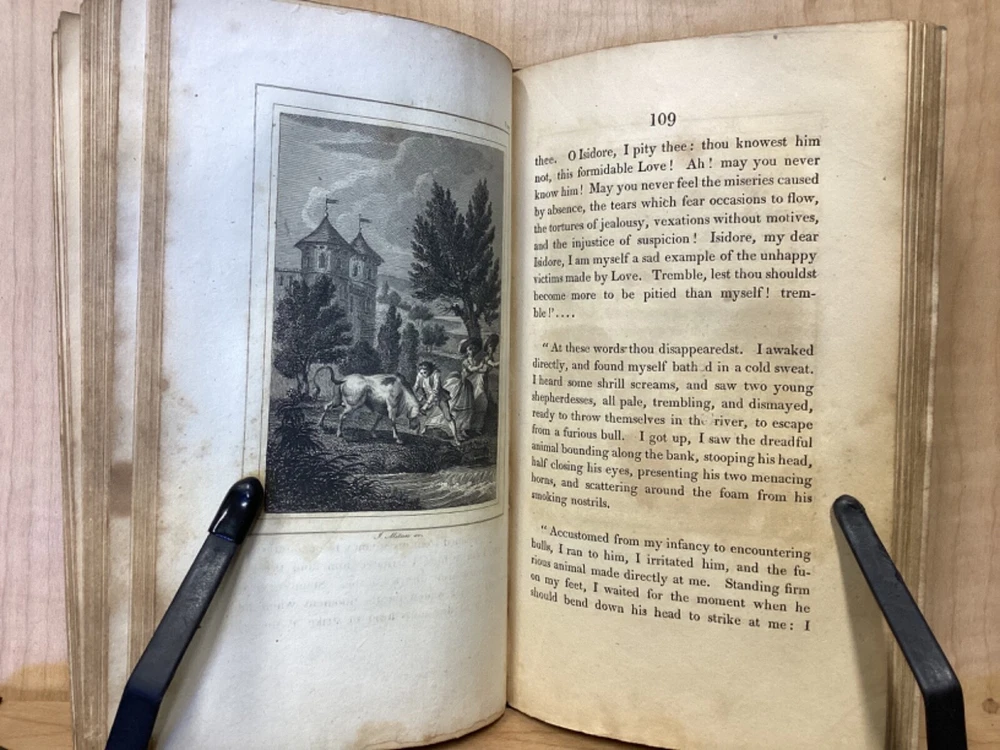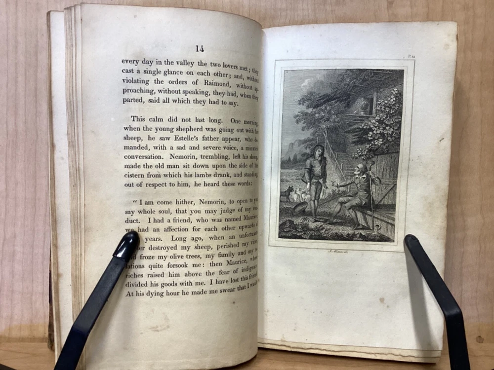 Estelle, A Pastoral Romance by M. De Florian, Translated by Mr. Maxey, C. Whittingham, London, 1803, 181pp, leather, 4 x 6.5, 18mo Fair condition. Front board is completely detached from binding. Wear and chipping to front and rear boards. Most of gilt borders are still intact. Tips are bumped and edges are scuffed. Chipping and cracking to spine, but still legible. Includes frontispiece. Toning, age-staining, and tea-staining throughout textblock. Includes illustrations. Please see photos. Drawing on Roman mythology, Estelle is a narrative of female desire, duty, and sacrifice - one in which the heroine's life path is dictated not by following her own heart, but by giving up her love in order to fulfill a bond of honor between her father and a man who saved him. The novel has all of the qualities the English so often marked as detrimental to young female minds. FORN-MSB-0224-TUB0010-JC244