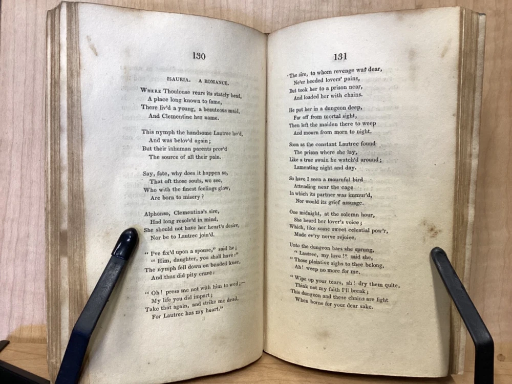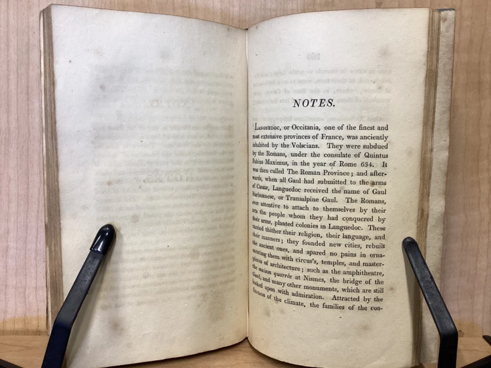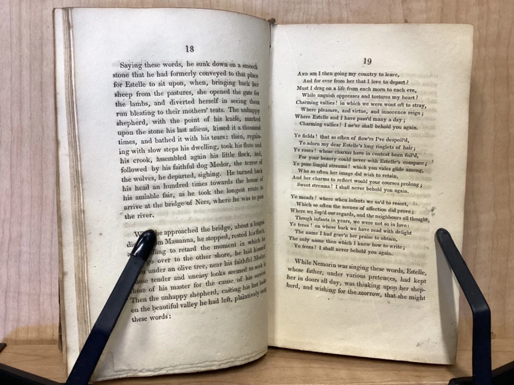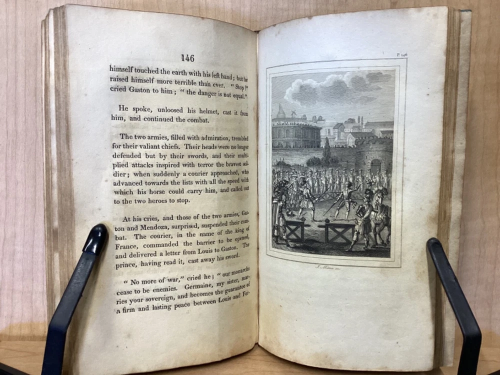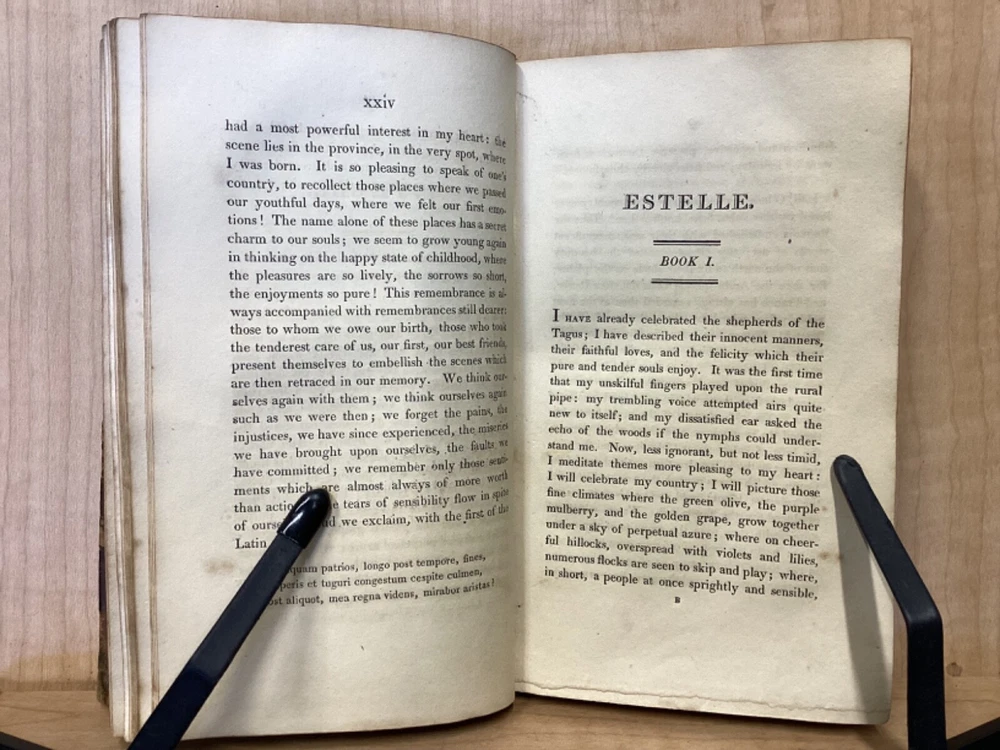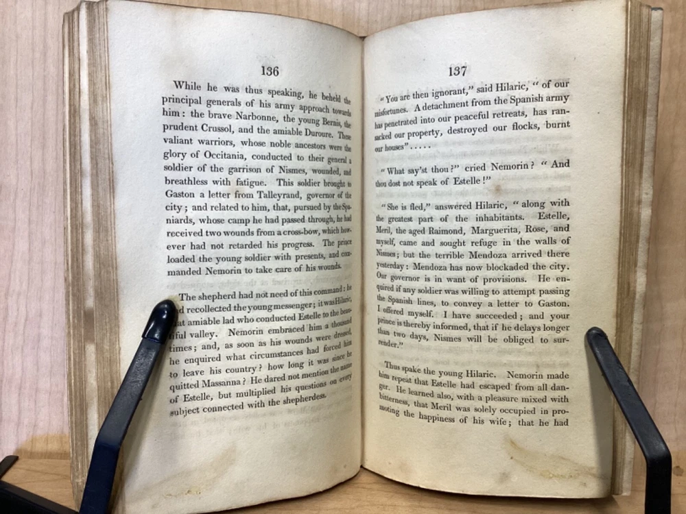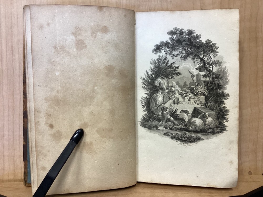 Estelle, A Pastoral Romance by M. De Florian, Translated by Mr. Maxey, C. Whittingham, London, 1803, 181pp, leather, 4 x 6.5, 18mo Fair condition. Front board is completely detached from binding. Wear and chipping to front and rear boards. Most of gilt borders are still intact. Tips are bumped and edges are scuffed. Chipping and cracking to spine, but still legible. Includes frontispiece. Toning, age-staining, and tea-staining throughout textblock. Includes illustrations. Please see photos. Drawing on Roman mythology, Estelle is a narrative of female desire, duty, and sacrifice - one in which the heroine's life path is dictated not by following her own heart, but by giving up her love in order to fulfill a bond of honor between her father and a man who saved him. The novel has all of the qualities the English so often marked as detrimental to young female minds. FORN-MSB-0224-TUB0010-JC244