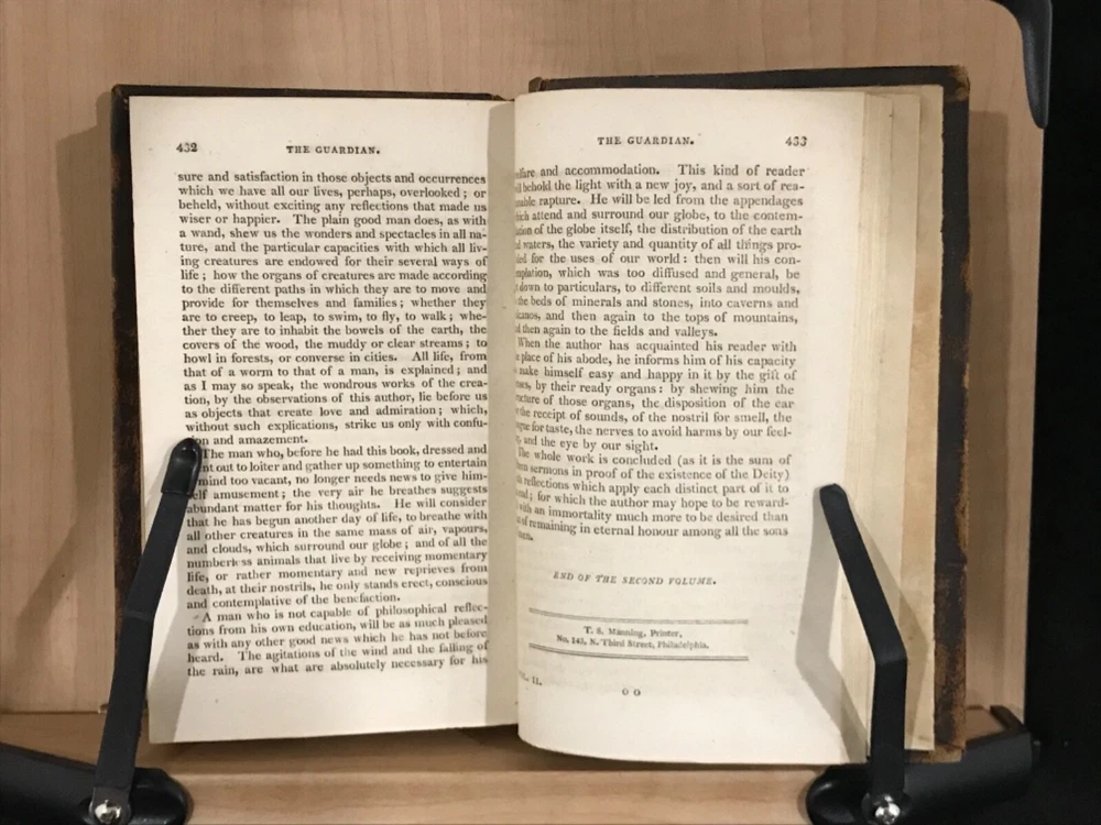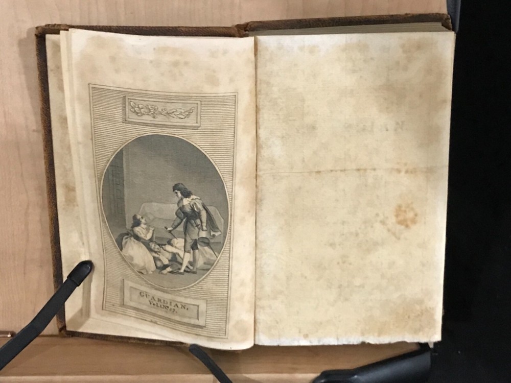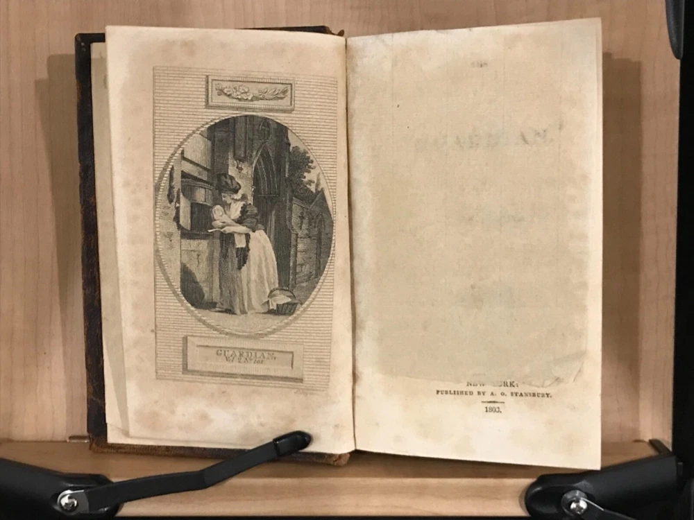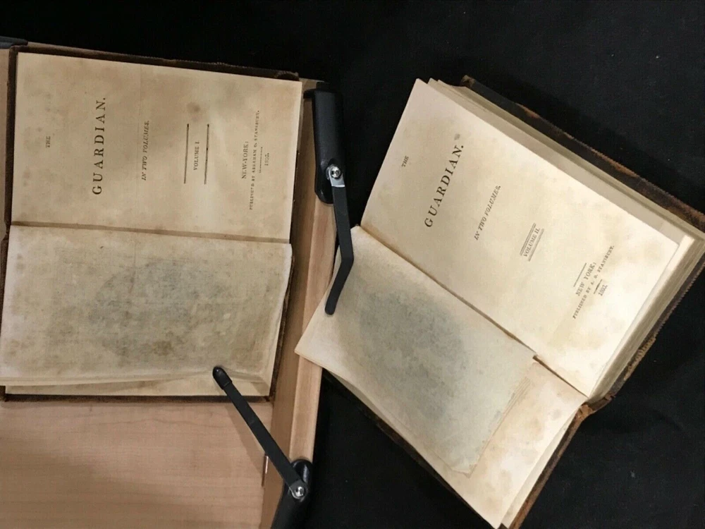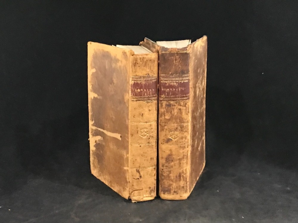 The Guardian was a shortage-lived paper published in London from March 12 to October 1 of 1713 by Richard Steele with contributions from Joseph Addison, Thomas Tickell, Alexander Pope and Ambrose Philips. It contained miscellaneous anecdotes, stories and reviews concerning 18th century London. This pair of volumes have leather bindings and scuffed edges with the name “Luther Loomis/New York/1812” inside. Loomis was a successful businessman in New York and Connecticut. The volumes are in good condition with solid blocks. Both have nice frontispieces which seem to be topical commentary and an occasional illustration with one of these having a decoration by Loomis on the verso (see photo). There is foxing throughout both volumes and some slight damage to the spines. Nice pair of volumes with commentary on the literary society of 18th century London. Good Condition: 12mo: full leather with scuffing and rub to both: peeled strip on back of both: both volumes have reddish-brown labels with gilt lettering and gilt decorations: spine are quite rubbed with volume one having slight damage to the tail, causing a small section at the bottom rear to be lifted (about an half an inch) and the beginning of a split at the hinges: cracked inside hinges at front: name inside front on free endpaper in ink in both volumes and at rear of volume one in pencil: engraved frontispiece in both and at least one additional illustration in each: slightly bent corners with loss of material: “The Guardian in Two Volumes”: Richard Steele, Joseph Addison, et al: New York: A(braham) O. Stansbury Publisher: T.S. Manning, Philadelphia, Printer: 1803. COLL1803ADFA