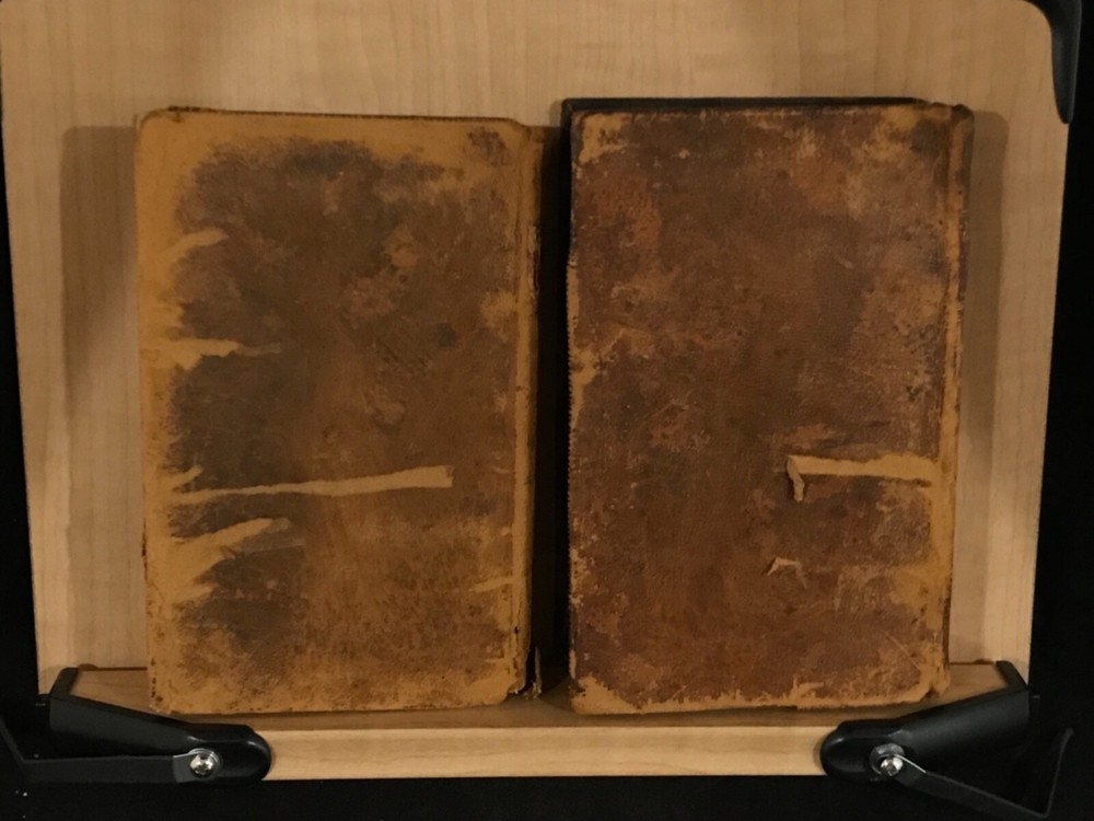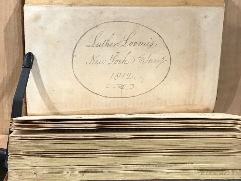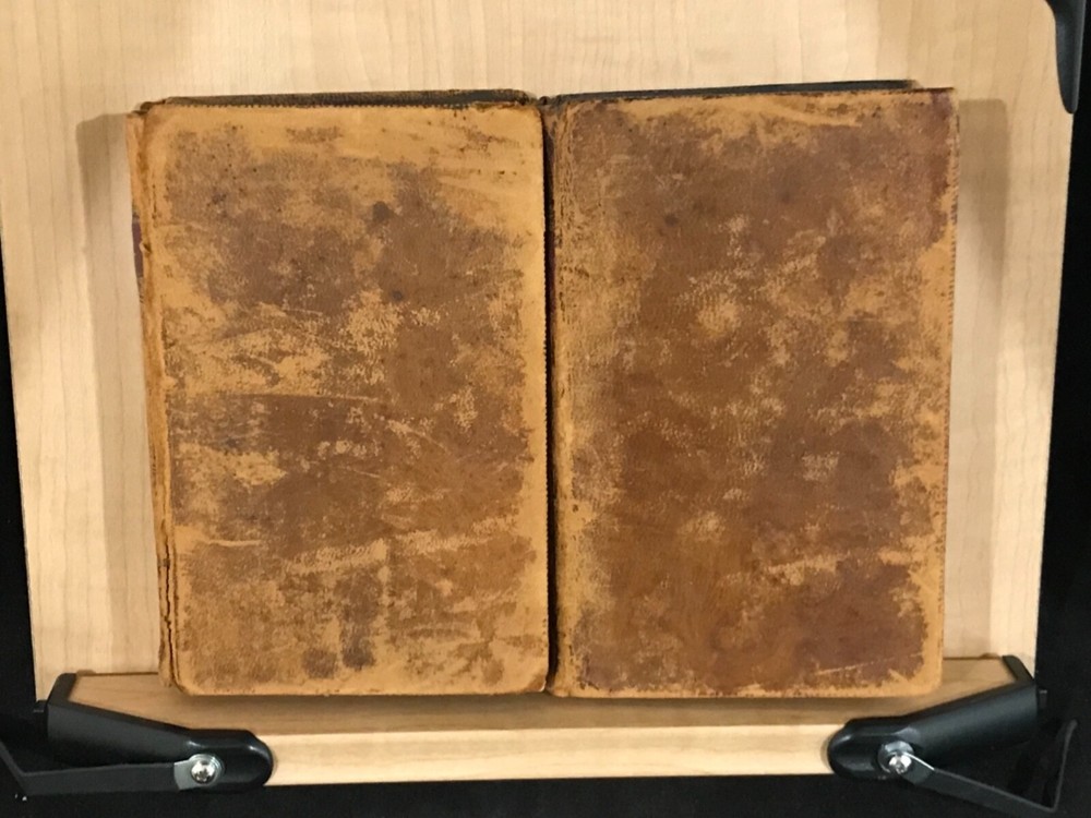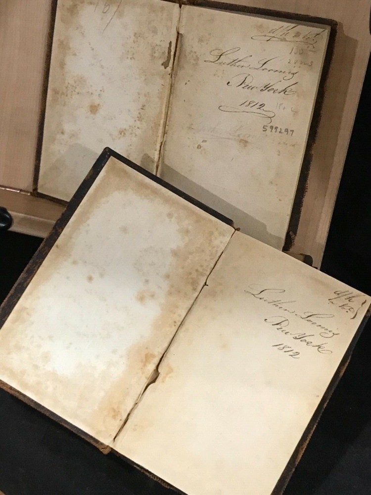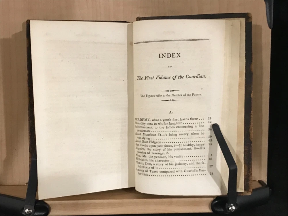 The Guardian was a shortage-lived paper published in London from March 12 to October 1 of 1713 by Richard Steele with contributions from Joseph Addison, Thomas Tickell, Alexander Pope and Ambrose Philips. It contained miscellaneous anecdotes, stories and reviews concerning 18th century London. This pair of volumes have leather bindings and scuffed edges with the name “Luther Loomis/New York/1812” inside. Loomis was a successful businessman in New York and Connecticut. The volumes are in good condition with solid blocks. Both have nice frontispieces which seem to be topical commentary and an occasional illustration with one of these having a decoration by Loomis on the verso (see photo). There is foxing throughout both volumes and some slight damage to the spines. Nice pair of volumes with commentary on the literary society of 18th century London. Good Condition: 12mo: full leather with scuffing and rub to both: peeled strip on back of both: both volumes have reddish-brown labels with gilt lettering and gilt decorations: spine are quite rubbed with volume one having slight damage to the tail, causing a small section at the bottom rear to be lifted (about an half an inch) and the beginning of a split at the hinges: cracked inside hinges at front: name inside front on free endpaper in ink in both volumes and at rear of volume one in pencil: engraved frontispiece in both and at least one additional illustration in each: slightly bent corners with loss of material: “The Guardian in Two Volumes”: Richard Steele, Joseph Addison, et al: New York: A(braham) O. Stansbury Publisher: T.S. Manning, Philadelphia, Printer: 1803. COLL1803ADFA