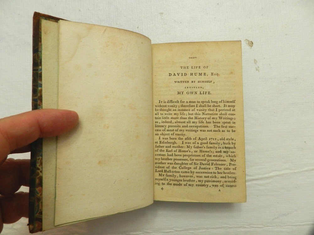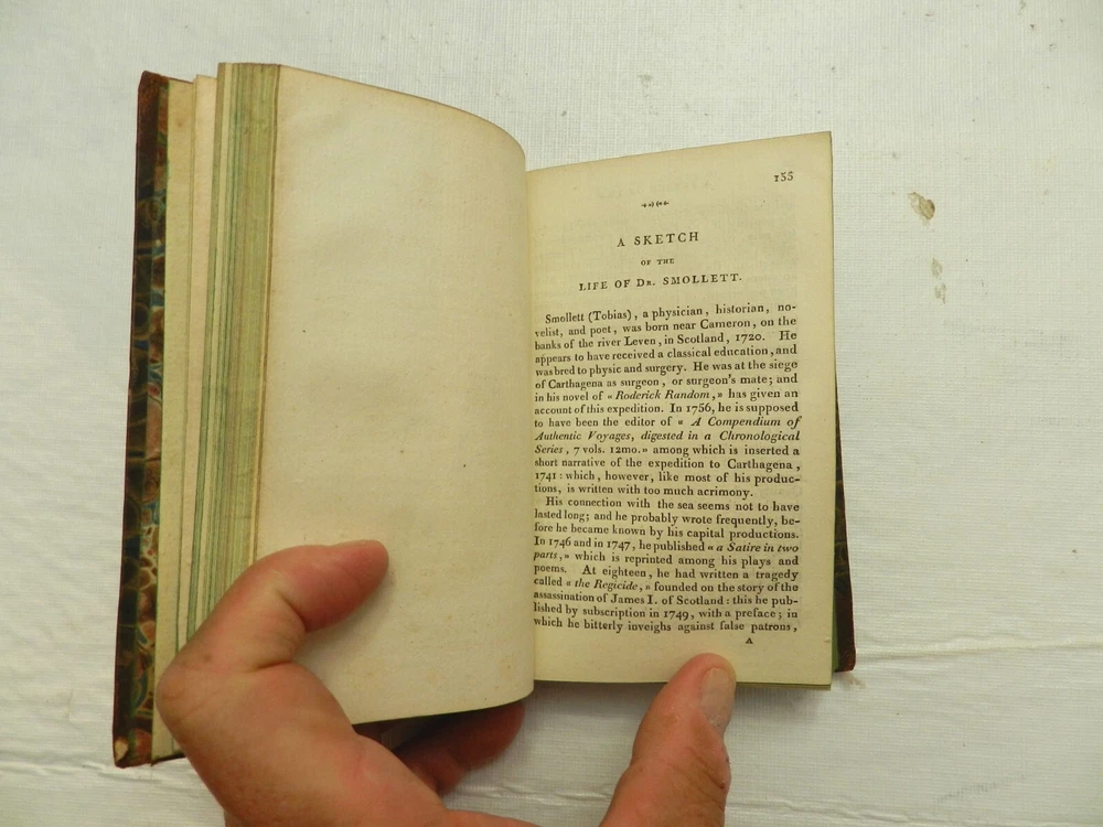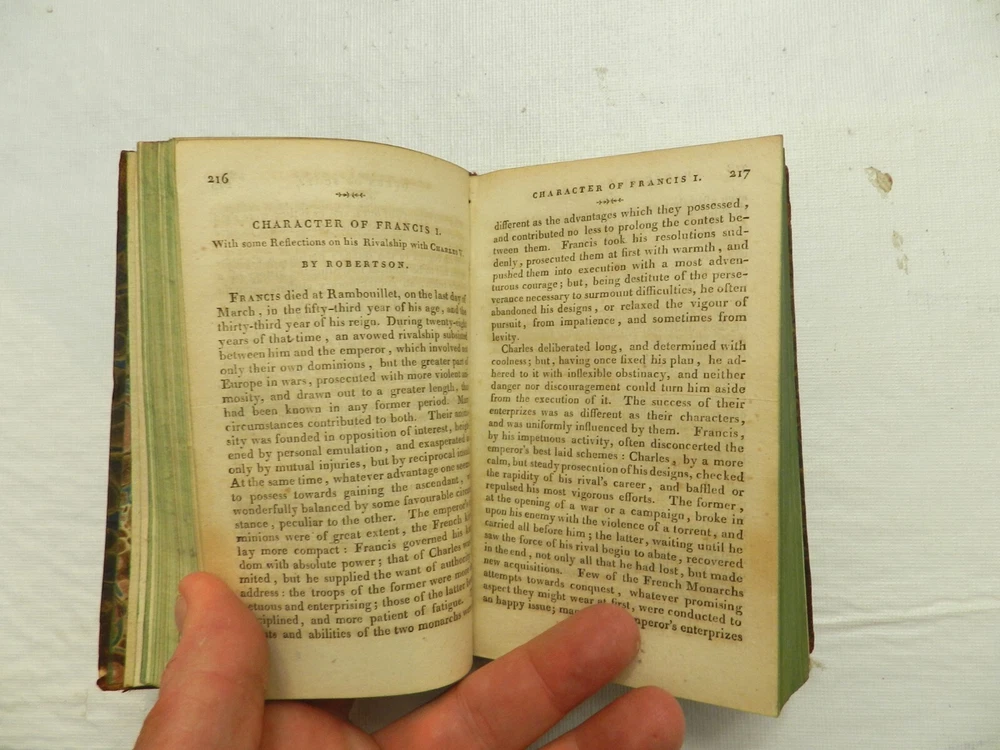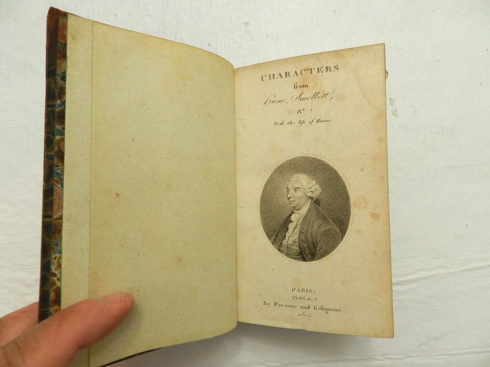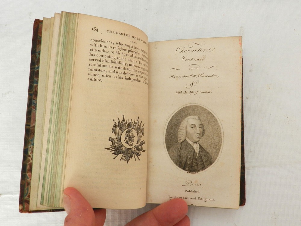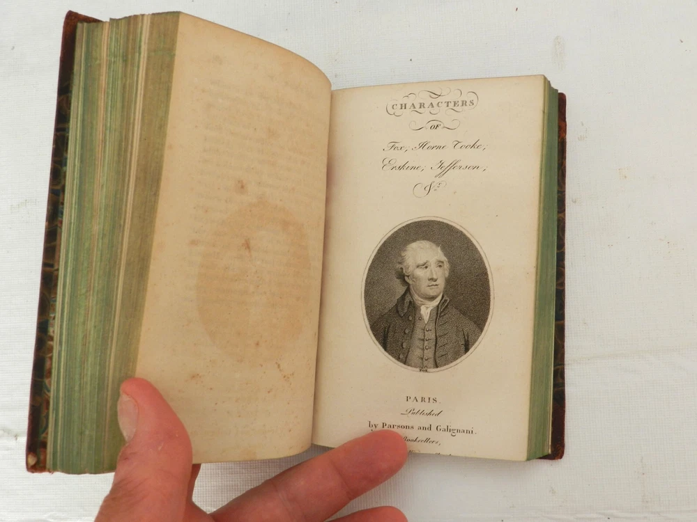 I'm unable to learn a lot about this 200+ year-old book from the internet. It is part of a uniform set - I have another from this set which I'll be listing separately. I am unable to ascertain the author, the publisher is Parsons and Galignanni, and it was published in 1804. The closest comparable I could find is from Worldcat is titled, "Characters from Hume, Smollett etc. : with the life of Hume and Smollettz" which has the same publisher and date but obviously not the same title. This book curiously has a number of similar title pages. The book starts with, "The Life of David Hume.." shown in the listing photo, which is page 83. Then, opposite page 154 is another title page, "Characters Continued From Hume, Smollett, Clarendon, etc. : with the life of Smollett", same publisher and I think year of publication - the page is cutoff (see listing photo). Pagination continues to page 226 and then there's a new title page and new pagination. The new title page is, Characters of R.H.W. Pitt and R.B. Sheridan, same publisher and year (not shown in listing photo). This continues for 82 pages and then a new title page and new pagination begins again. The next book is titled, Characters of Fox; Horne: Cook; Erskine; Jefferson, etc. , same publisher but year is cut out entirely (shown in listing photo). This final book goes to page 159. The book is in GOOD CONDITION. Leather spines and corners; it appears a piece of repair leather was affixed to spine. Marble boards with moderate edge and top/bottom spine wear, light edge wear. Marble endpapers, green pages, very solidly bound. B61