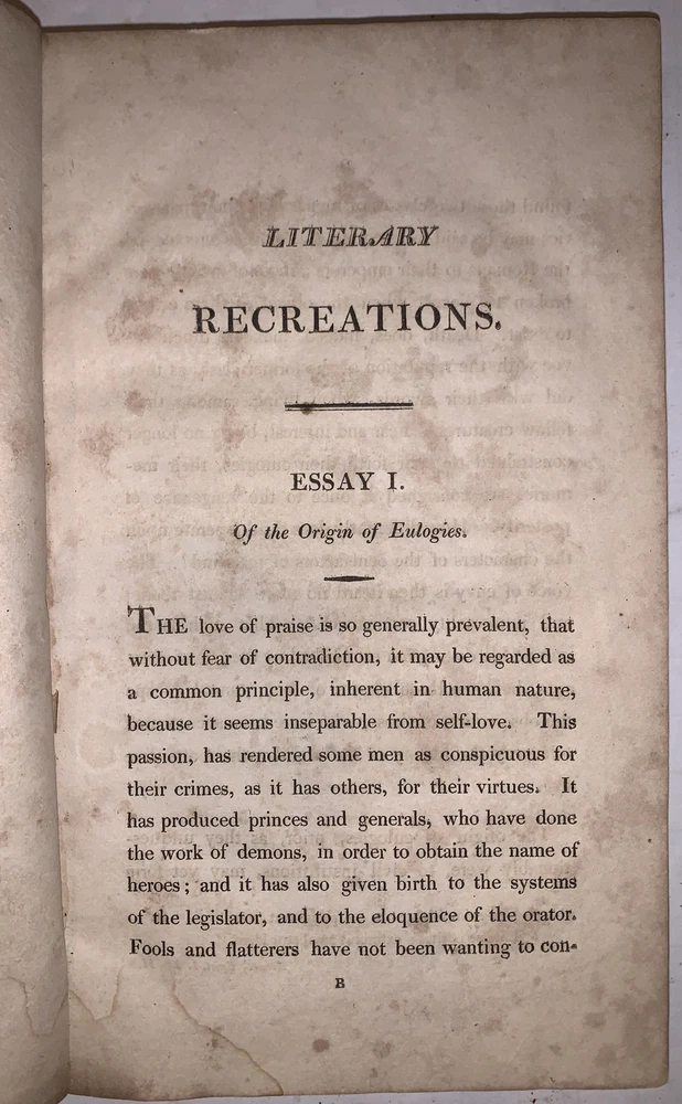 Literary Recreations by Henry Card, A. M. of Pembroke College, Oxford. London: Printed by W. Wilson for Longman, Hurst, Rees, and Orme 1809 First Edition Octavo, 299, [4] pages, bound in period full leather. Two neat bookplates from previous owners. Both boards detached, loss to spine, some rubbing and wear, foxing and discoloration, else in good condition. If you have any questions feel free to ask and don't forget to check out my other listings.