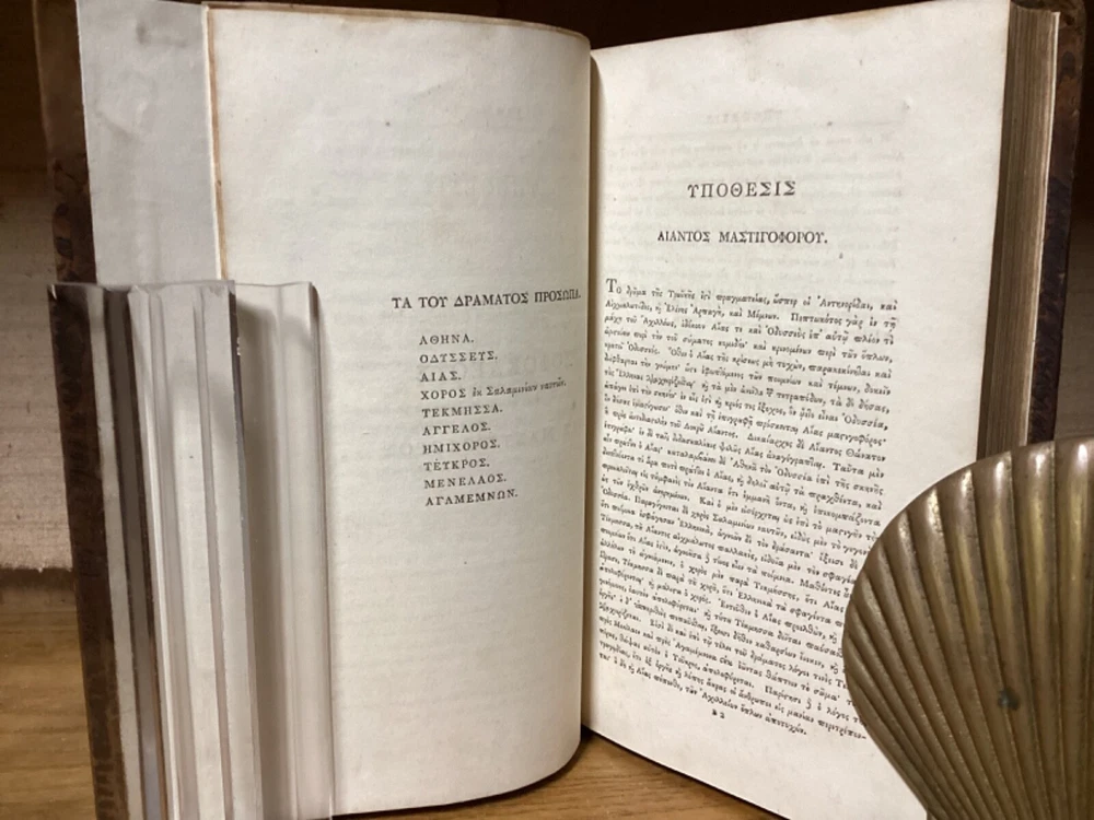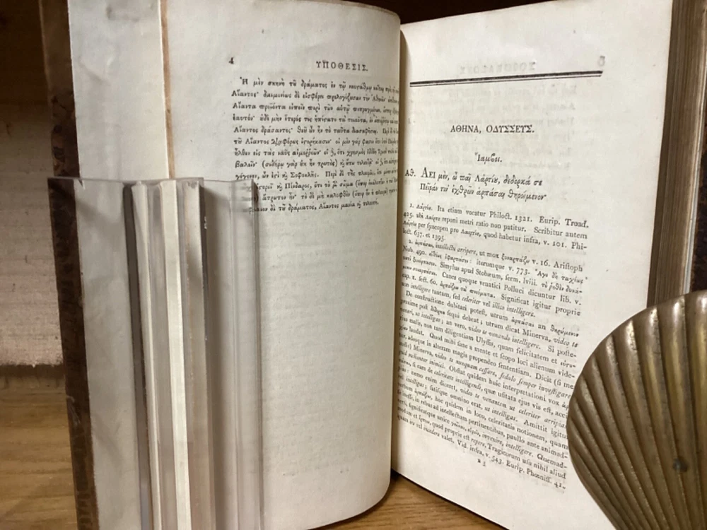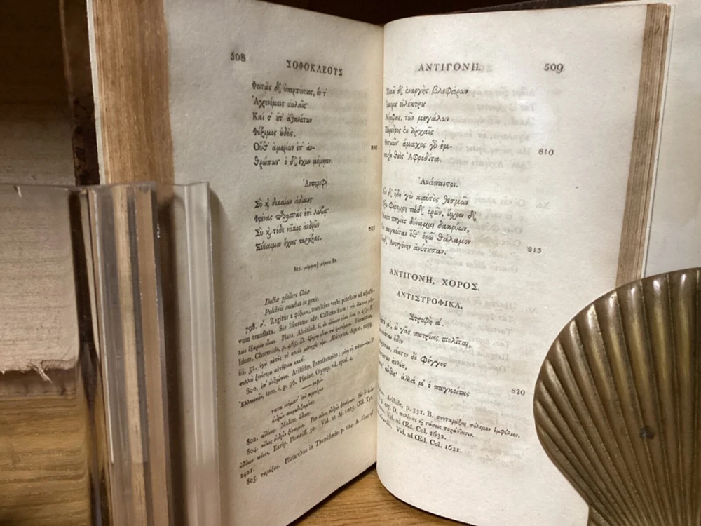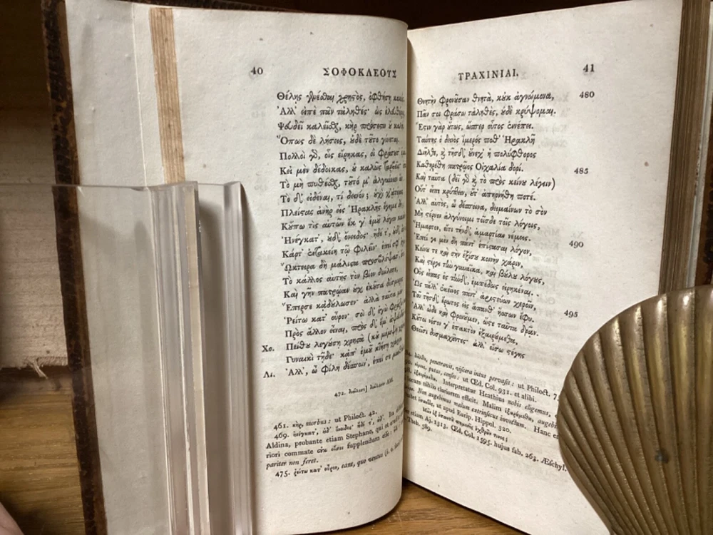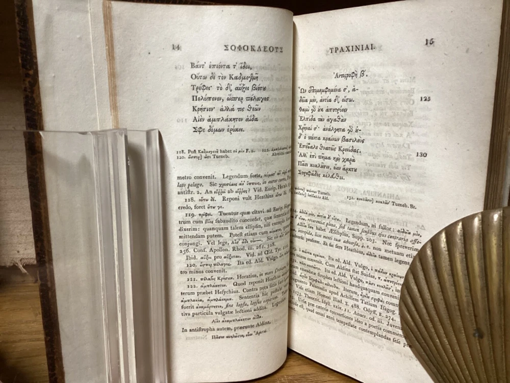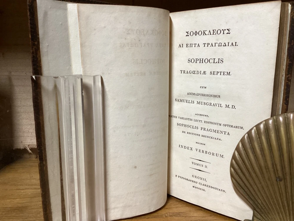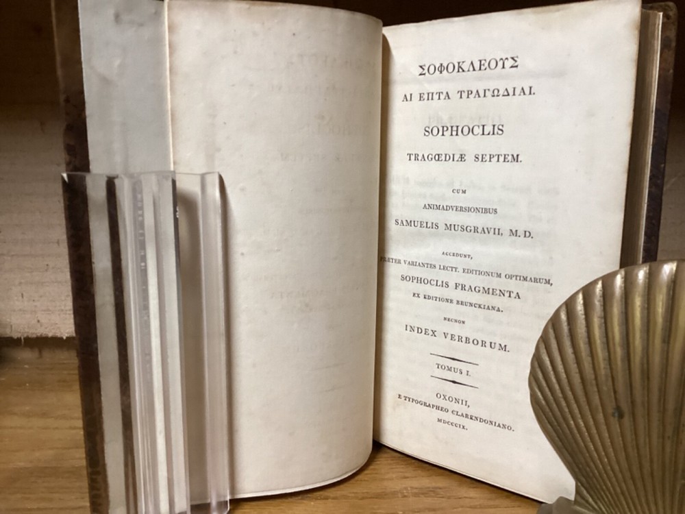 Sophoclis Tragoedie Septem. By Samuel Musgrave and printed in Oxford at the Clarendon Press. 1809, two volumes. 552 and 440 pp. 8.5” x 5.5”. Hardcover full leather. In good condition, with light wear to leather. Nicely rebacked, with title labels reaffixed to modern leather spine. Hinges remain in good condition and text blocks remain bound well. Some added end pages. Light markings. General age-related toning to pages, along with periodic foxing and wear. Please see photographs and ask any questions prior to purchasing. An attractive set of the tragedies of Sophocles. By English classical scholar and physician Samuel Musgrave (1732-1780). COLC1809BHIX