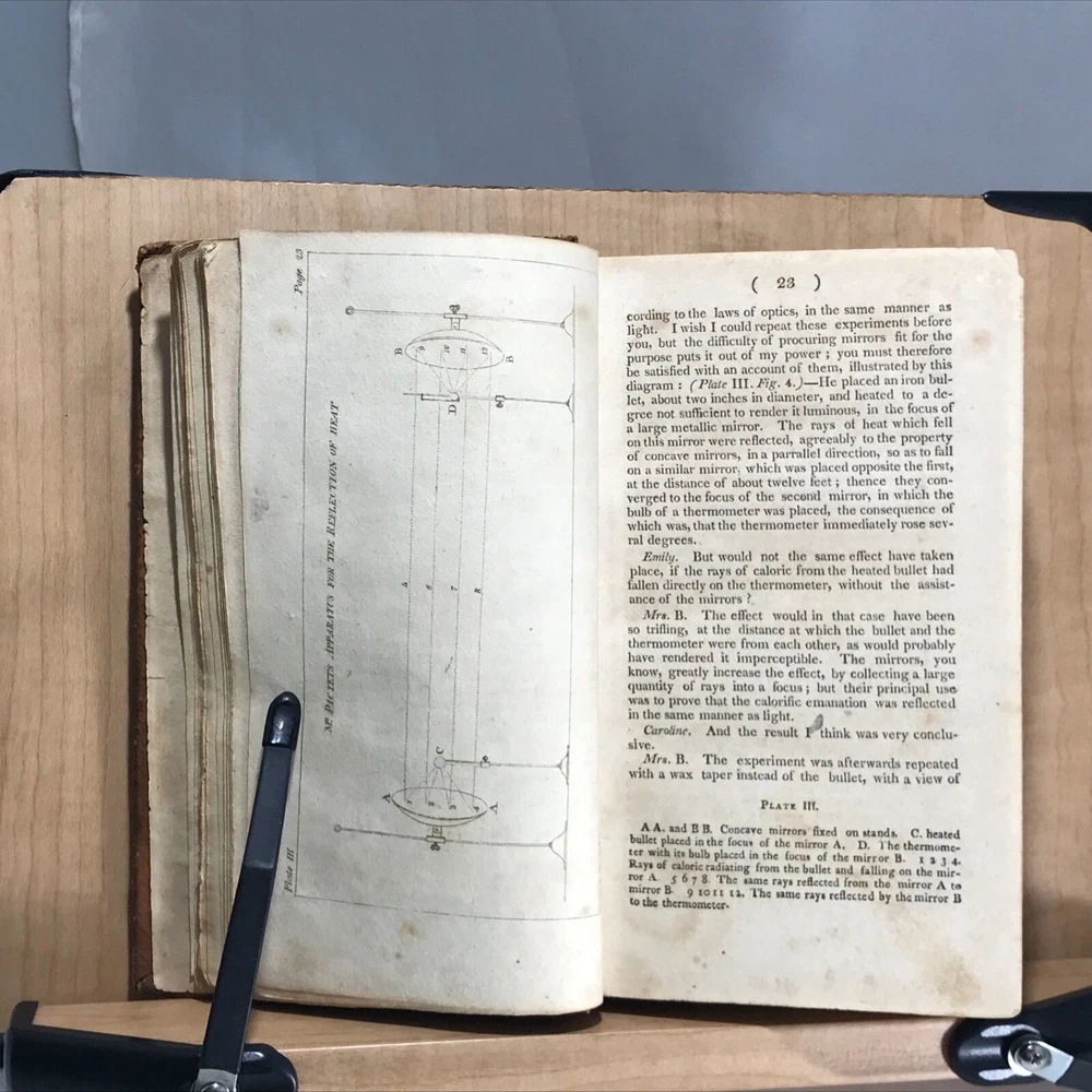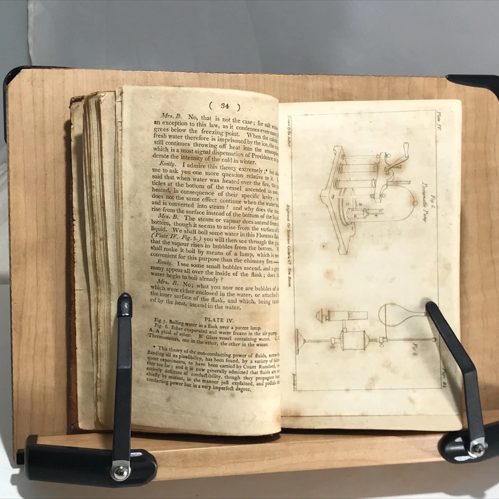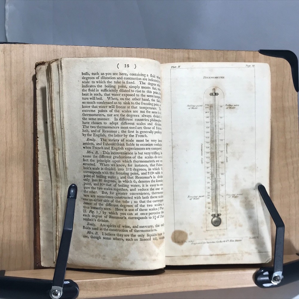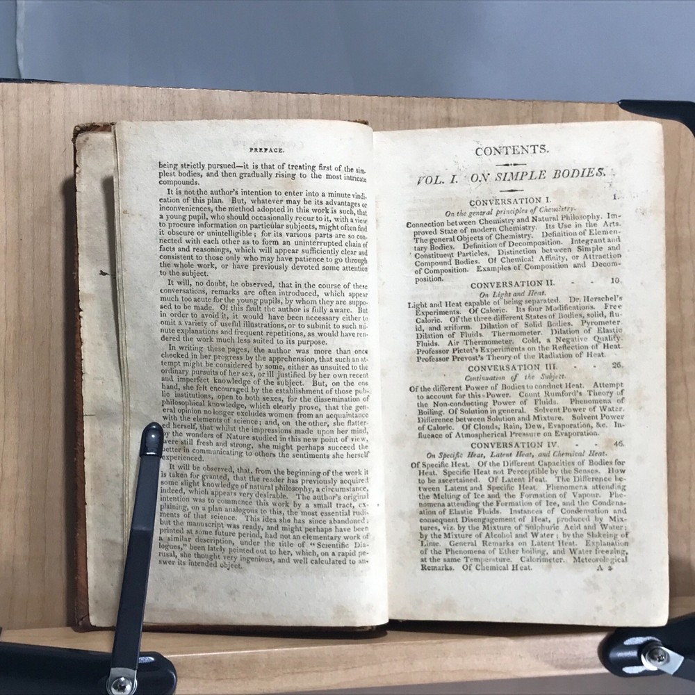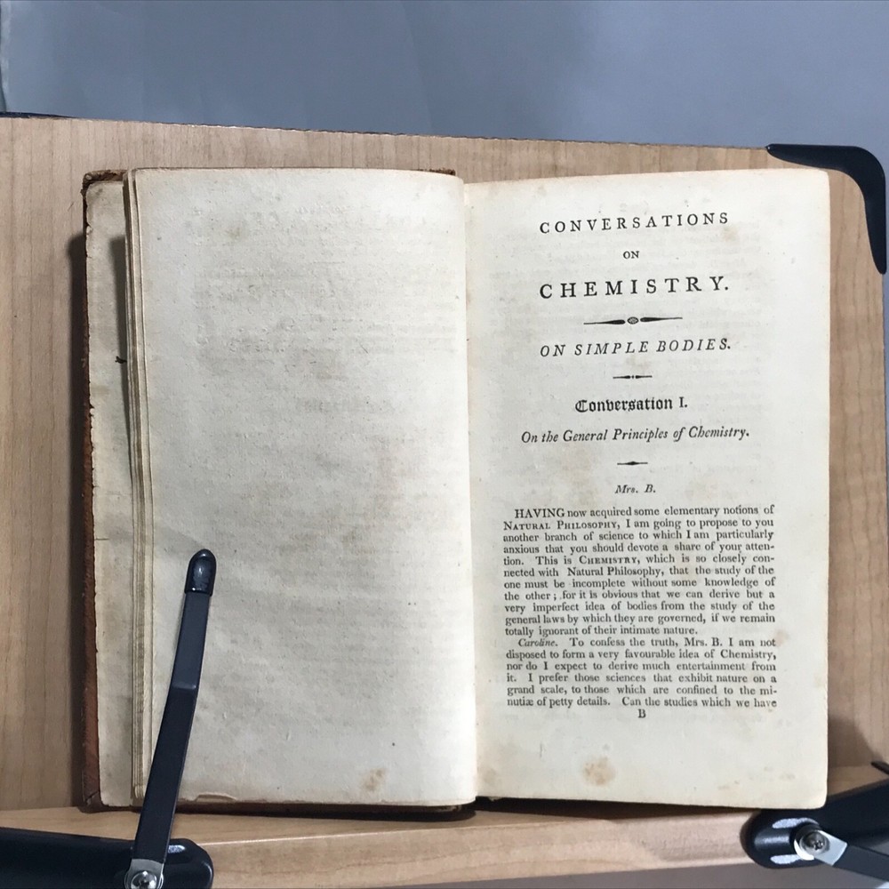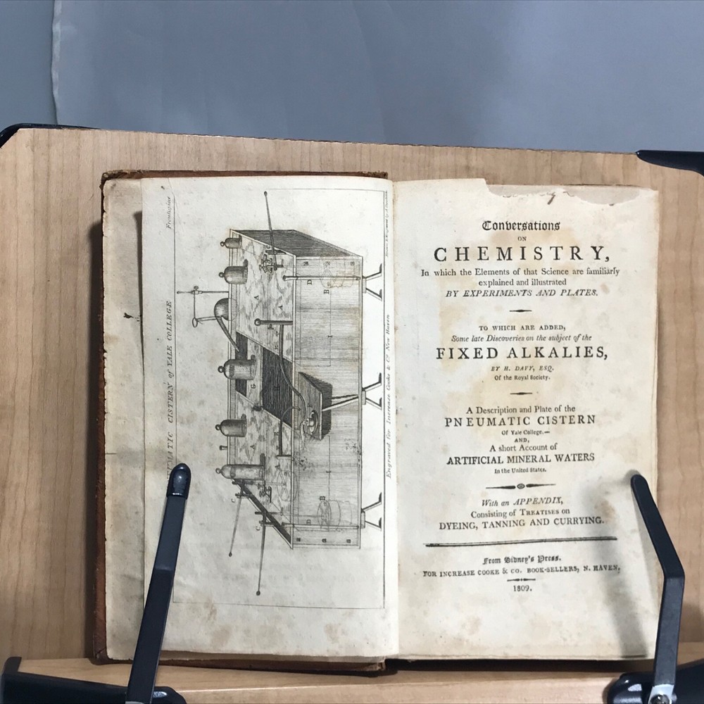 Conversations on Chemistry, In which the Elements of that Science are familiarly explained and illustrated by Experiment and Plates. To Which are Added, Some late Discoveries on the subjects of the Fixed Alkalies, by H. Davy. A Description and Plate of the Pneumatic Cistern of Yale College — and, a Short Account of Artificial Mineral Waters in the United States with an Appendix, Consisting of Treatises on Dyeing, Tanning and Currying, From Sidney’s Press. For Increase Cooke & Co. Book-sellers, N. Haven, 1809, 357 pp plus appendix and publisher’s list, full leather, 4.5 x 7.5”, 12mo. In good condition. Nice original leather. Typical scuffing with rounded corners. Light creasing and cracking along spine. Four small bore holes from worm damage on top compartment of spine. Lightly cracked rear hinge along bottom compartment exposing binding. Small patch of old-repaired leather on rear board. Torn front fly leaf. Text block typically toned with moderate foxing. Binding slightly shaken, but intact. Unmarked. Please see photos. New Haven edition with Yale frontis. Possibly first American edition? Born in London to Swiss parents, Jane Marcet married John Gaspard Marcet in 1799. Although published anonymously, this work was quickly recognized to be by Mrs. Marcet. It is written in an easy dialogue style, in which Marcet “Mrs. B” instructs two young ladies in the principles and discoveries of modern chemistry. Evidently printed in a small number, the first edition is quite rare. Most copies were handled by young people and were literally read to pieces. RAREA1809CIKA