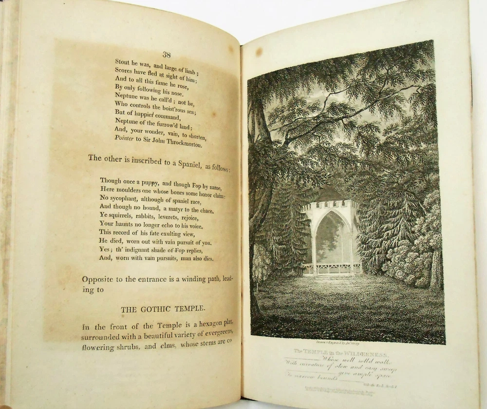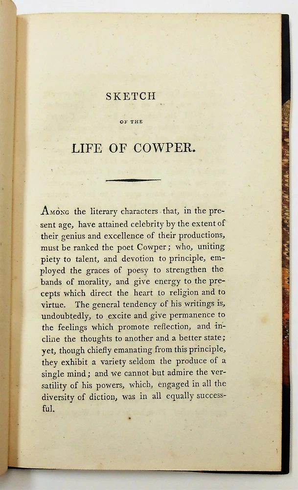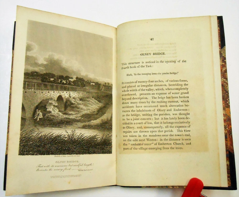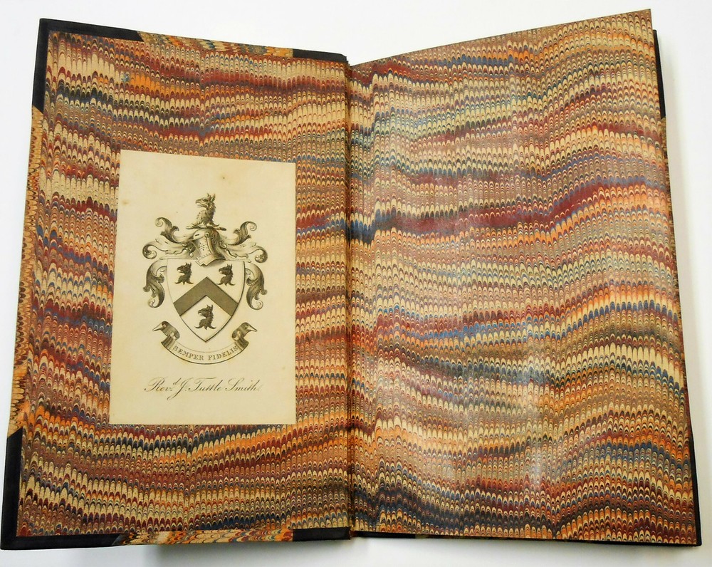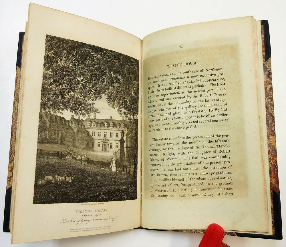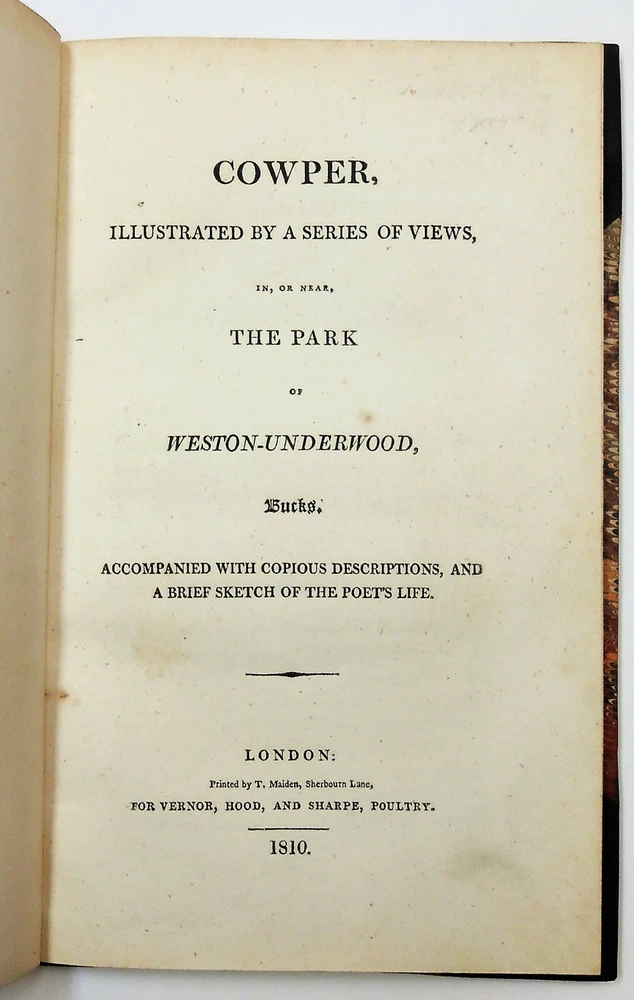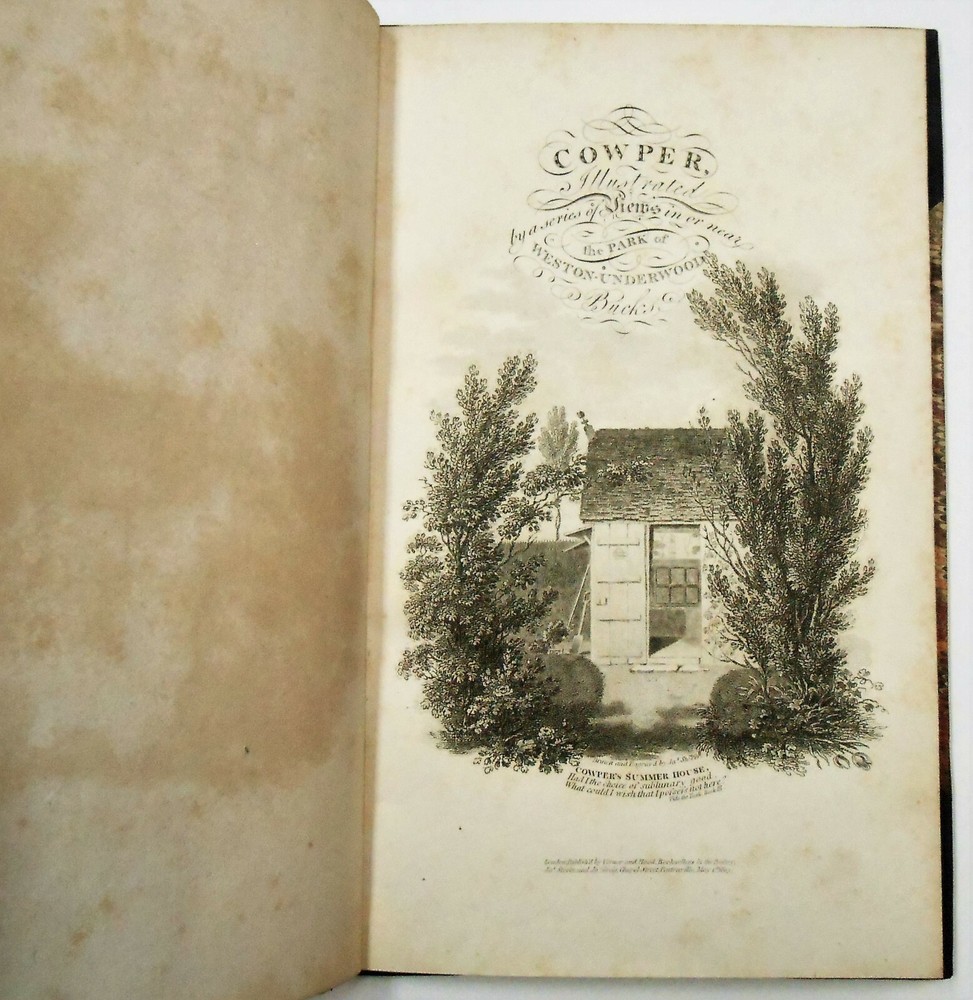 Cowper, Illustrated By A Series Of Views, In, Or Near, The Park Of Weston-Underwood, Bucks, Accompanied With Copius Descriptions, And A Brief Sketch Of The Poet's Life, uncredited, but text is attributed to Edward Wedlake Braykey and illustrations by James Storer. Published for Vernor, Hood, And Sharpe, Poultry, London. Print date 1810. 48 pages. Three quarter calf over marbled boards. There is only light rubbing at corners and spine, heavier at bottom rear corner. Spine has five raised bands and bright gilt lettering and decoration. Endpapers and page edges are also marbled. There is a bookplate at front from Rev. J. Tuttle Smith who was a Civil War hymnist, as well as active in other religious activities. Hinges are intact and binding is tight. Pages are of supple rag paper and are clean but for ink offsetting and occasional foxing. There are 12 single-sided black and white illustrations, There is also an illustrated title page from a previous edition (1803) that precedes the main title page. The first 23 pages are a biography of William Cowper. The rest is comprised of 12 "views" of scenic areas, each with an illustration. Overall condition is Very Good or better All my books are as described. If I go too far in describing minor flaws, it's because I want you, the buyer, to be satisfied that you'll get no nasty surprises. Please check my feedback to assure yourself that you'll speedily get the book that is described. A happy customer comes back! For all buyers - I can ship the way which best fits your needs, so contact me if you would prefer a different method. Check out my ebay store - buythebookhere for all manner of scarce and interesting books and collectibles!