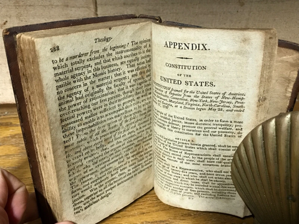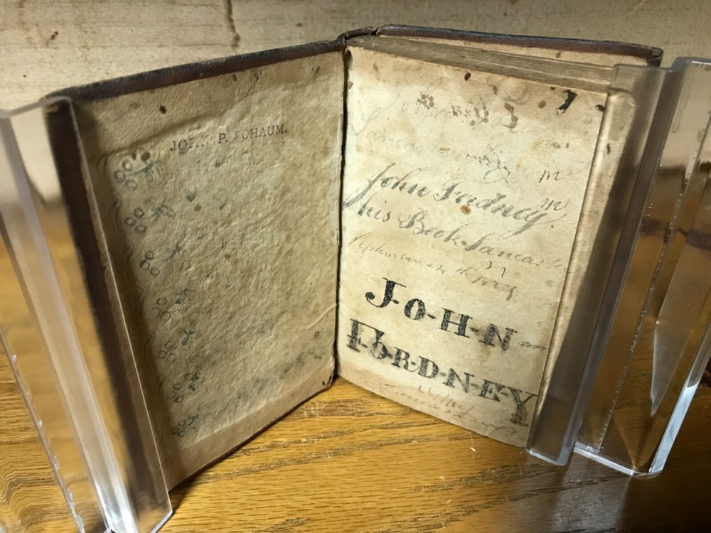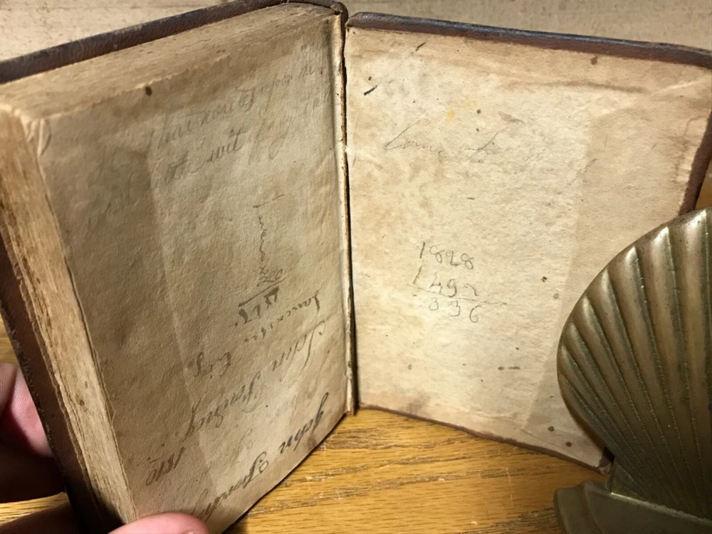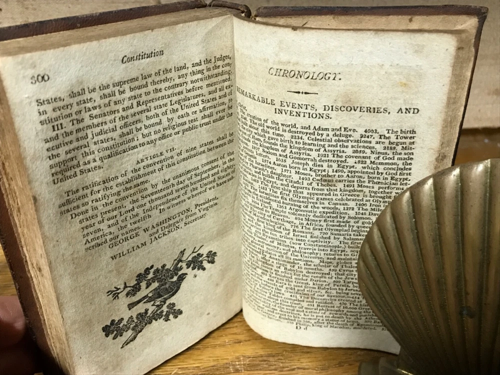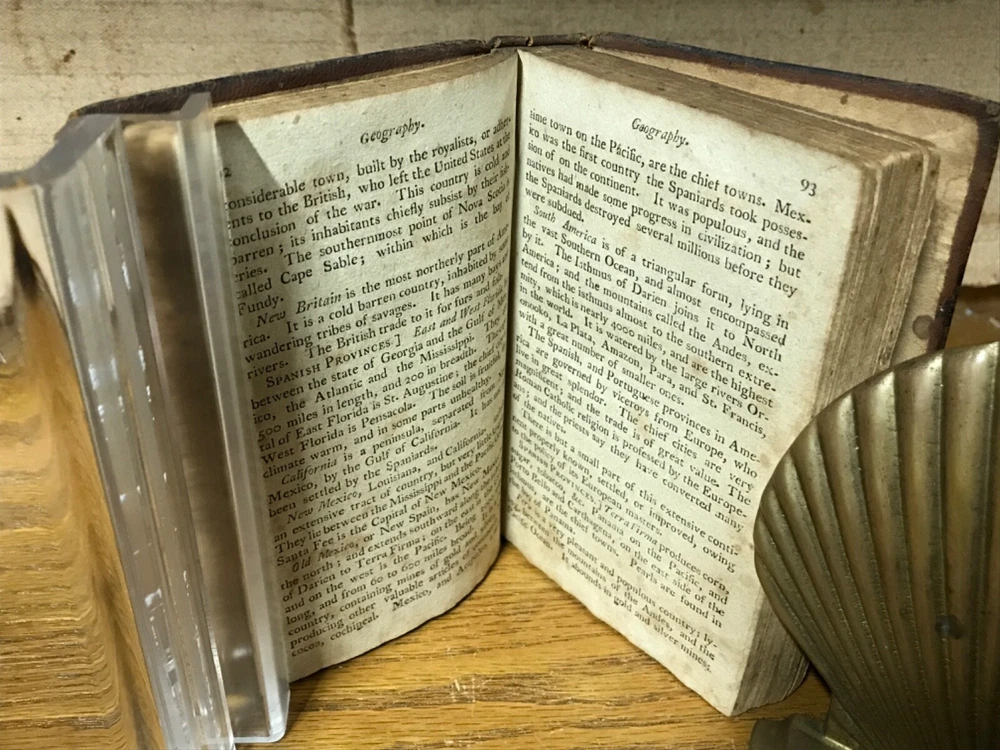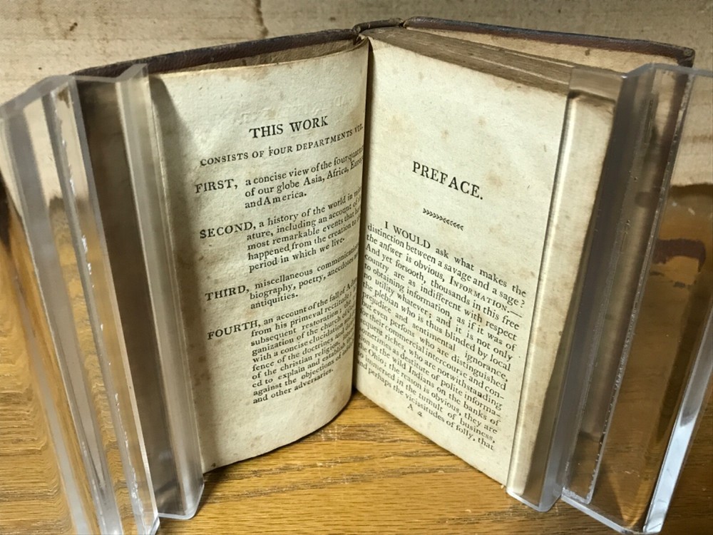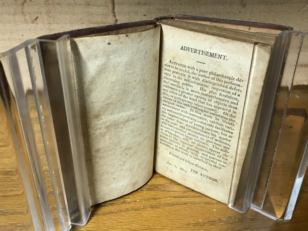 The Flowers of Literature. Being an Exhibition of the Most Interesting Geographical, Historical, Miscellaneous and Theological Subjects. A New Edition. by Thomas Branagan and printed in Philadelphia by Daniel Fenton. 1810, 324 pp, 5.75” x 4”, 8vo, hardcover full leather. As-is, with rubbing and wear to exterior. Light loss around edges and corners. Rear board almost entirely detached. Text block remains bound well. Markings and inscriptions to front and rear, including those of John Fordney and Jacob Fordney. Staining on pages 128 and 129. Includes wood-engraved frontispiece of the author by Alexander Anderson. General age-related toning to pages, along with periodic foxing and wear. Please see photographs and ask any questions prior to purchasing. A scarce encyclopedic piece by Thomas Branagan (1774-1843), an Irish-American writer and abolitionist. The Fordney family were prominent gunsmiths of Lancaster, Pennsylvania, with their rifles remaining valuable collector’s pieces. A wonderful piece for restoration. COLU1810ADFW-0524-aj1715