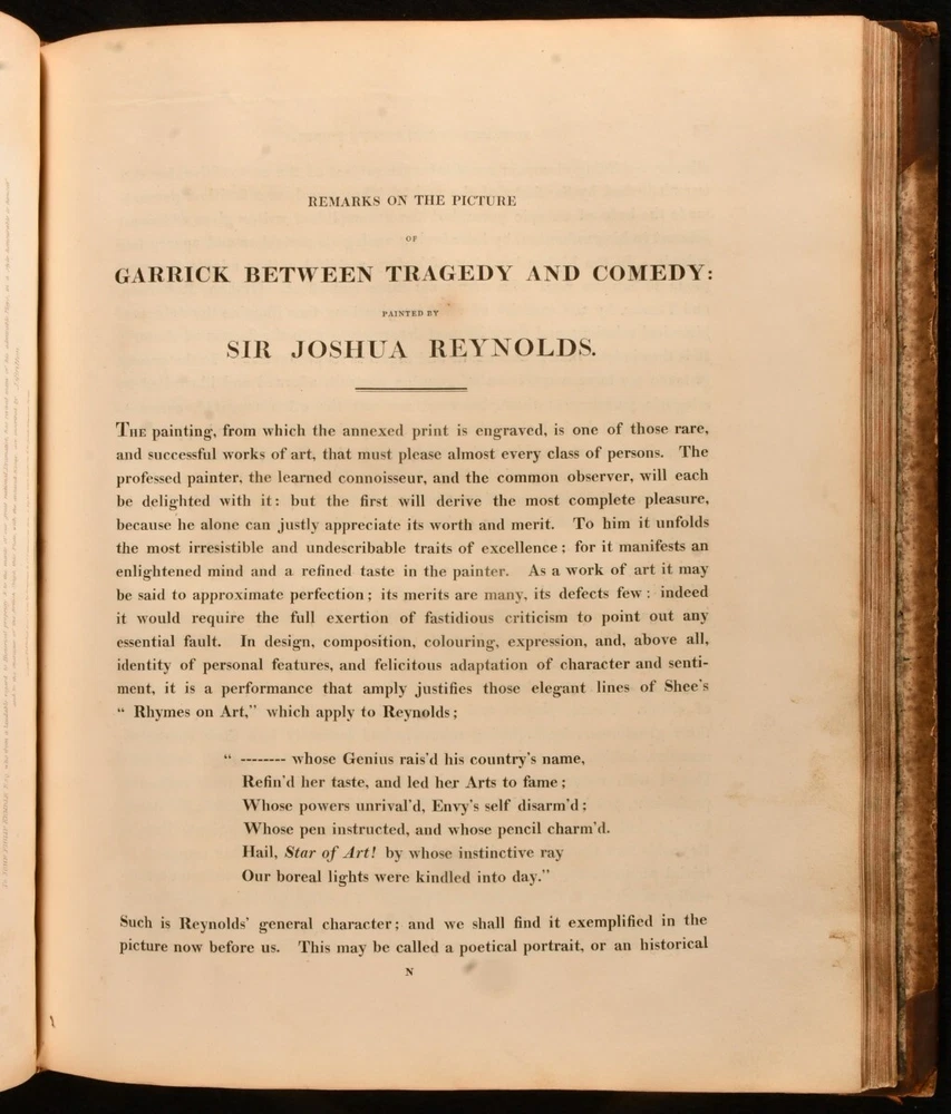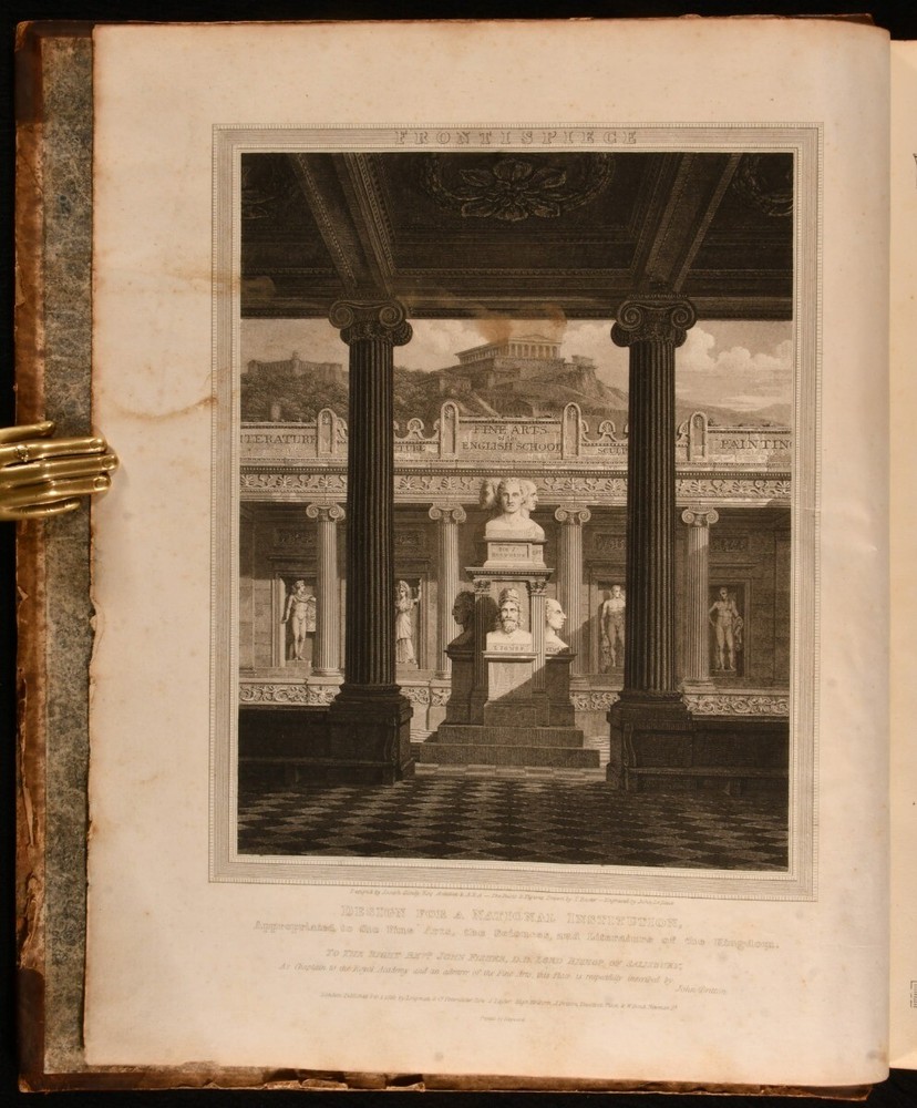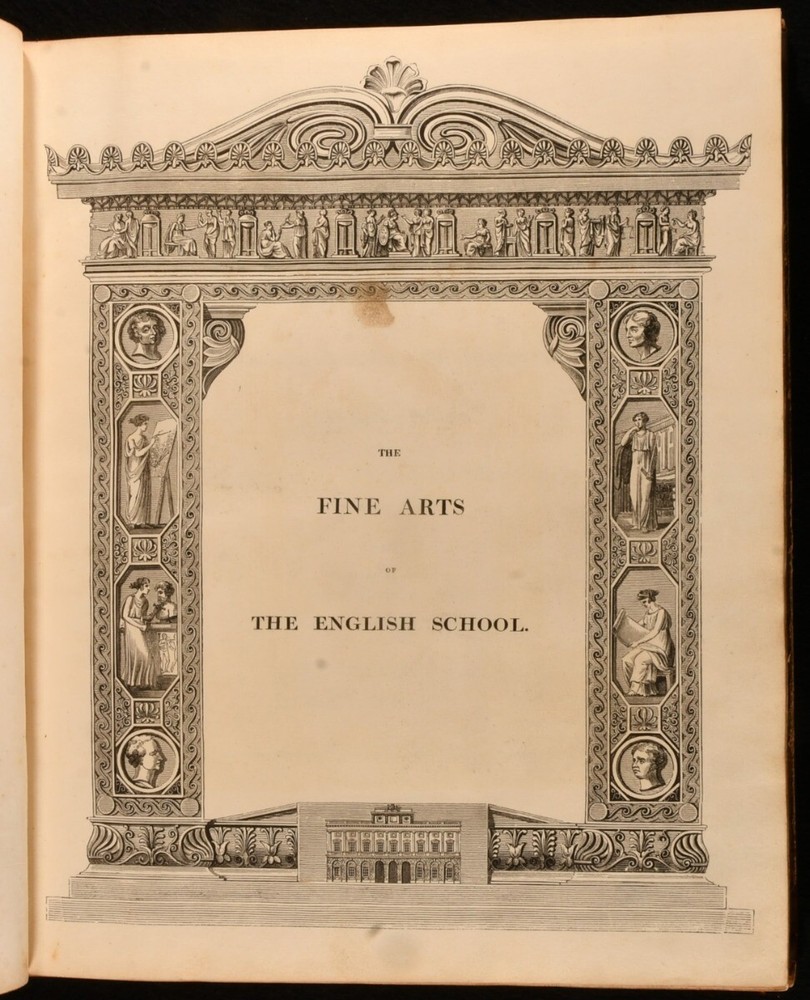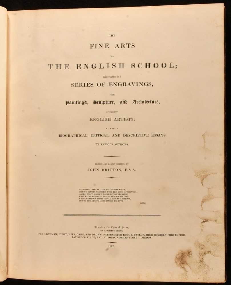 Click here to see our other books! The Fine Arts of the English School; Illustrated by a Series of Engravings from Paintings, Sculpture, and Architecture, of Eminent English Artists John Britton 1812 Printed at the Chiswick Press by C. Whittingham for Longman, Hurst et al : London 14" by 12" iv [1], 2-66 [1], 2-20 [1], 18-24 [1], 2-18pp SUMMARY The first edition of this collection of essays about English artists, edited by John Britton and illustrated with twenty-four plates. First Edition,Illustrated,Leather Binding,Scarce Overall Condition: Good This book weighs 3 KG when packed UK Postage: £ 3.99 US Postage: £ 36.99 EU Postage : £ 25.99 European Postage: £ 27.99 Asia Postage: £ 47.99 Worldwide Postage: £ 69.99 DESCRIPTION The scarce first edition of this impressively illustrated celebration of English achievements in fine arts, arranged and edited by the antiquarian John Britton. Illustrated with an engraved frontispiece and title page, and twenty-two further engraved plates. Collated, complete. With extensive biographical, critical and descriptive commentary on English works of art and artists, including a 'Biographical memoir of John Dunning, Lord Ashburton' by John Adolphus, ' A brief biographical memoir of George Romney, historical and portrait painter' by Thomas Phillips, ' A biographical memoir of John, Marquis of Granby' by John Mason Good, and ' A biographical memoir of Sir Joshua Reynolds'. Including engraved portrait plates of each of the aforementioned artists. With the inscription of C. R. Milmer, 1951, to a front blank. CONDITION In a half calf binding with paper covered boards. Front joint and tail of rear joint starting, with boards holding firm. Significant rubbing to joints and board perimeters, with small losses of leather to spine head and tail. Inscription to a front blank. Significant handling marks and residue to page and plate perimeters. Overall Condition: Good GLOSSARY OF TERMS Overall Condition (Dustwrapper condition rating is shown after that for the book itself, where a dustwrapper is present) Fine - Very well preserved copy showing very little wear Very Good Indeed - Only one or two minor faults, really a very attractive copy Very Good - Quite a wide term meaning no major faults but probably several smaller ones often expected given the age of the book, but still a respectable copy Good - Meaning not very good. Some more serious faults as will be described in the condition report under 'condition' Good Only - Meaning one or more faults that could really do with repair Fair - As with good only above but with other faults leaving a compromised copy even after repair Poor - Really bad and possibly seriously incomplete. We only sell books in this condition where their rarity or value makes them attractive none the less. Major defects will be described. GUARANTEE We offer a full money back guarantee on our descriptions. Please ask for details and conditions. We prefer PAYPAL. If you pay via PAYPAL we will post the item off the same or the next working day with the postage you have selected. Please note we cannot accept USD cheques