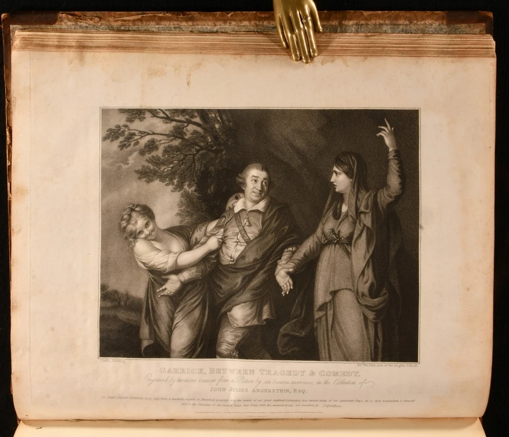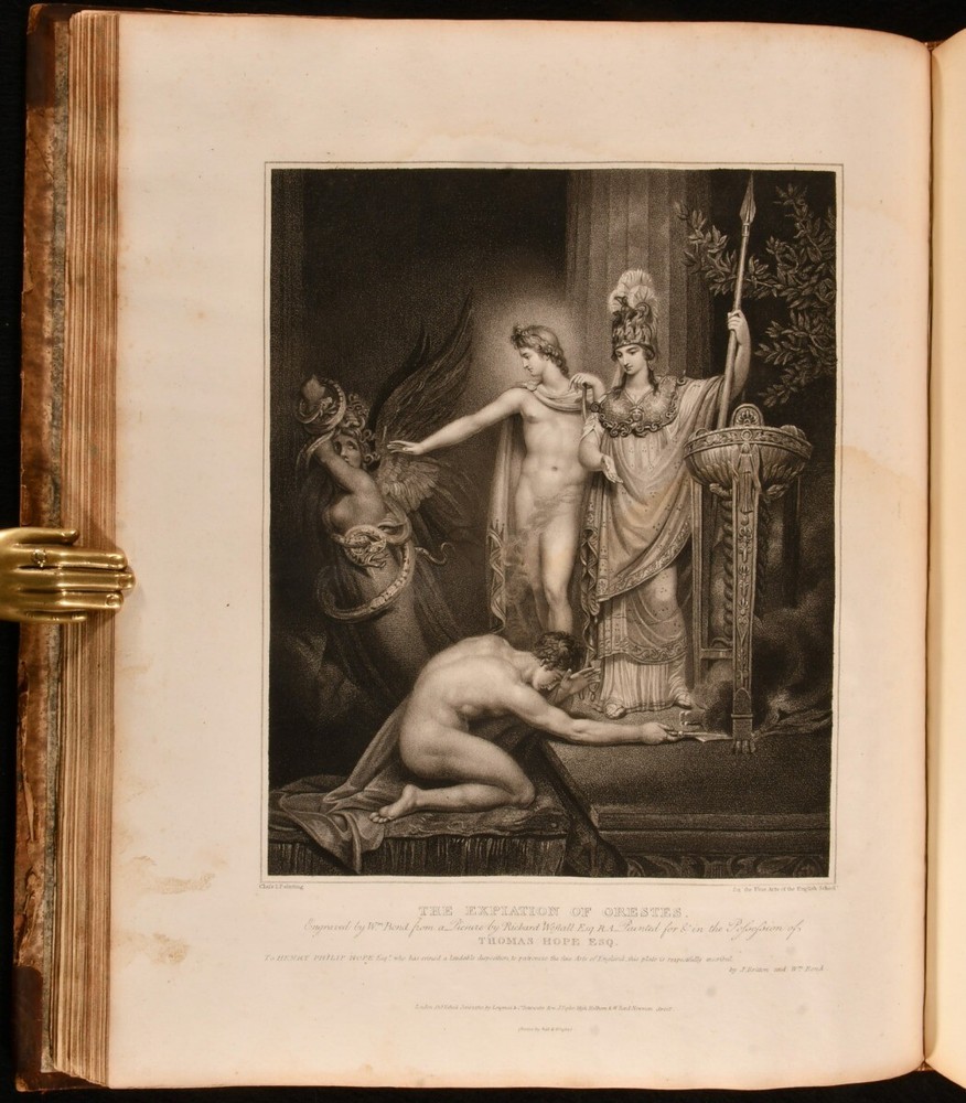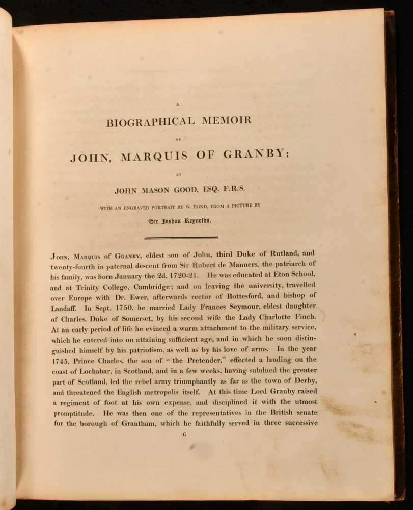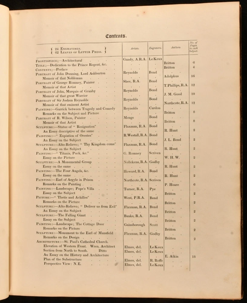 Click here to see our other books! The Fine Arts of the English School; Illustrated by a Series of Engravings from Paintings, Sculpture, and Architecture, of Eminent English Artists John Britton 1812 Printed at the Chiswick Press by C. Whittingham for Longman, Hurst et al : London 14" by 12" iv [1], 2-66 [1], 2-20 [1], 18-24 [1], 2-18pp SUMMARY The first edition of this collection of essays about English artists, edited by John Britton and illustrated with twenty-four plates. First Edition,Illustrated,Leather Binding,Scarce Overall Condition: Good This book weighs 3 KG when packed UK Postage: £ 3.99 US Postage: £ 36.99 EU Postage : £ 25.99 European Postage: £ 27.99 Asia Postage: £ 47.99 Worldwide Postage: £ 69.99 DESCRIPTION The scarce first edition of this impressively illustrated celebration of English achievements in fine arts, arranged and edited by the antiquarian John Britton. Illustrated with an engraved frontispiece and title page, and twenty-two further engraved plates. Collated, complete. With extensive biographical, critical and descriptive commentary on English works of art and artists, including a 'Biographical memoir of John Dunning, Lord Ashburton' by John Adolphus, ' A brief biographical memoir of George Romney, historical and portrait painter' by Thomas Phillips, ' A biographical memoir of John, Marquis of Granby' by John Mason Good, and ' A biographical memoir of Sir Joshua Reynolds'. Including engraved portrait plates of each of the aforementioned artists. With the inscription of C. R. Milmer, 1951, to a front blank. CONDITION In a half calf binding with paper covered boards. Front joint and tail of rear joint starting, with boards holding firm. Significant rubbing to joints and board perimeters, with small losses of leather to spine head and tail. Inscription to a front blank. Significant handling marks and residue to page and plate perimeters. Overall Condition: Good GLOSSARY OF TERMS Overall Condition (Dustwrapper condition rating is shown after that for the book itself, where a dustwrapper is present) Fine - Very well preserved copy showing very little wear Very Good Indeed - Only one or two minor faults, really a very attractive copy Very Good - Quite a wide term meaning no major faults but probably several smaller ones often expected given the age of the book, but still a respectable copy Good - Meaning not very good. Some more serious faults as will be described in the condition report under 'condition' Good Only - Meaning one or more faults that could really do with repair Fair - As with good only above but with other faults leaving a compromised copy even after repair Poor - Really bad and possibly seriously incomplete. We only sell books in this condition where their rarity or value makes them attractive none the less. Major defects will be described. GUARANTEE We offer a full money back guarantee on our descriptions. Please ask for details and conditions. We prefer PAYPAL. If you pay via PAYPAL we will post the item off the same or the next working day with the postage you have selected. Please note we cannot accept USD cheques