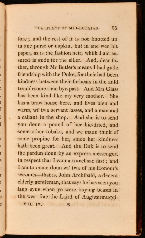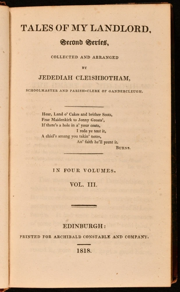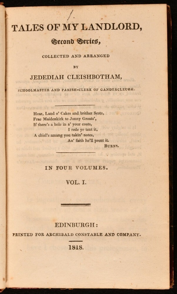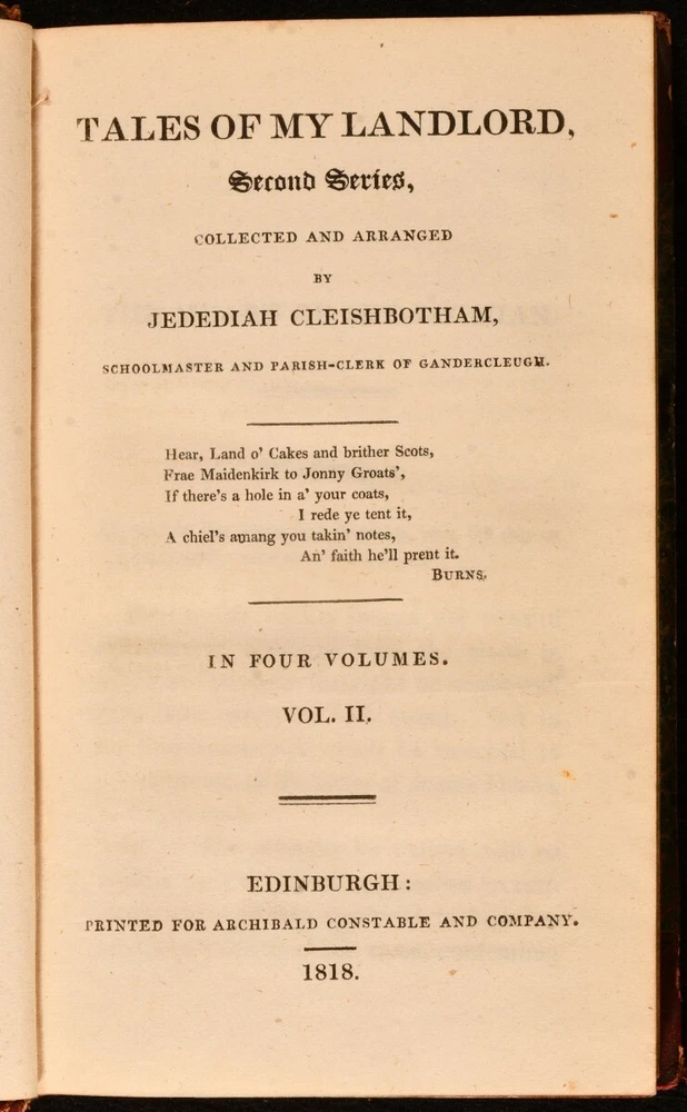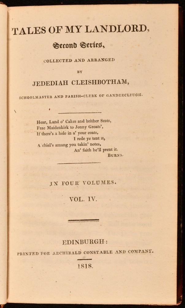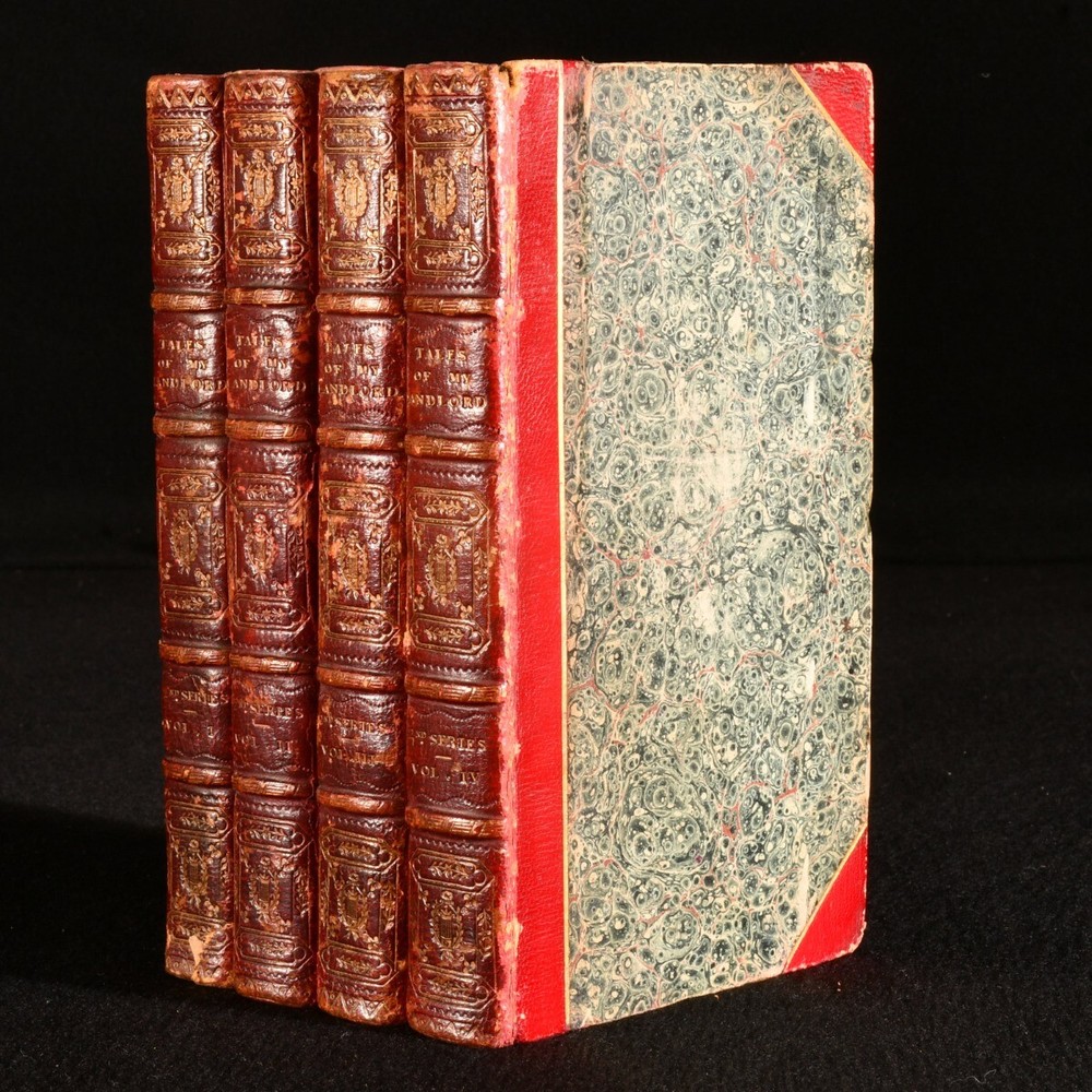Click here to see our other books! Tales of My Landlord, Second Series [The Heart of Midlothian] Jedediah Cleishbotham [Sir Walter Scott] 1818 Archibald Constable : Edinburgh 7.5" by 4.5" 2-333; 322; 328; 375pp SUMMARY The four volume first edition of Sir Walter Scott's novel 'The Heart of Midlothian', the second work in his 'Tales of My Landlord' series. First Edition,Leather Binding Overall Condition: Very Good This book weighs 1.5 KG when packed UK Postage: £ 3.99 US Postage: £ 23.99 EU Postage : £ 18.99 European Postage: £ 19.99 Asia Postage: £ 31.99 Worldwide Postage: £ 32.99 DESCRIPTION The first edition, first issue: lacking signature on dedication leaf of volume I; with the misspelling 'Wichtcraft' to volume II, page 52; with page 348 of volume IV miss numbered as 438. The second series of 'Tales of My Landlord', this work can also be viewed as the seventh of Scott's Waverly novels. Set between 1736 and 1736, the plot of the work is set into motion by the Porteous Riots in Edinburgh, and involves a working class Edinburgh girl's travels to London, to obtain a royal commutation of the death penalty incurred by her sister. Bound without half titles. With the armorial bookplate of Nathanael Ellison to front pastedowns, and an engraved plate pasted to the front free endpaper of each volume. CONDITION In half morocco bindings, with marbled paper covered boards. Discolouration to back strips, with rubbing to spine heads and tails, and joints. With both hinges of volumes I and IV, and the front hinge of volume III strained, but firmly held. Internally, firmly bound. Light spotting to title pages, with pages generally clean and bright. Overall Condition: Very Good GLOSSARY OF TERMS Overall Condition (Dustwrapper condition rating is shown after that for the book itself, where a dustwrapper is present) Fine - Very well preserved copy showing very little wear Very Good Indeed - Only one or two minor faults, really a very attractive copy Very Good - Quite a wide term meaning no major faults but probably several smaller ones often expected given the age of the book, but still a respectable copy Good - Meaning not very good. Some more serious faults as will be described in the condition report under 'condition' Good Only - Meaning one or more faults that could really do with repair Fair - As with good only above but with other faults leaving a compromised copy even after repair Poor - Really bad and possibly seriously incomplete. We only sell books in this condition where their rarity or value makes them attractive none the less. Major defects will be described. GUARANTEE We offer a full money back guarantee on our descriptions. Please ask for details and conditions. We prefer PAYPAL. If you pay via PAYPAL we will post the item off the same or the next working day with the postage you have selected. Please note we cannot accept USD cheques