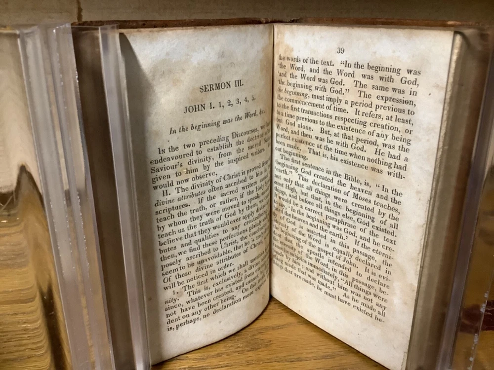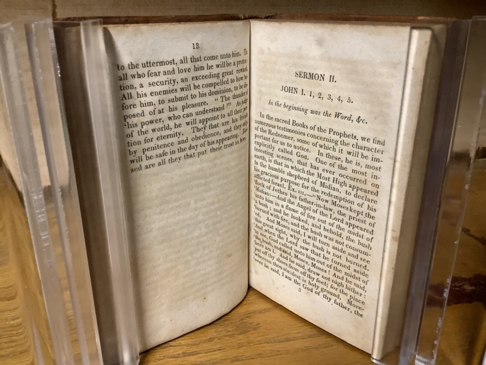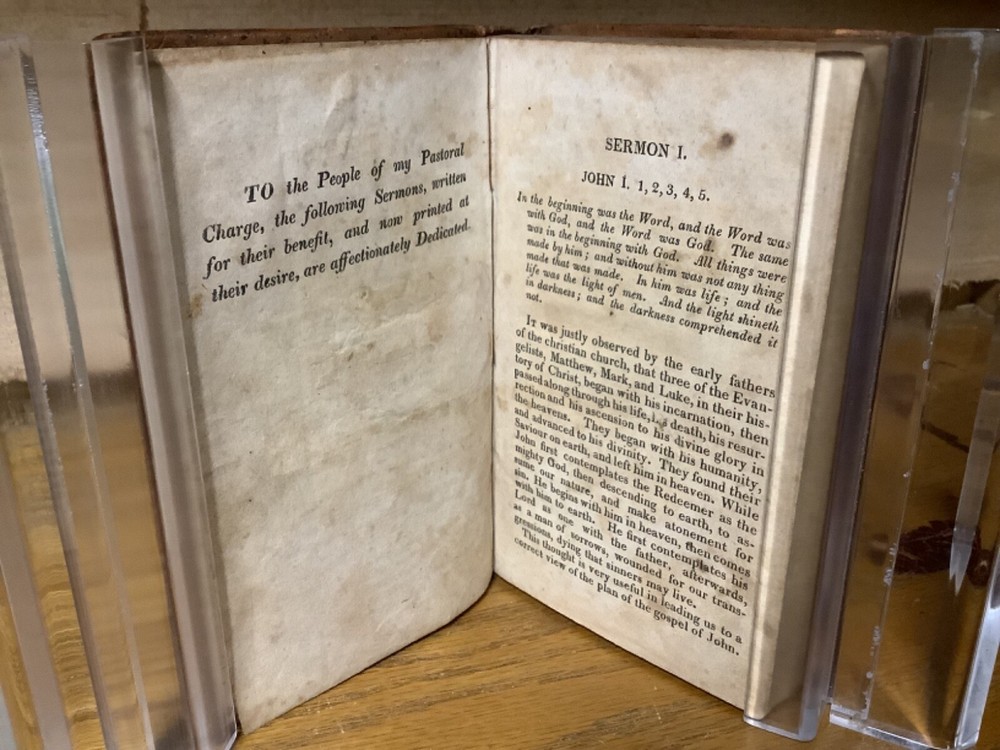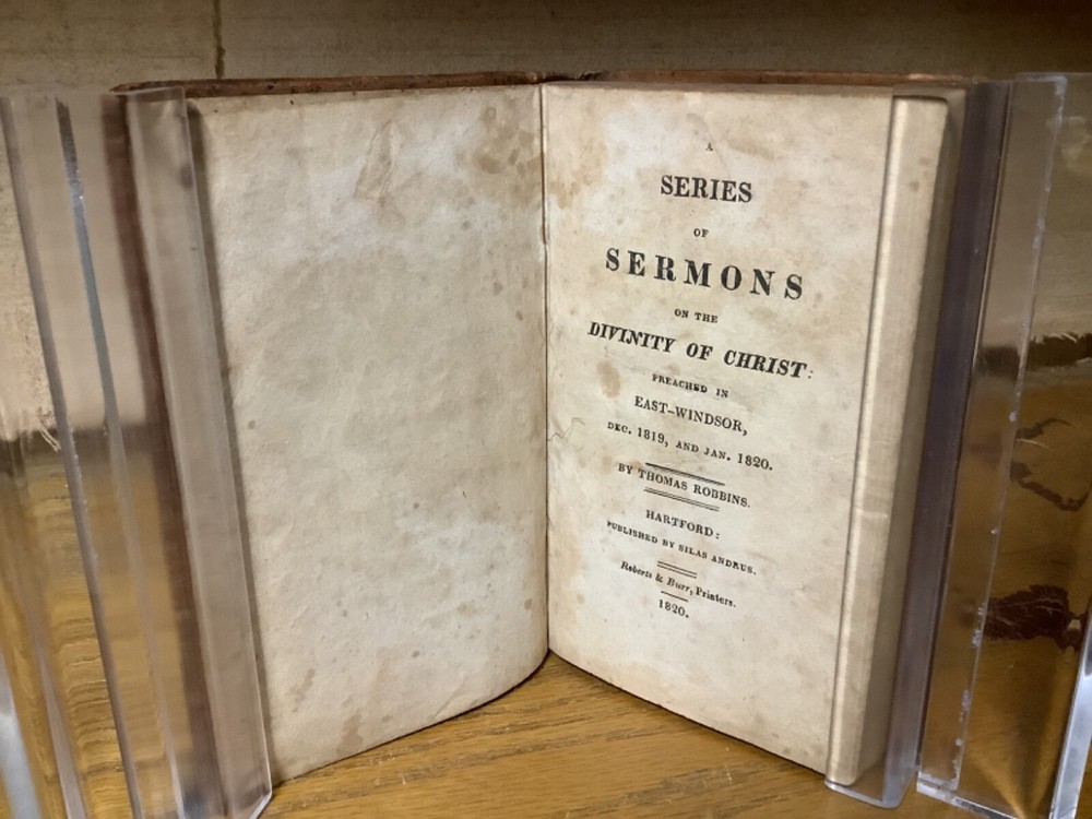 A Series of Sermons on the Divinity of Christ: Preached in East-Windsor, Dec. 1819 and Jan. 1820. By Thomas Robbins and printed in Hartford by Silas Andrus. 1820, 172 pp 6” x 3.75”, 12mo, hardcover full leather. In good condition, with superficial rubbing and wear to leather on boards. Some loss to label on spine. Hinges remain in good condition with minor wear and text block remains bound well. Light marginalia remnants at front of book. Tear and loss to part of last end page. General age-related toning to pages, along with periodic foxing and wear. Please see photographs and ask any questions prior to purchasing. A rather scarce piece with no other known comparables for sale. By Thomas Robbins (1777-1856), an American Congregationalist minister and theologian who served as the first Librarian of the Connecticut Historical Society. COLR1820BLMG-0224-aj1040