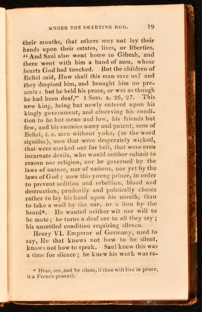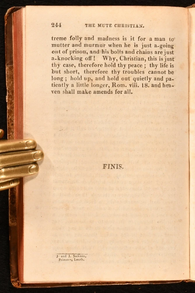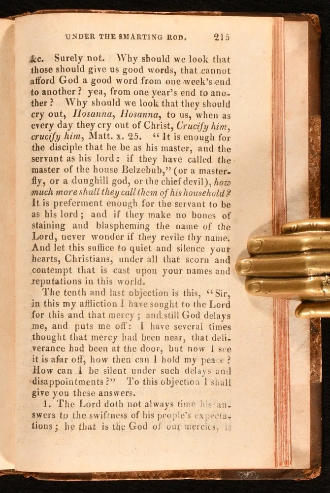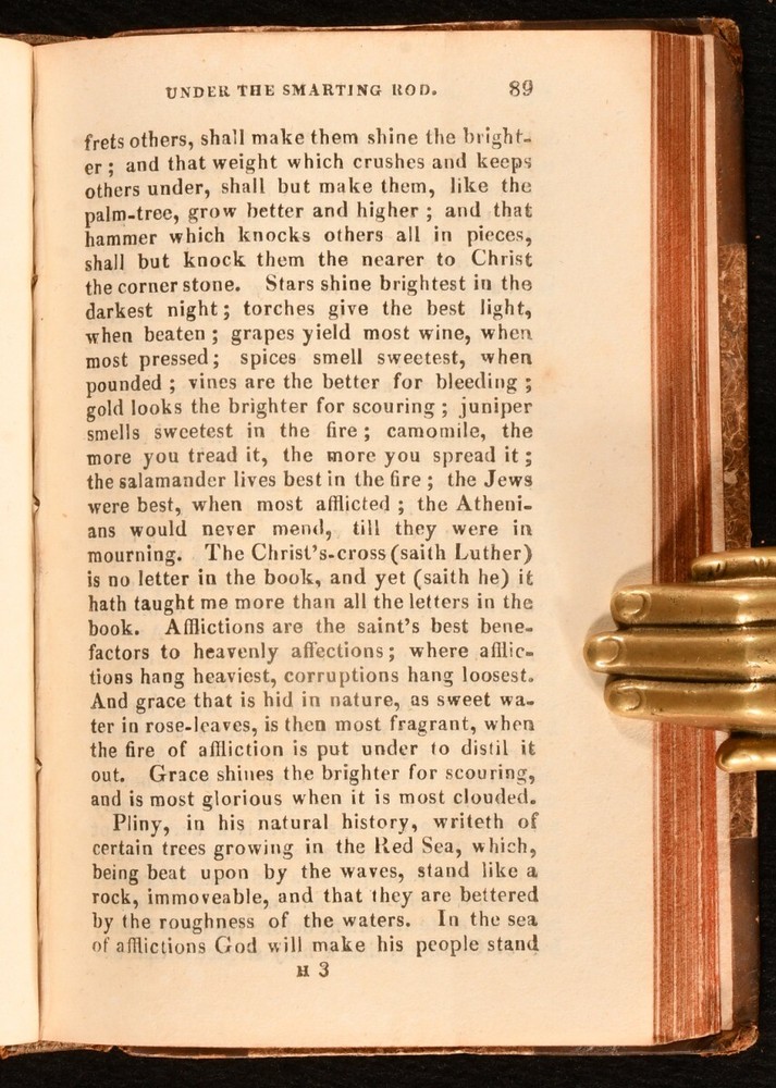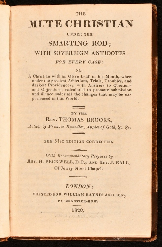Click here to see our other books! The Mute Christian Under the Smarting Rod; With Sovereign Antidotes for Every Case Rev. Thomas Brooks 1820 William Baynes : London 6" by 4" viii [1], 2-244pp SUMMARY The fifty-first edition of English non-conformist Puritan preacher Thomas Brooks's work. Leather Binding,Scarce Overall Condition: Very Good This book weighs 0.5 KG when packed UK Postage: £ 3.99 US Postage: £ 15.99 EU Postage : £ 13.99 European Postage: £ 14.99 Asia Postage: £ 18.99 Worldwide Postage: £ 19.99 DESCRIPTION The fifty-first edition of this work of religious and moral guidance, scarce in all editions. Brooks (1608-1680) published a number of religious treatises, though relatively little is known about him. He was chosen to preach before the House of Commons in December 1648. In this work, Brooks presents a series of moral questions that a Christian may ask, and offers his responses. Baptist preacher C.H. Spurgeon wrote of Brooks, 'Brooks scatters stars with both hands, with an eagle eye of faith as well as the eagle eye of imagination'. 'Retaining the original half title. With a former owner's blind stamp to the half title. CONDITION In a half calf binding, with marbled paper covered boards. Rubbing to centre of boards and joints, otherwise externally smart. Front hinge lightly strained but firmly held. Lacking front free endpaper. Internally, firmly bound. Blind stamp to half title. Pages lightly age toned, but generally clean. Overall Condition: Very Good GLOSSARY OF TERMS Overall Condition (Dustwrapper condition rating is shown after that for the book itself, where a dustwrapper is present) Fine - Very well preserved copy showing very little wear Very Good Indeed - Only one or two minor faults, really a very attractive copy Very Good - Quite a wide term meaning no major faults but probably several smaller ones often expected given the age of the book, but still a respectable copy Good - Meaning not very good. Some more serious faults as will be described in the condition report under 'condition' Good Only - Meaning one or more faults that could really do with repair Fair - As with good only above but with other faults leaving a compromised copy even after repair Poor - Really bad and possibly seriously incomplete. We only sell books in this condition where their rarity or value makes them attractive none the less. Major defects will be described. GUARANTEE We offer a full money back guarantee on our descriptions. Please ask for details and conditions. We prefer PAYPAL. If you pay via PAYPAL we will post the item off the same or the next working day with the postage you have selected. Please note we cannot accept USD cheques