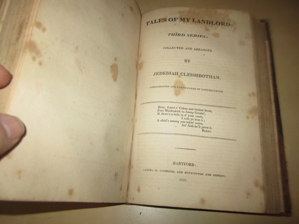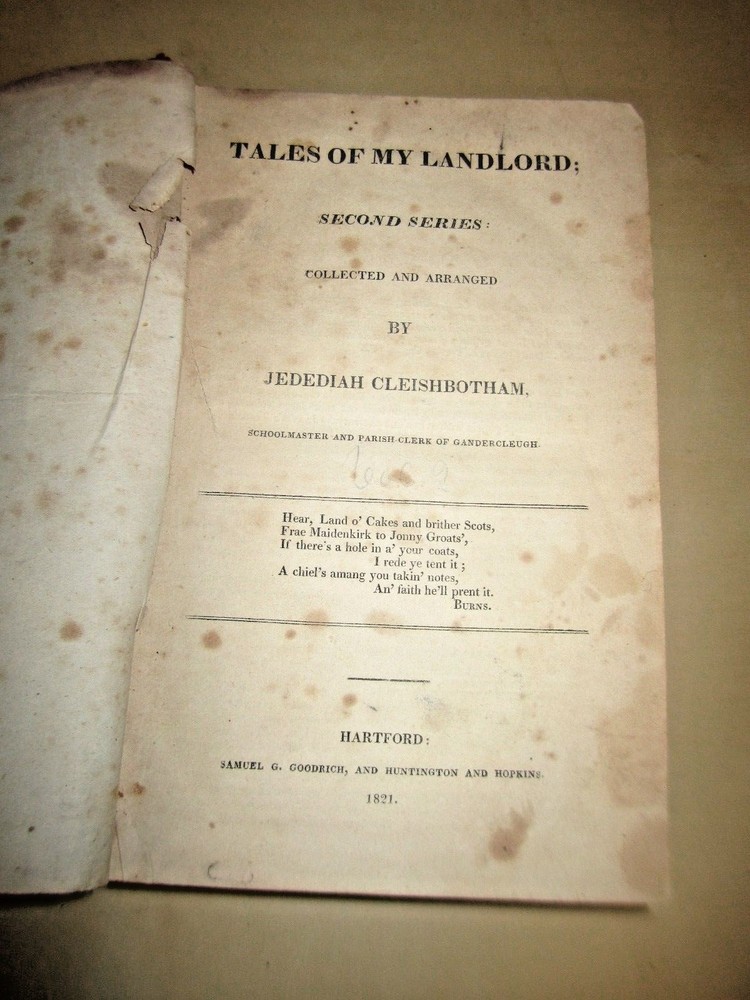 If you are using the Ebay APP and do not see the "Condition Description", please go to the "About this Item" section and hit the arrow to the right. This will lead you to the "Condition Description". Thank you! 1821 Sir Walter Scott: Tales of My Landlord, series 2 and part of 3 (The Bride of Lammermoor ), vol in 1 GoodrichTALES OF MY LANDLORD; 2nd and part of 3rd series: (The Bride of Lammermoor ). series: Collected and arranged by Jedediah Cleishbotham, schoolmaster and Parish Clerk of Gandercleugh [pseudonym]SCOTT, Sir Walter.Published by Goodrich, and Huntington and Hopkins, Hartford, 1821. 333 and 203pp. At some point Ebay had a bug in their system, resulting in many of my items to lose their photos. Unfortunately, I have too many items to replace all the lost photos. If you are interested in an item that is lacking multiple photos, let me know and I will do my best to provide you with additional images.