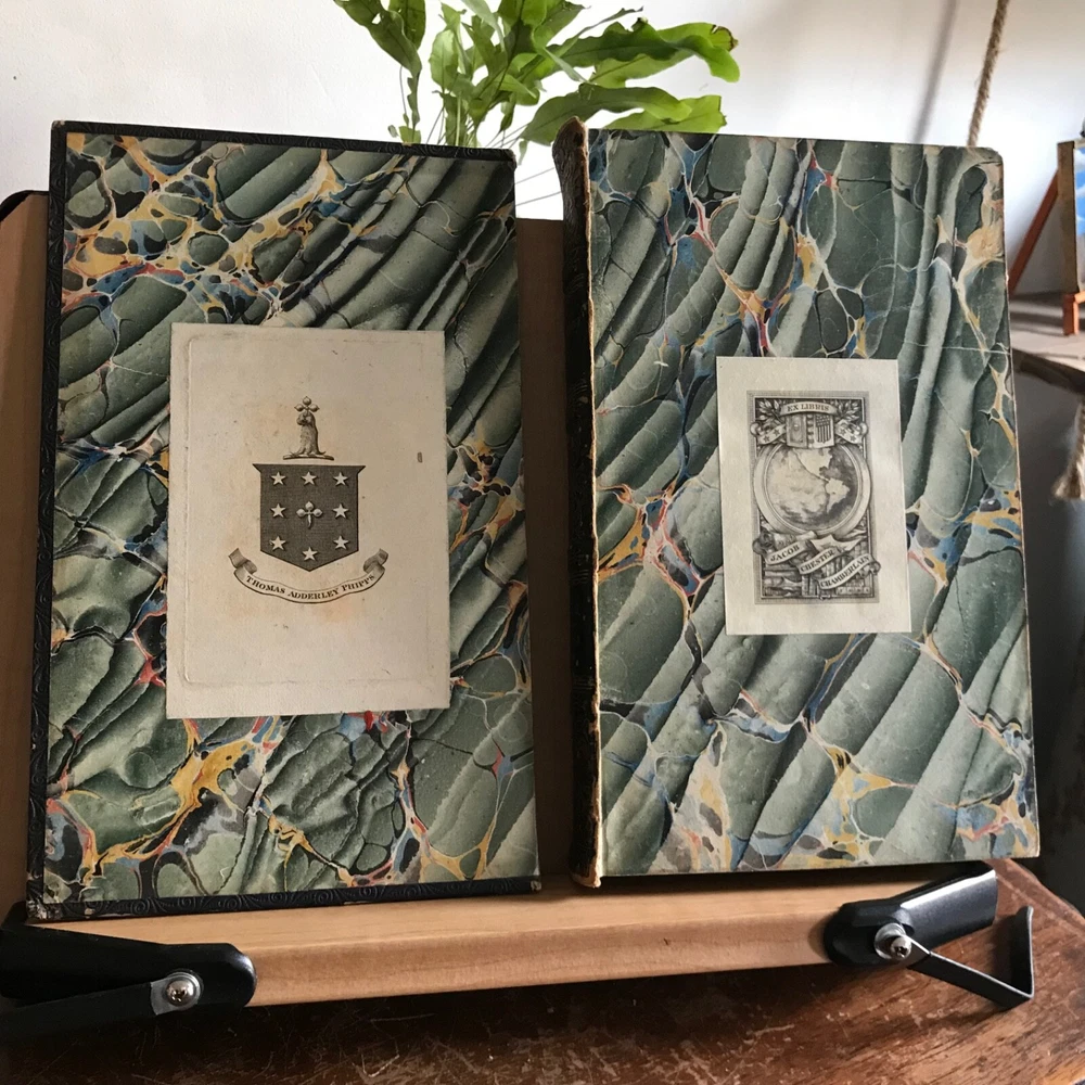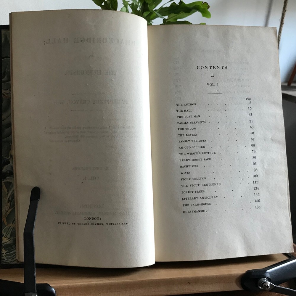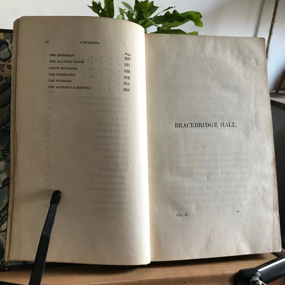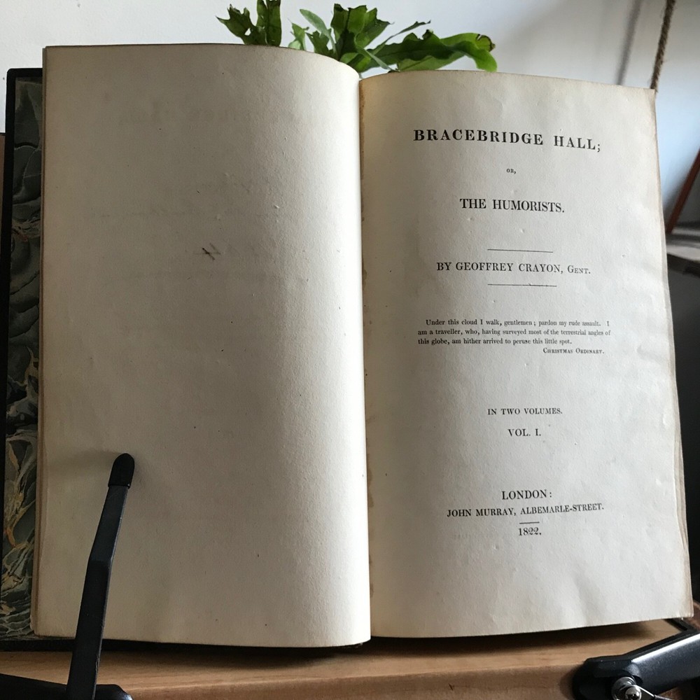 Bracebridge Hall; Or, The Humorists, Geoffrey Crayon, John Murray, London, 1822, Complete in Two Volumes, full leather, 8.75 x 5.5”, 8vo. In fair condition. Front board of volume one is detached. Moderate wear to extremities with dryness and scuffing. Corners and extremes rubbed. Nicely bound overall. Marbled end papers with armorial bookplates on front pastedowns. Other owner bookplates on flyleaves. Old hand ownership on front flyleaf. Interiors are lightly toned with a few instances of spotting. Free of known markings. Bindings intact. Please see photos. The first U.K. Edition of Washington Irving’s Bracebridge Hall. The first edition second state with 404 pages to volume II. This was first written in 1821 whilst Irving was living in England. The novel is an inter-twining of individual sketches and tales based on the occupants of an English manor with the same name as the title. It is based on Aston Hall near Birmingham, which was occupied by members of the Bracebridge family Irving often visited. COLL1822CFGM-FORN-TUB0004 02/24HK