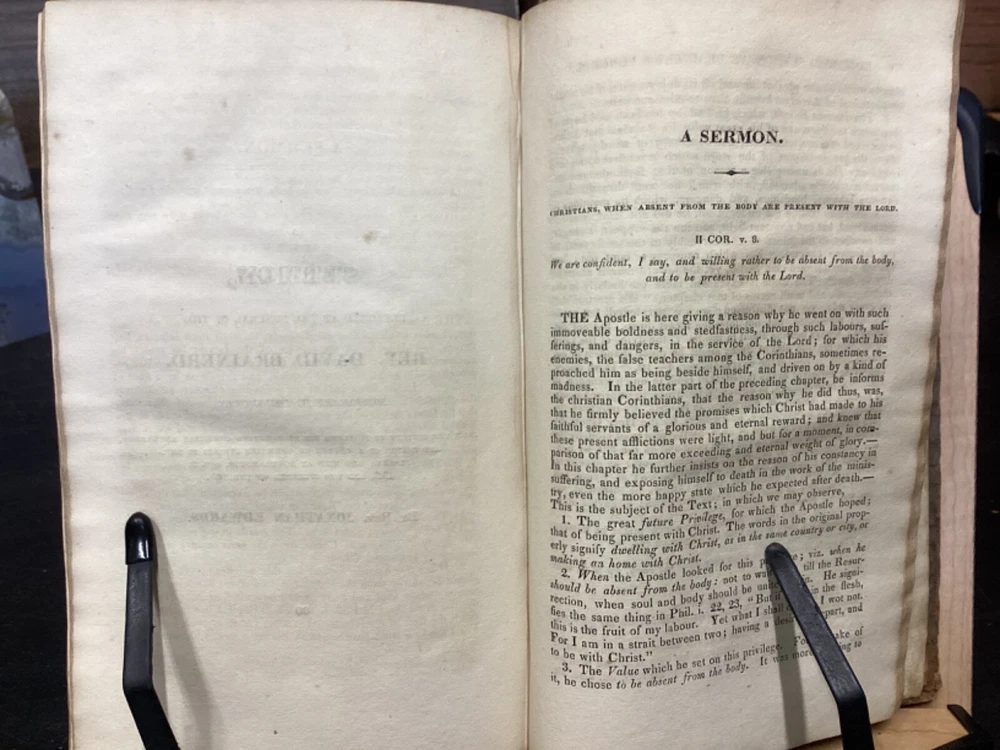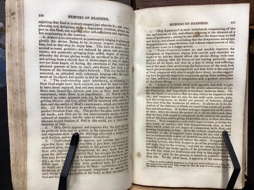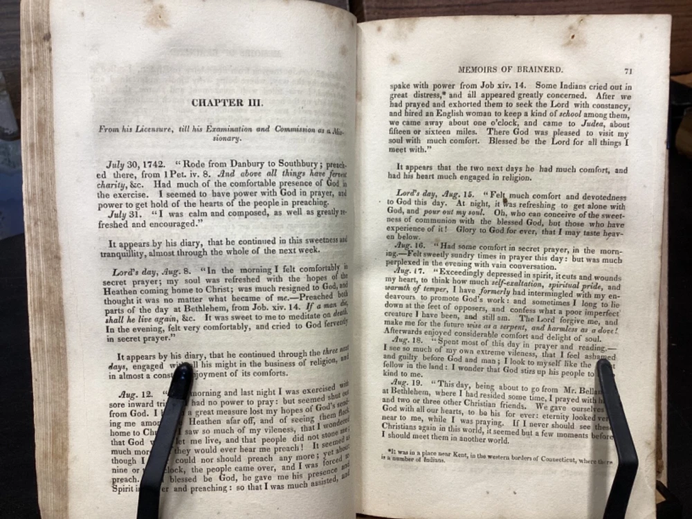 Memoirs of the Rev. David Brainerd; Missionary to the Indians on the Borders of New York, New Jersey, and Pennsylvania: Chiefly Taken from His Own Diary, by Rev. Jonathan Edwards, of Northampton, Including His Journal, Now for the First Time Incorporated with the Rest of His Diary, in a Regular Chronological Series, by Sereno Edwards Dwight, S. Converse, New Haven, 1822, 507pp, leather, 5.5 x 8.5", 12mo Poor condition/as is. Front and rear boards are cracked and chipped; redrot. Significant bumping to tips. Cracking and chipping spine with exposed binding at headcap and tail; illegible. Rear hinge and joint are cracked. Toning, age-staining, and foxing throughout textblock. Binding is fragile. Please see photos and ask any questions prior to purchase. David Brainerd (April 20, 1718 - October 9, 1747) was an American Presbyterian minister and missionary to the Native Americans among the Delaware Indians of New Jersey. Missionaries such as William Carey and Jim Elliot, and Brainerd's cousin, the Second Great Awakening evangelist James Brainerd Taylor (1801-1829) cit Brainerd as inspiration. FORN-MSB-0324-TUB0015-JC362