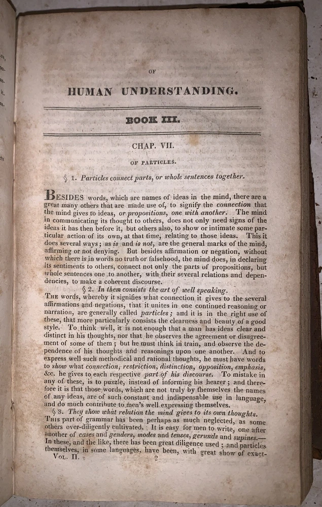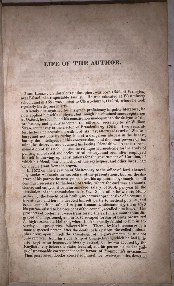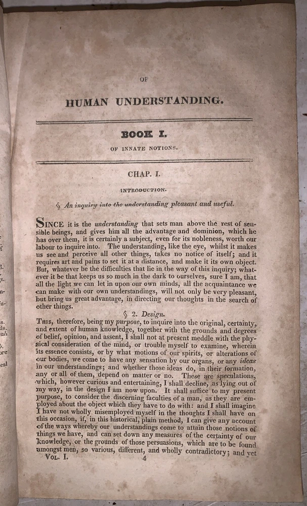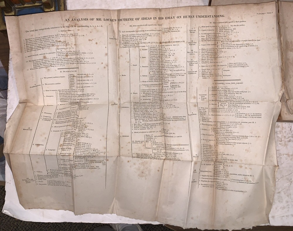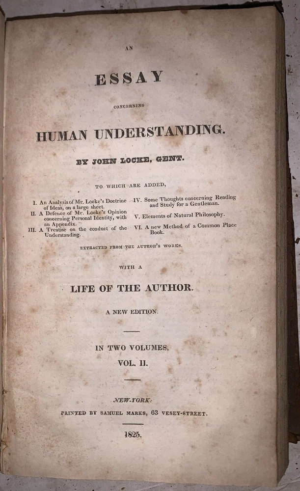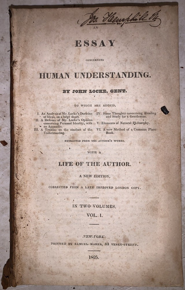 An Essay Concerning Human Understanding by John Locke, Gent. To which are now added, I. An Analysis of Mr. Locke's Doctrine of Ideas, on a large sheet. II. A Defence of Mr. Locke's Opinion concerning Personal Identity, with an Appendix. III. A Treatise on the conduct of hte Understanding. IV. Some Thought concerning Reading and Study for a Gentleman. V. Elements of Natural Philossophy. VI. A new Method of Common Place Book. Extracted from the Author's Works. With a Life of the Author. A New Edition, Corrected from a Late Improved London Copy. In Two Volumes (Both volumes bound in one) New York: Samuel Marks 1825 Octavo, 327, 314 pages, bound in period fulll leather. Both boards and fold out chart detached, lacks backstrip, it appears that this book was in a fire, leather deteriorating, previous owner's inscription, rubbing and wear, discoloration, else in good condition. This auction has no reserve, an opening bid of only $0.01, and free shipping. If you have any questions, feel free to ask, and don't forget to check out my other listings.