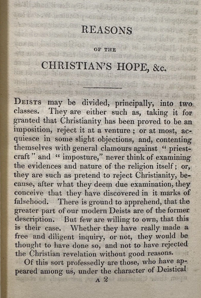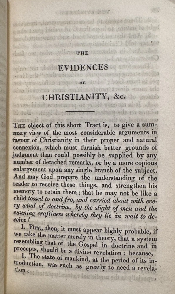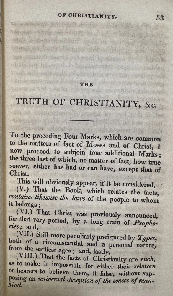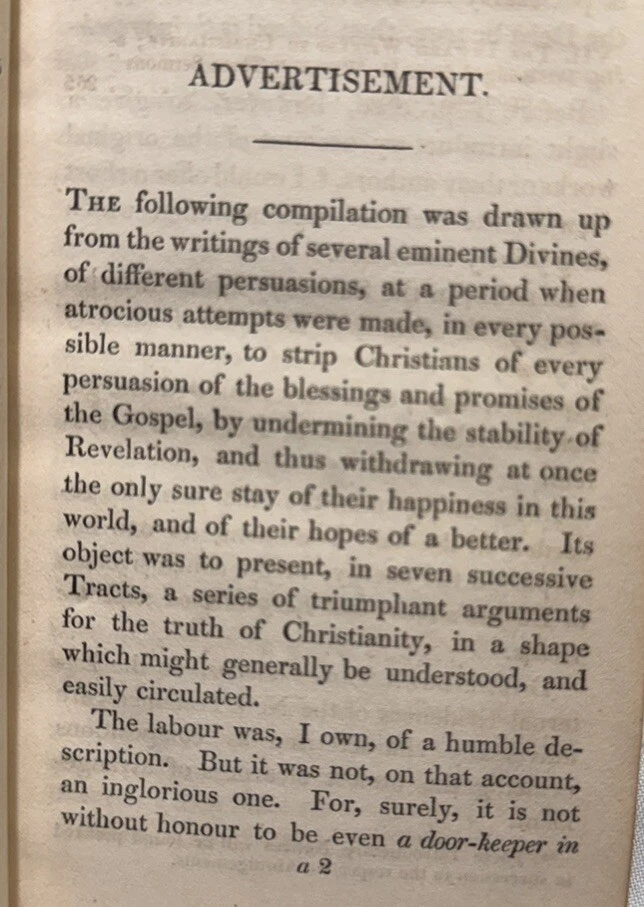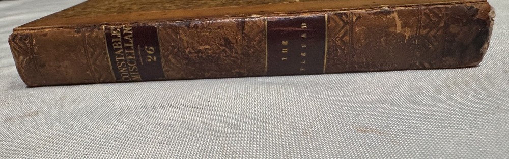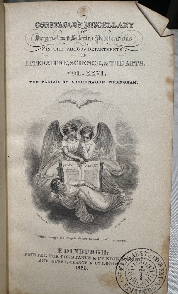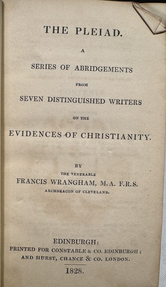 The Pleiad: A Series of Abridgments From Seven Distinguished Writers On the Evidences of Christianity (edited) by Francis Wragham, Archdeacon of Cleveland OVERALL CONDITION: GOOD Published by Constable and Co. in 1828 in Edinburgh as part of its “Constable’s Miscellany” series which featured original and selected publications from science, literature, and the arts. The volumes were published over the course of six years. This is volume 26 out of 80 and is a first edition thus compilation of abridged writings and sermons on evidence for Christianity. In contemporary 1/2 leather over mottled paper. Two gilt-lettered spine labels. Blind-stamped bordering. All edges speckled. Vignette title page. Octavo, 5.75” x 3.75”, vii; 300 pp. Collated and complete including ads. Provenance: Bishop Jacob of Limyren in Scotland and St. Margaret Convent in Edinburgh, Scotland The book is in GOOD antiquarian condition for being in boards nearly 200-years-old. Rubbing and cracking of both joints. Rubbed extremities and spine. Chipping of spine labels. Square spine, weakening hinges. Foxing to endpapers and first few and last few pages of book. The occasional spot of foxing or smudge but most of the text is quite clean and bright. Offsetting from vignette title page. Half a dozen bent corners and indentation to upper right corner of much of the text block. Former owner bookplate on front pastedown and stamp of St. Margaret Convent on vignette title page. As a fellow book collector, I know how frustrating it can be when items aren’t accurately described or poorly packaged for shipping. That is why I (1) take a lot of pictures and try to describe condition issues as accurately as possible and (2) pack your book purchases with the utmost care before shipping. I have been selling and buying on eBay for over 10 years and have a 100% satisfaction rating, and offer a 100% satisfaction guarantee 30-day return policy. Please follow me as I have thousands of highly collectible books to list in the coming weeks and months!