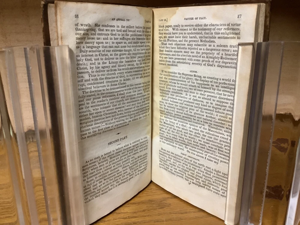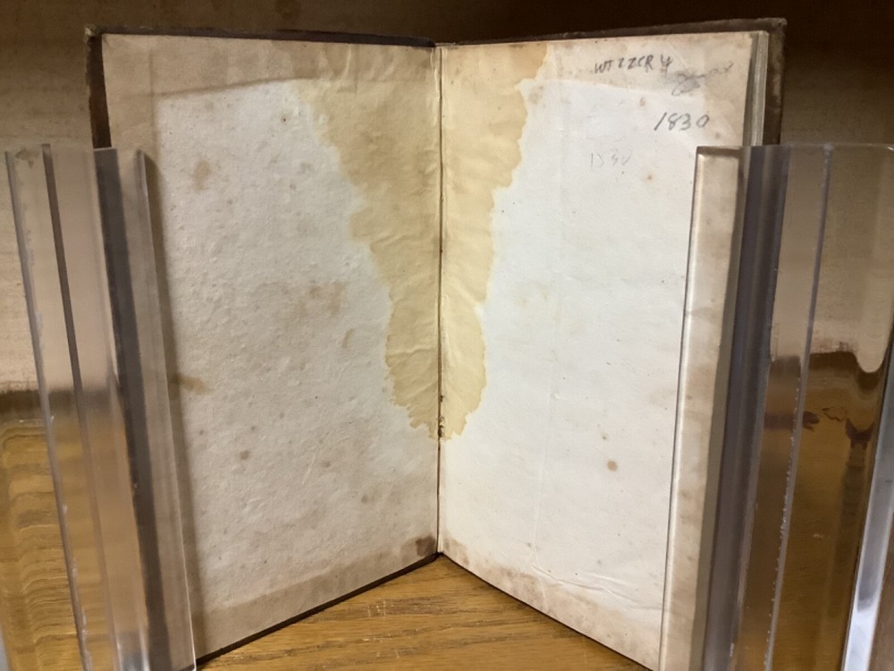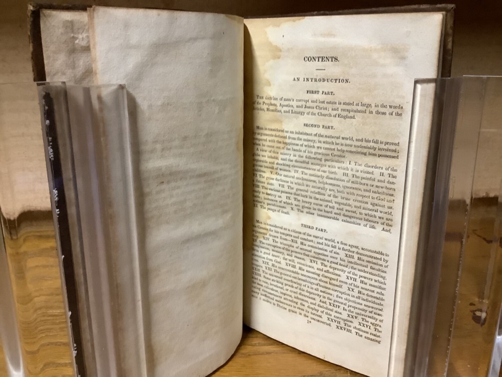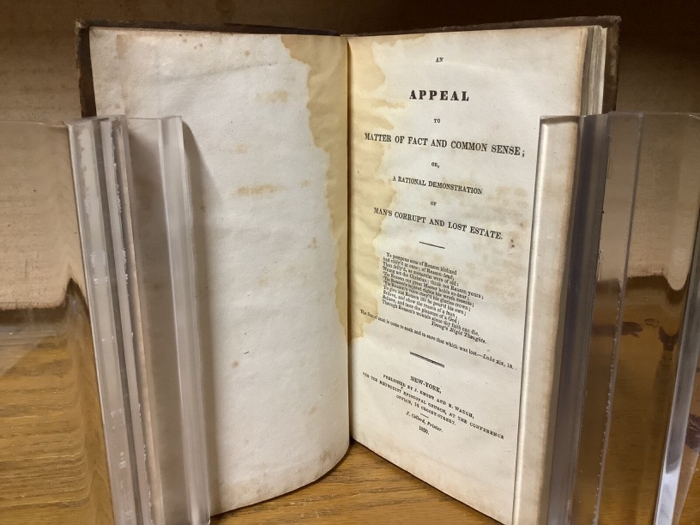 An Appeal to Matter of Fact and Common Sense; Or, A Rational Demonstration of Man’s Corrupt and Lost Estate. By John Fletcher and printed in New York City by J. Emory and B. Waugh for the Methodist Episcopal Church. 1830, 165 pp, 7” x 4.25”, 8vo, hardcover full leather. In good condition, with staining to boards and part of spine. Hinges remain in good condition and text block remains bound well. Staining down middle of pages, primarily within first half of text block. Light markings and marginalia. General age-related toning to pages, along with periodic foxing and wear. Please see photographs and ask any questions prior to purchasing. A later printing of a religious piece by John William Fletcher (1729-1785, here spelled with the original spelling of “Fletchere”), a Swiss-born English theologian and close associate of John Wesley in the early days of Methodist theology. COLR1830BBCG 0224-aj1094
